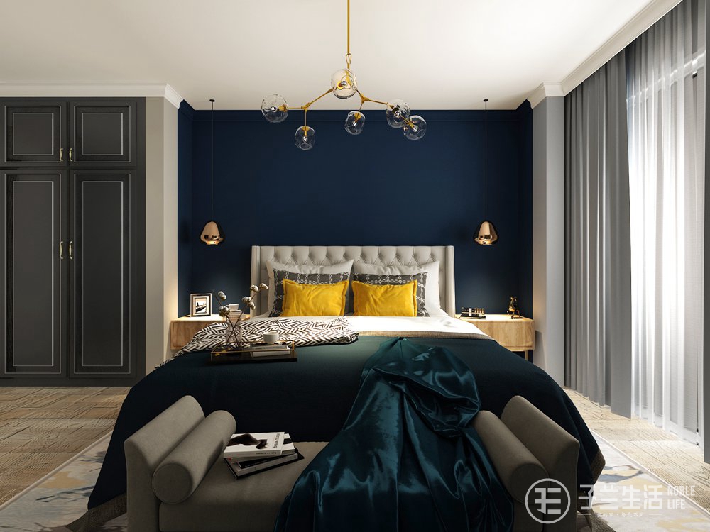 背景墻以藏青穩(wěn)重而不顯得過分老成來搭配,配以床尾的亞麻尾凳,帶著一絲藝術氣質,讓私密的臥室空間優(yōu)雅中更顯矜貴。
