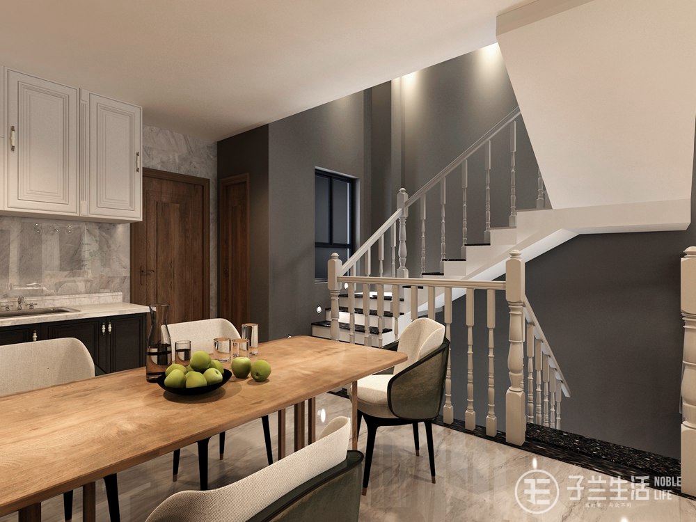 對于客廳原本的尺寸,設計師將原本的廚房進行了改動,和樓梯位置對調在視覺上增加了空間的效果,同時也加大了廚房空間布局,并設計了餐廚一體的空間,使得整個廚房空間得到質的飛躍。