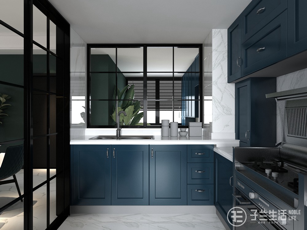 在通透的廚房設計當中,靜謐的藍色是業(yè)主的最愛,也讓本是充滿煙火氣息的廚房表現(xiàn)出一種美麗、文靜、 與潔凈。