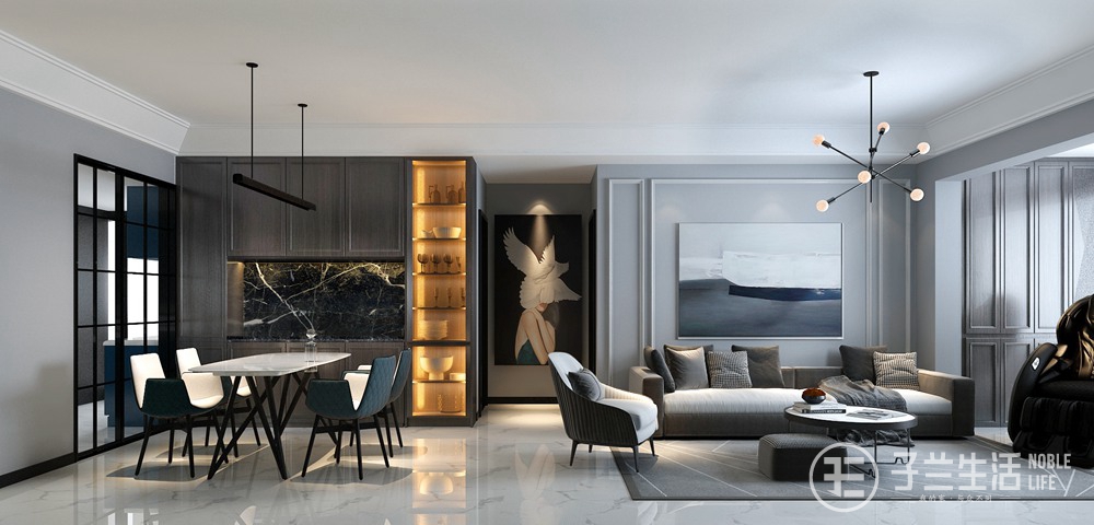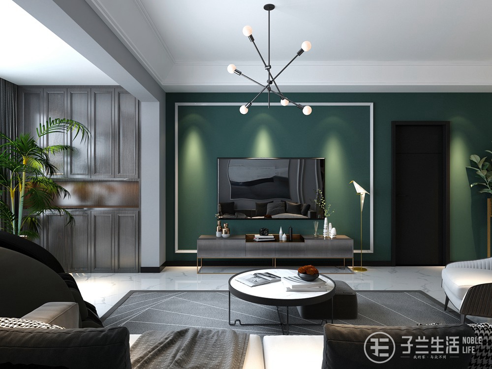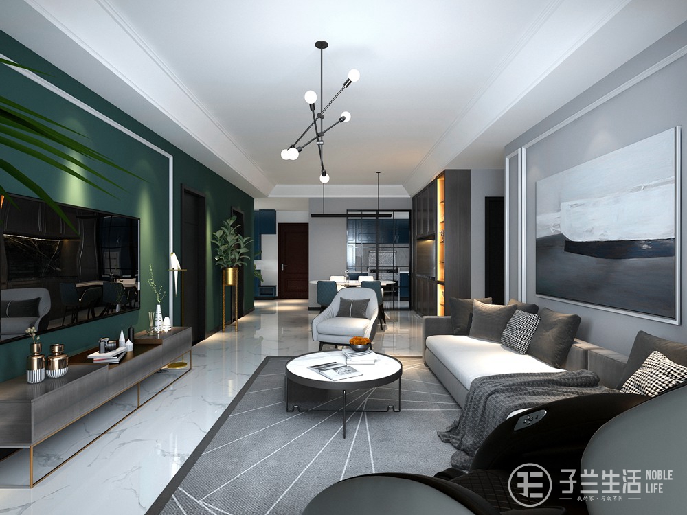 整體淡灰色和墨綠搭配,打造出素凈、舒適又極具品質感的空間。灰色系列家具配合黑白掛畫,讓空間干凈通透。墻面的線條搭配家具金屬材質使居家更具文藝情結。