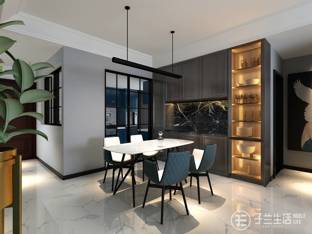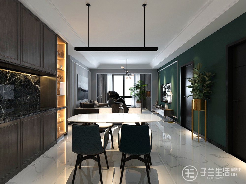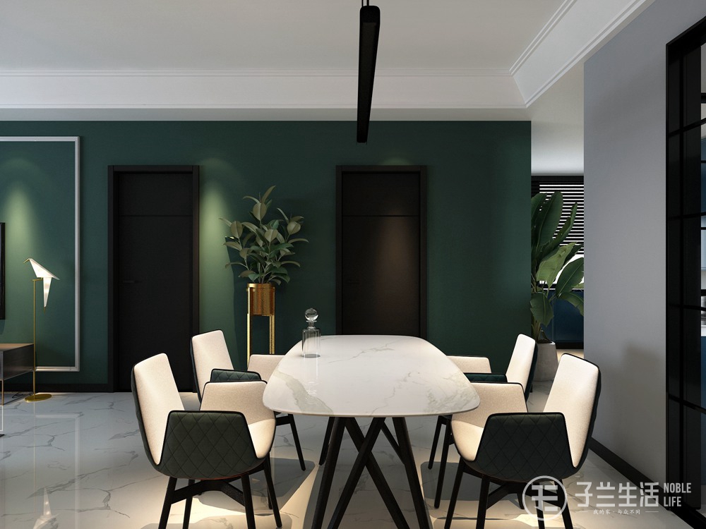 整個餐廳的設計是一個春天里就餐的氛圍。墨綠色彩延伸到椅背上,讓人身臨其境,忘卻鋼筋混凝土堆構筑的生活。條狀的吊燈,簡潔輕快。雙色的餐椅,潔白桌面再配上橙色和綠色的葉子自然氛圍爆棚,使人心情舒適。收納功能為一體的裝飾柜,燈光的烘托讓精美的餐具洋溢在陽光下,散發(fā)出它獨特的魅力。
