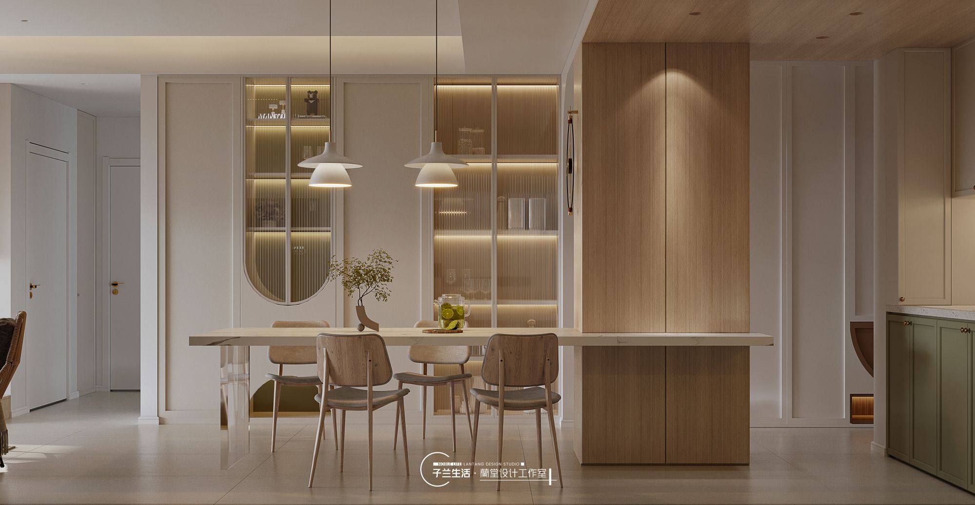 餐廳邊柜用移門到頂玻璃門與實(shí)木門相互搭配,整體展示一份穩(wěn)重且愜意的儀式感