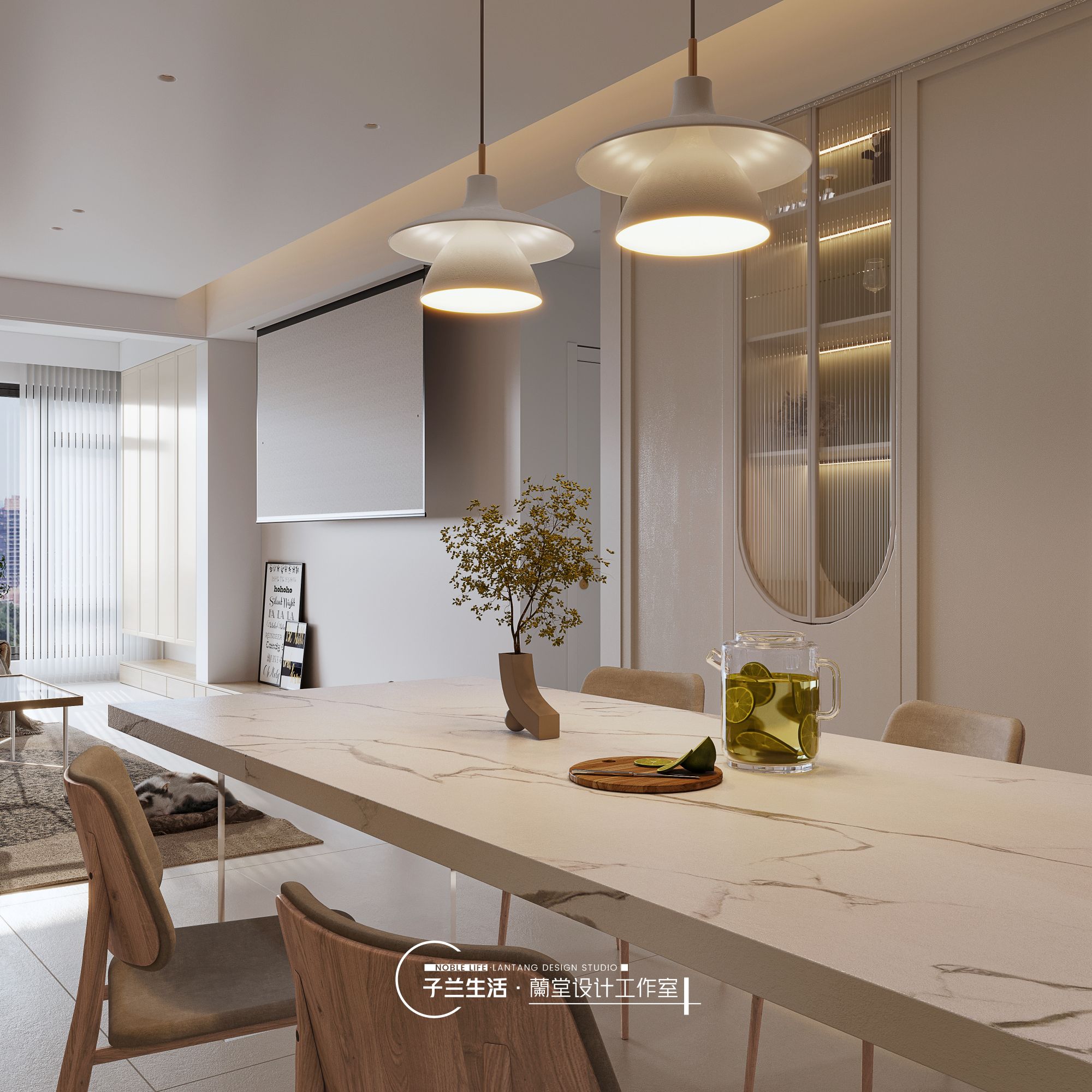 整體展現(xiàn)通透明亮的一面,電視背景墻用簡單的留白設(shè)計(jì)與沙發(fā)背景墻相呼應(yīng),點(diǎn)綴一盞漸變色日光燈、溫暖的空間儀式感