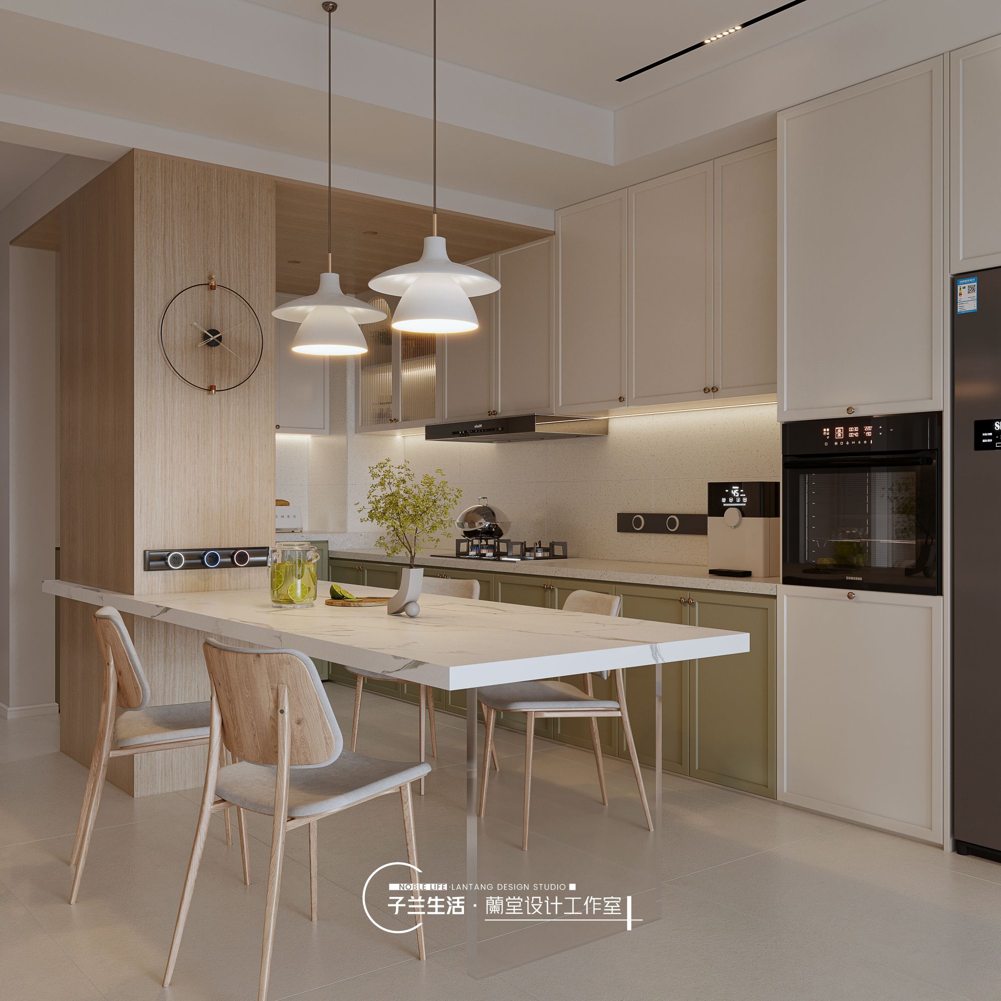 餐廳和廚房設(shè)計(jì)偏現(xiàn)代法式一些,櫥柜吊柜和地柜用奶白色與橄欖綠搭配,整體顯得清新優(yōu)雅