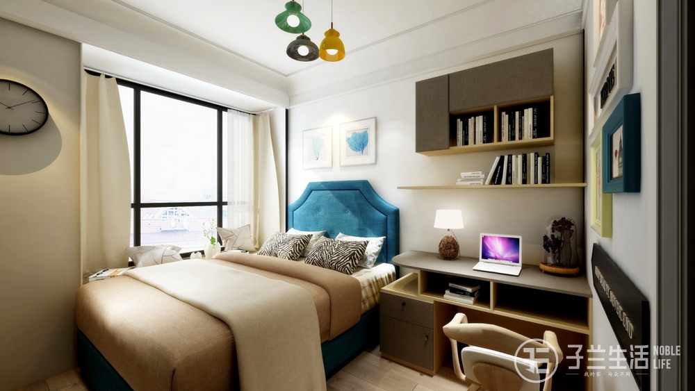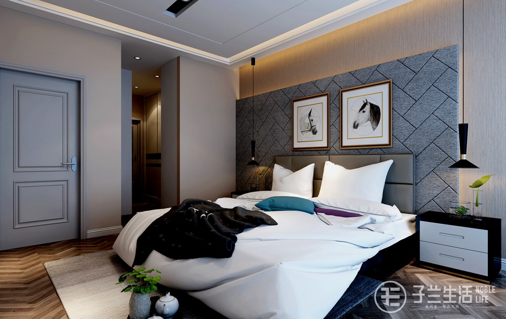 兩個次臥依然采用了灰色的背景墻色,床品分別采用了木質(zhì)和布藝,整體色調(diào)更輕松。