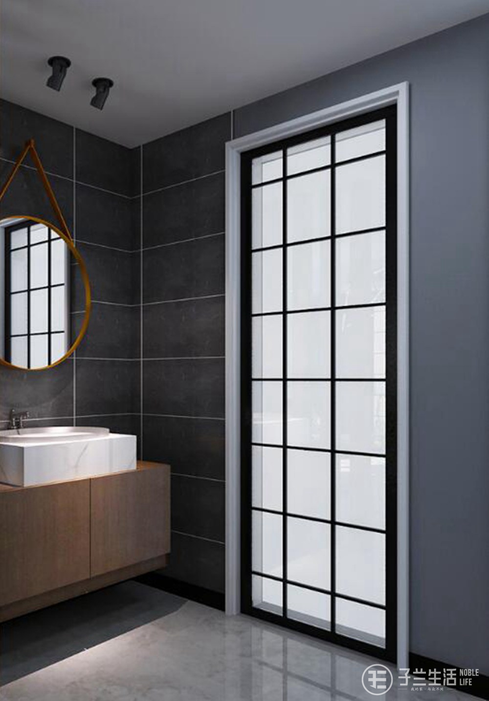 衛(wèi)生間干濕分區(qū)合理巧妙,墻壁和地面使用了暗色瓷磚,搭配潔白的潔具,十分干凈利索。