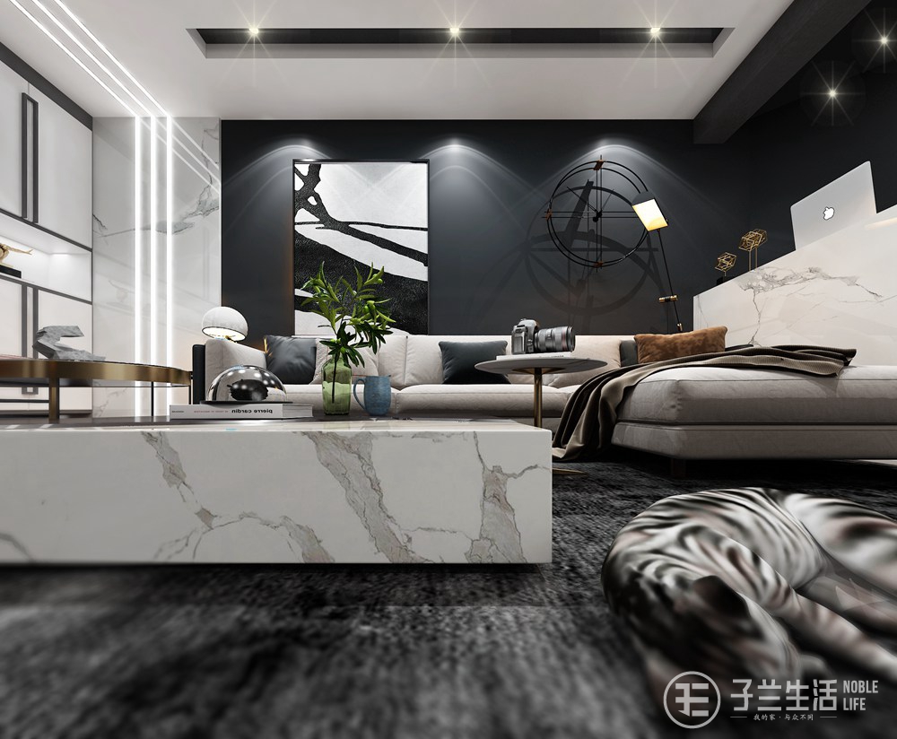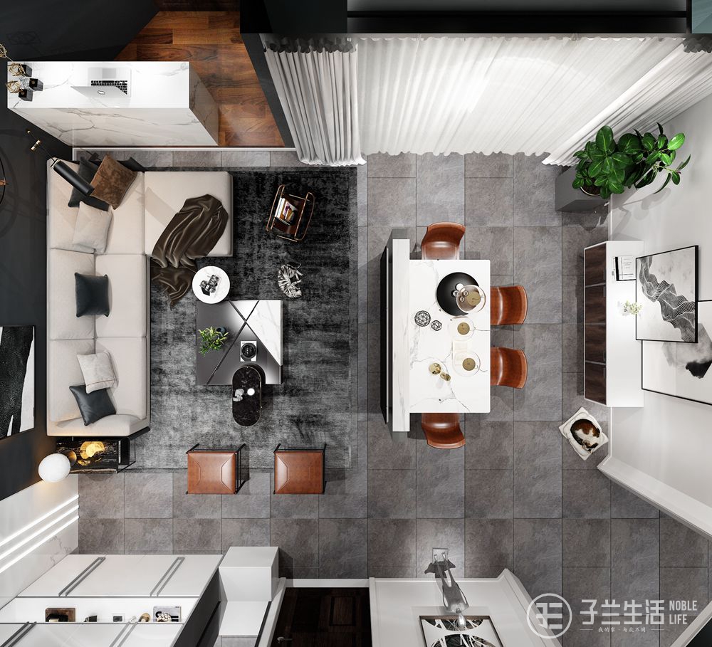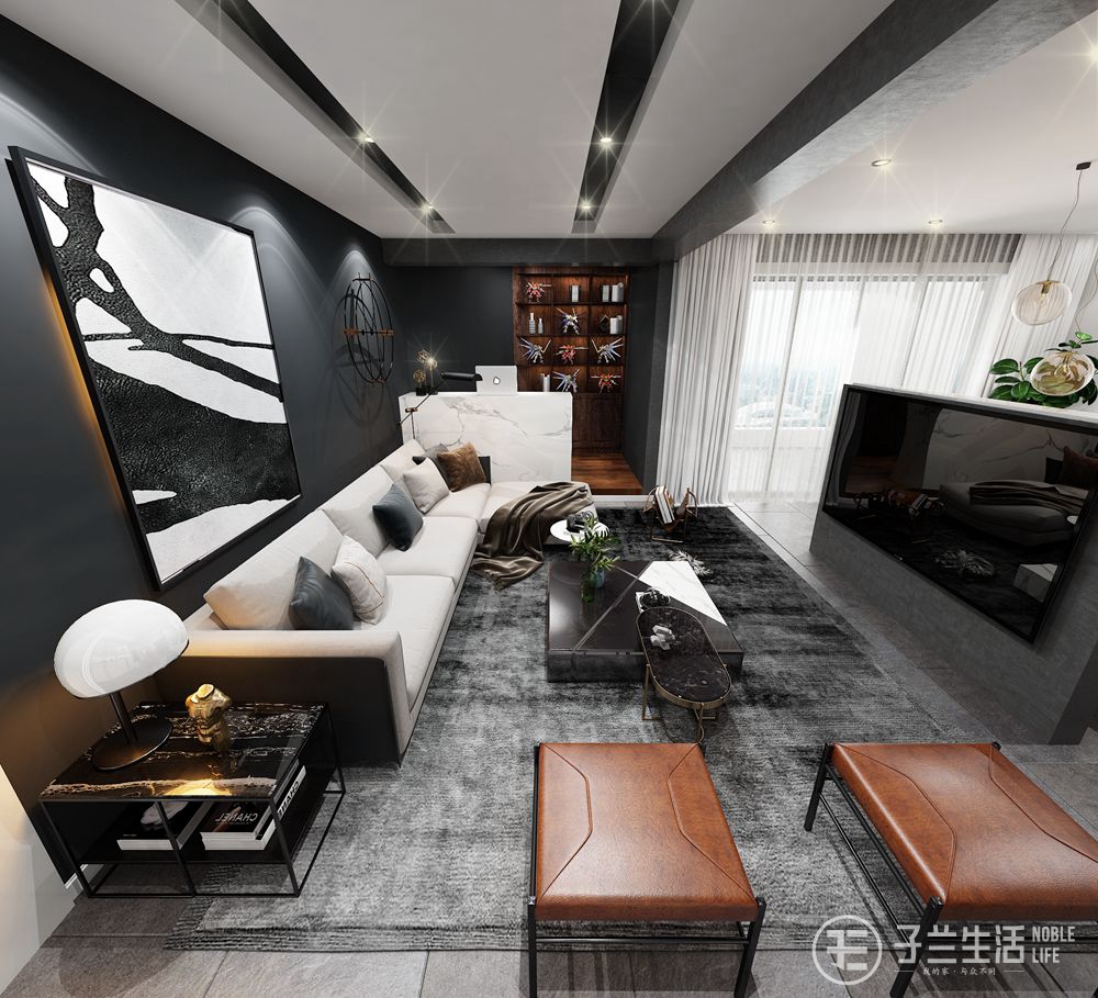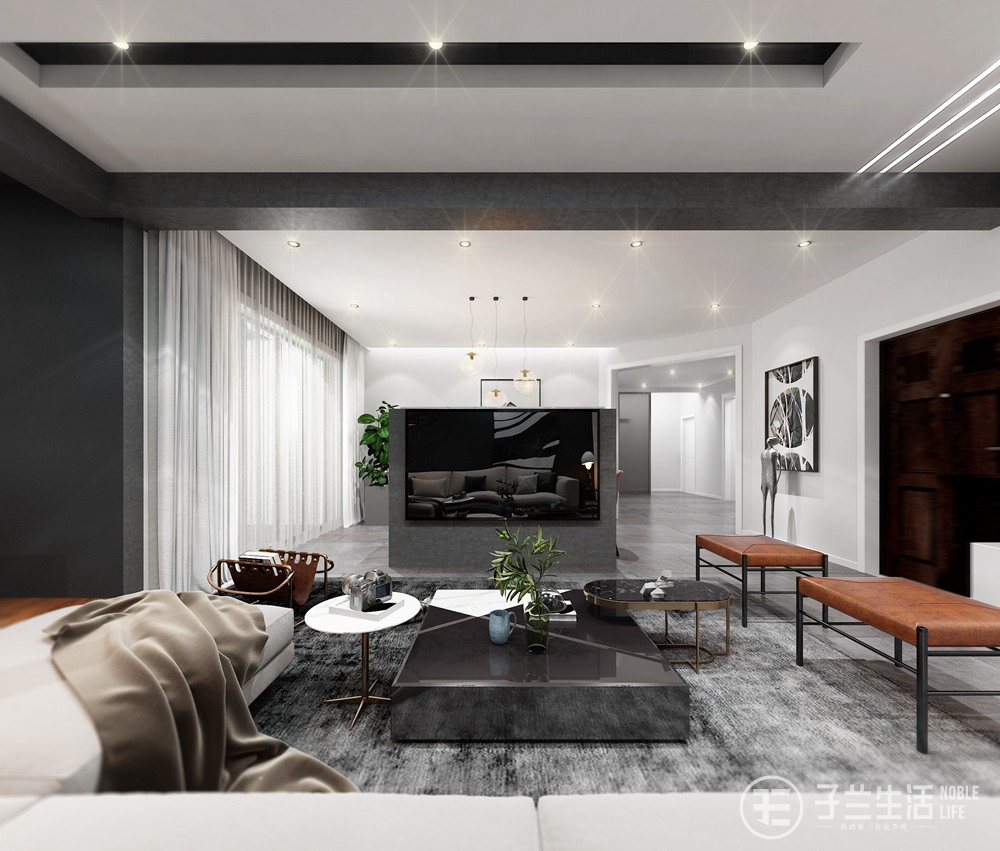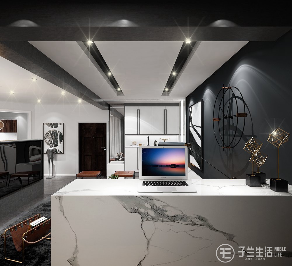 本案已黑白灰為主,利用陽臺空間隔出開放式小書房,在辦公休閑之余和家人也有更多互動的機會,增加親密度,原始客廳頂面梁高度過低,所以選擇直接裸露,用藝術(shù)涂料處理后做為頂面裝飾。
