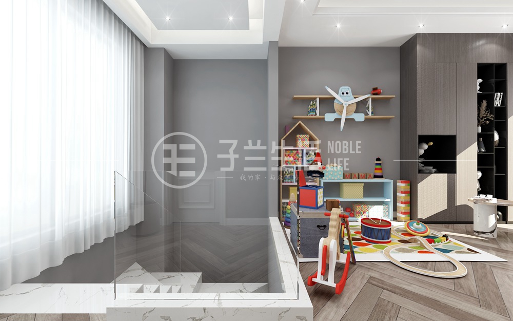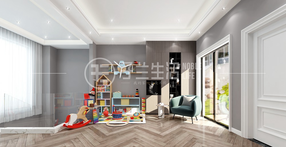把原始戶型的陽臺連通作為了室內(nèi)空間,利用原來陽臺的地面做了上下樓梯開口,落地玻璃配上玻璃的樓梯扶手,讓室外的光線能充分的灑進(jìn)室內(nèi),毫無遮擋。這里家長陪同孩子玩耍的空間,既有孩子的玩具柜地墊,也為家長提供了書柜和休閑座椅,透過玻璃門外可以欣賞到露臺花園的別樣景致,也能讓陪伴時光更加愜意,特別設(shè)計了樓上的生活飲水的取水點,讓生活實用更加便利。