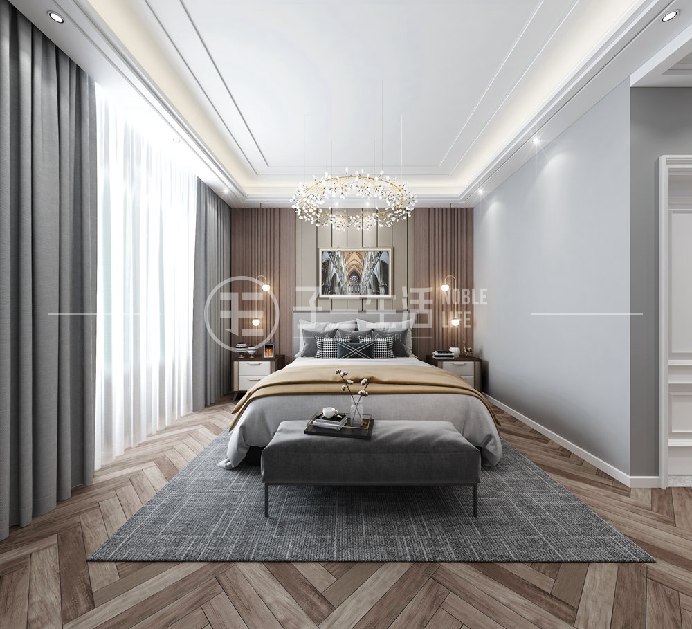 星星點點的主燈燈光,搭配上床頭兩側(cè)的小吊燈,能營造出浪漫休閑的氣氛,木質(zhì)墻板與皮質(zhì)包裹的床頭背景讓整個空間都柔軟了下來。