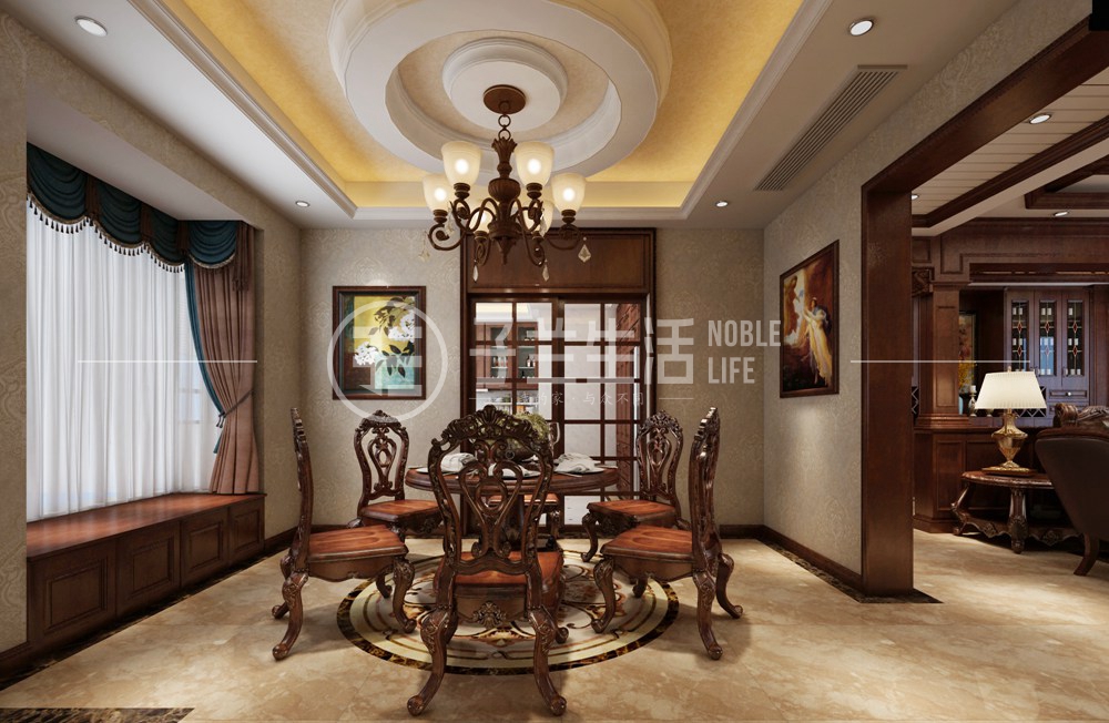 客廳空間的層高較高,良好的采光讓整體客廳配以深色家具后整個(gè)客廳光線更加柔和,淡黃色墻面和地面的相互對(duì)比及相互呼應(yīng),讓整個(gè)空間明亮,家具的深色配色,更顯主人的大氣、沉穩(wěn)。