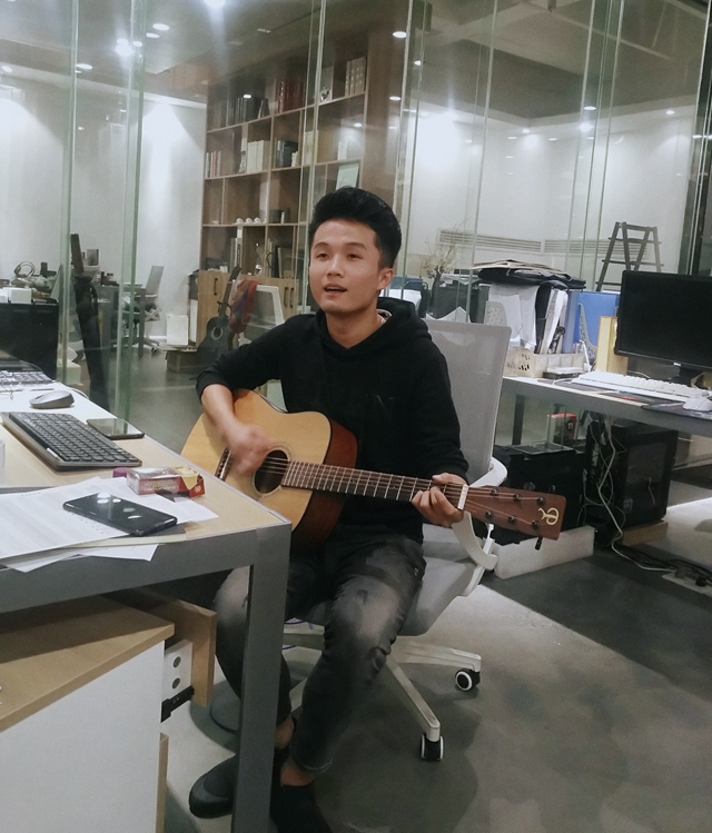 一天加班的夜晚里,我坐在書咖尋找靈感,忽而聽到吉他聲伴著歌聲,是那么地悅耳動聽,而彈奏曲目,是我所熟悉的《藍蓮花》。當被美妙的聲音吸引之后,我尋找聲源,找到了這個彈奏者,是設計助理劉躍興。他當時的神態(tài)是那么地動情,臉上寫滿了自信與張揚,就像藍蓮花一樣,沒有什么能夠阻擋,他對自由的向往……
