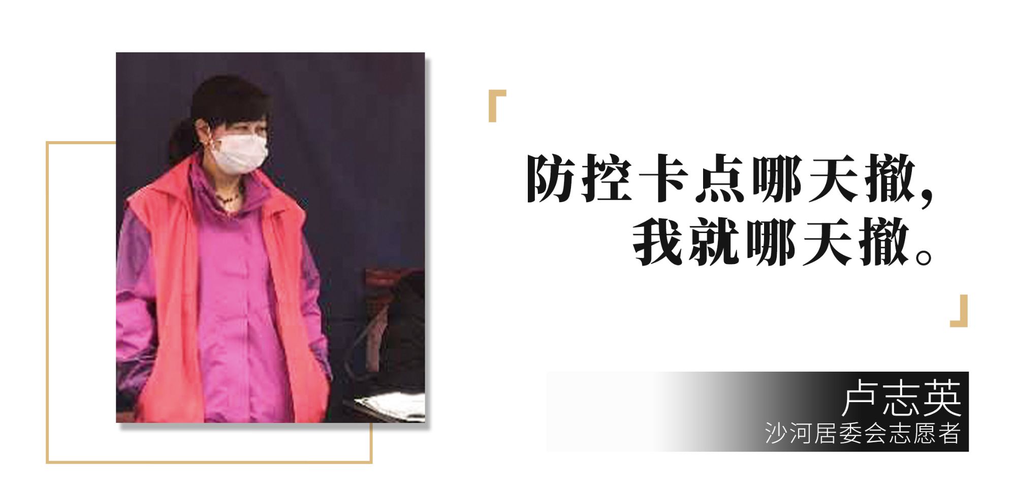路口值守,沒有報(bào)酬,親戚朋友們都表示很不理解,一位親戚甚至還直接來到家中勸說:“ 卡點(diǎn)上來來往往的人太多,太危險(xiǎn)了,待在家中,不要再去了?!北R志英回答:“防控是我們每一個(gè)人的責(zé)任,誰都不去,病毒來了怎么辦?防控卡點(diǎn)哪天撤,我就哪天撤?!?/span>