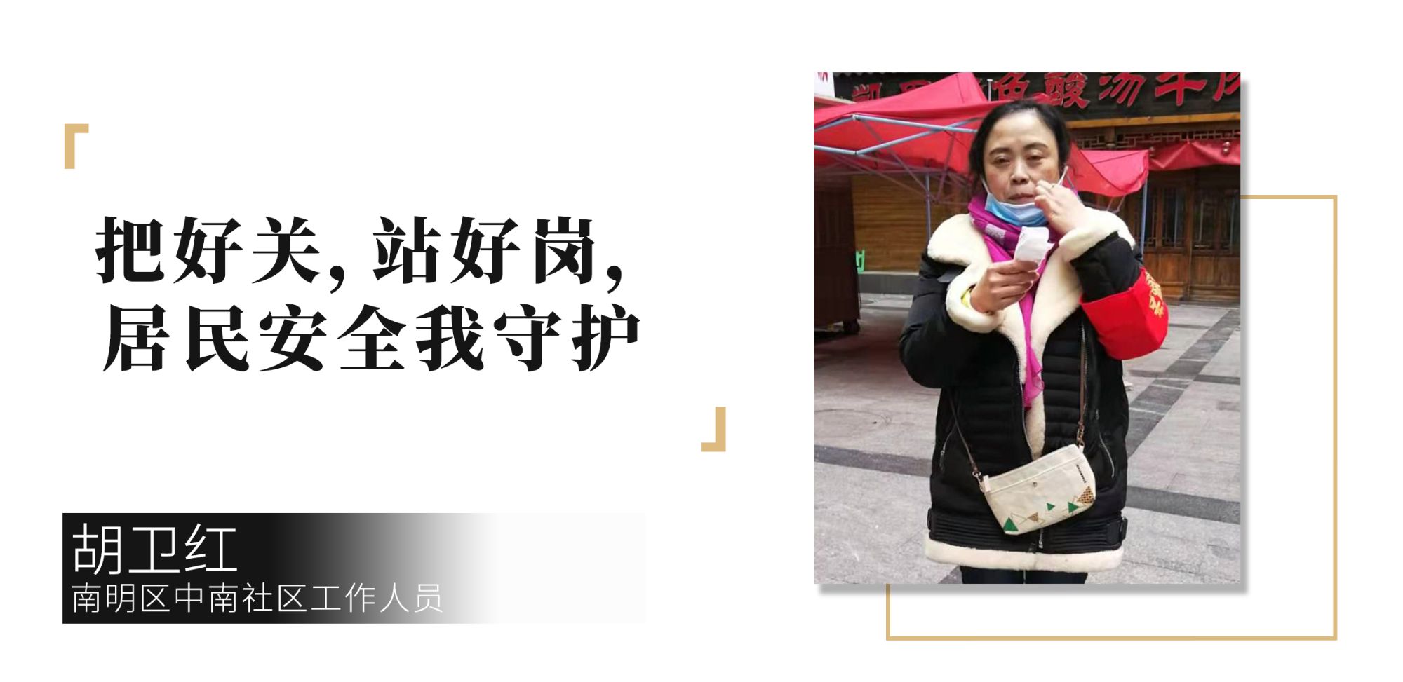 “ 帥哥,請(qǐng)量一下體溫! ”“ 同志,出門記得戴口罩! ”“ 妹兒,進(jìn)門前記得先噴酒精消毒 ! ” 已經(jīng)52歲的胡衛(wèi)紅,多年來一直有風(fēng)濕,一到冷天膝蓋就痛,然而,疫情面前,作為一名黨員,她沒有退縮。從大年初一到現(xiàn)在,疫情防控的警報(bào)一拉響,她便每天堅(jiān)守一線。