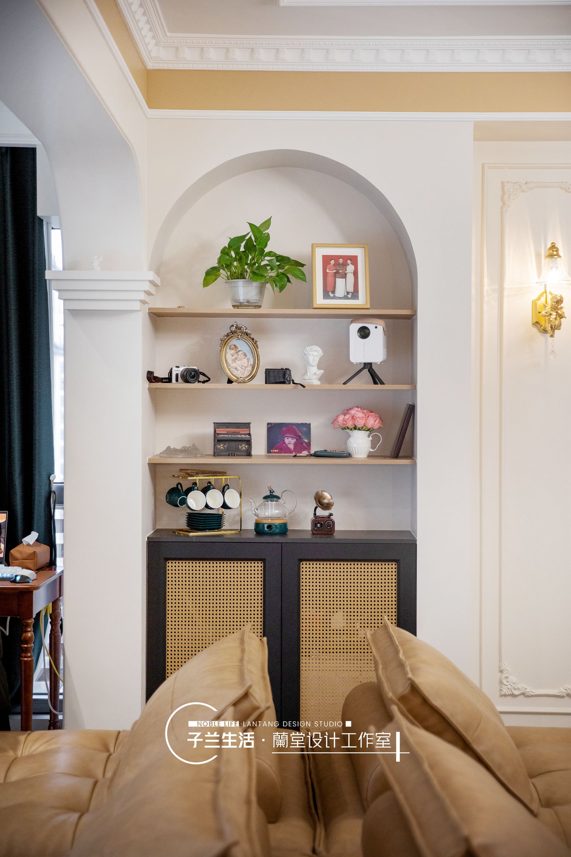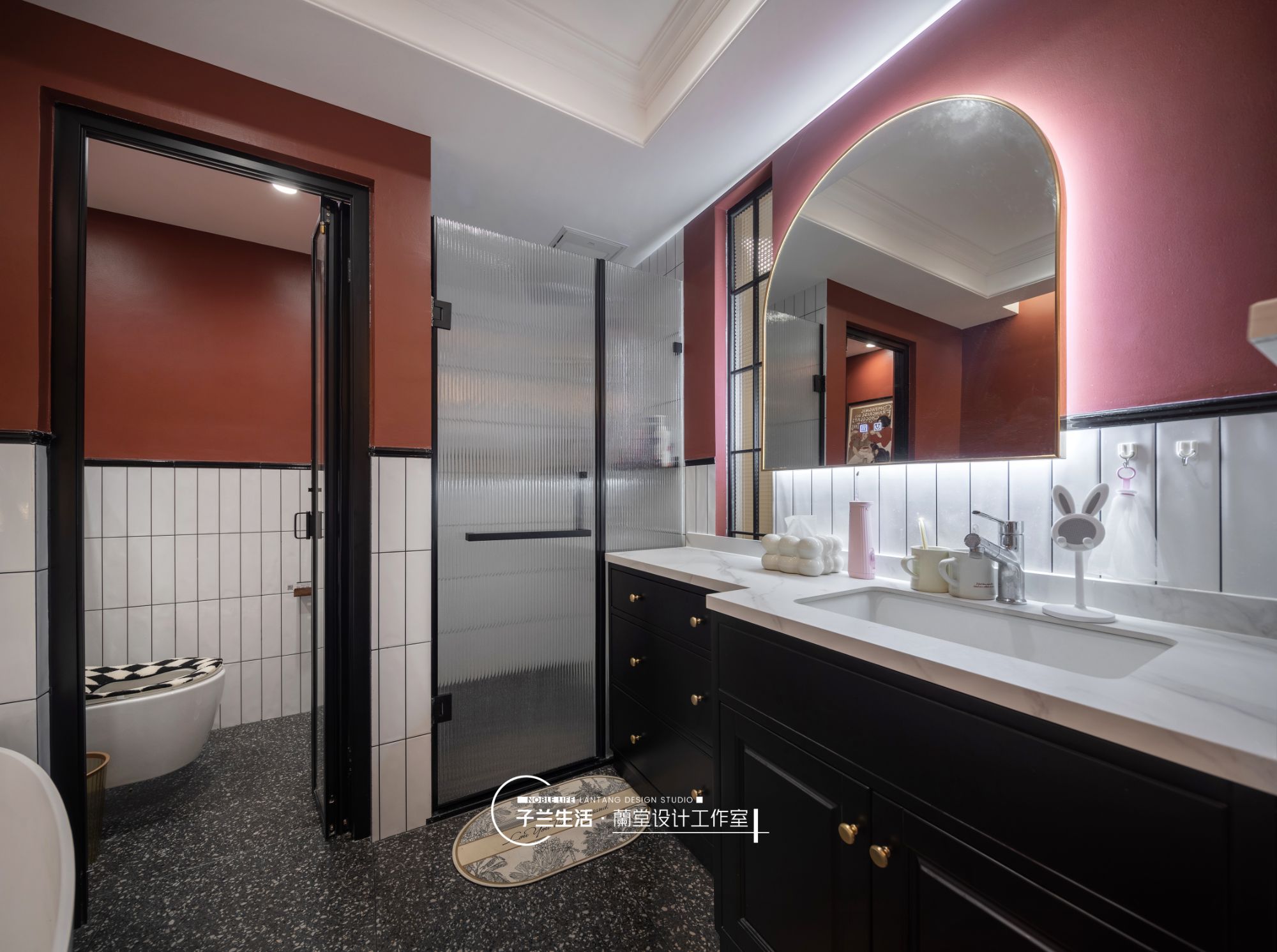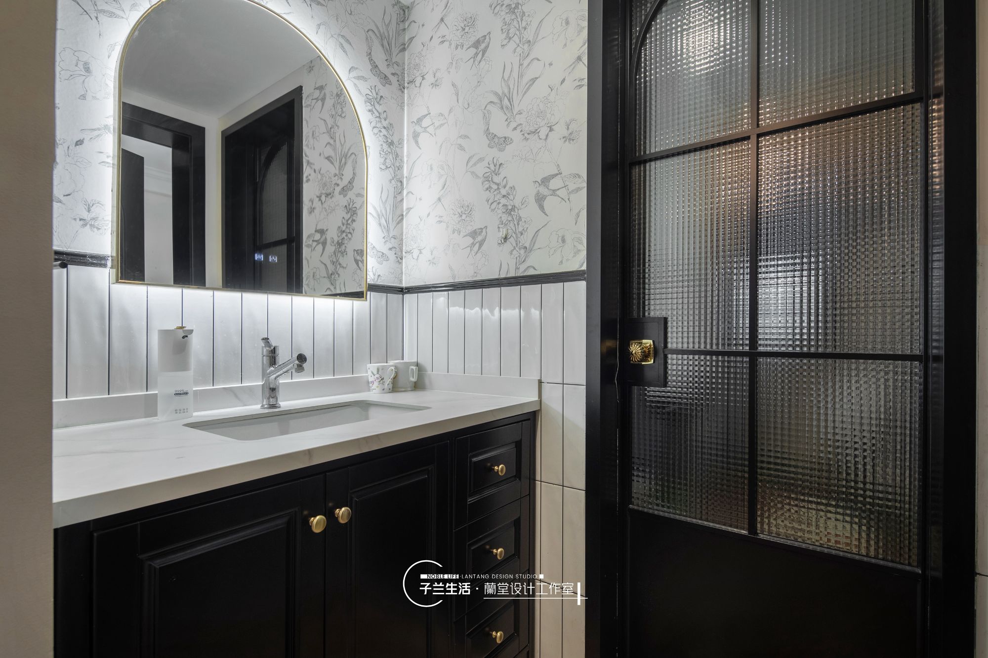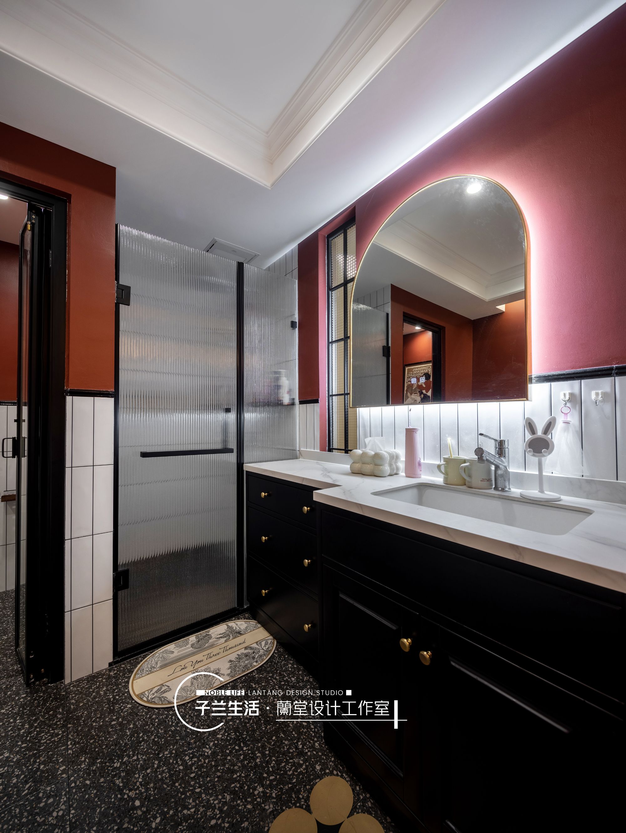 走廊采用拱形門設(shè)計(jì),加強(qiáng)了空間的縱深感。搭配復(fù)古磚貼,加上鐵藝吊燈散發(fā)的斑駁光影,同樣把浪漫感烘托到極致。甜梨每天從這里經(jīng)過,儀式感十足。走廊旁邊是一個(gè)客衛(wèi),平常來了客人、朋友,方便使用。搭配上采用了宮廷絨底油畫布貼在墻上,和深色的玻璃門共同營造了復(fù)古氣質(zhì)。
