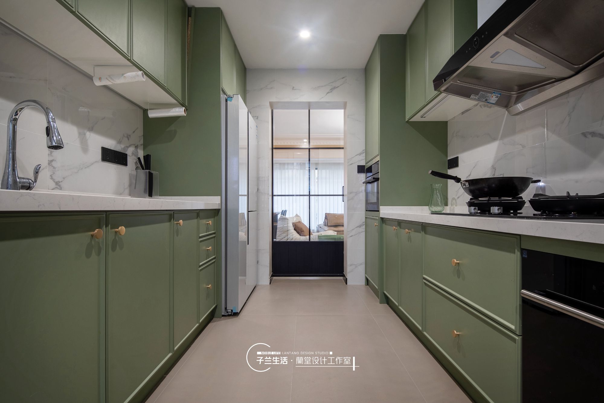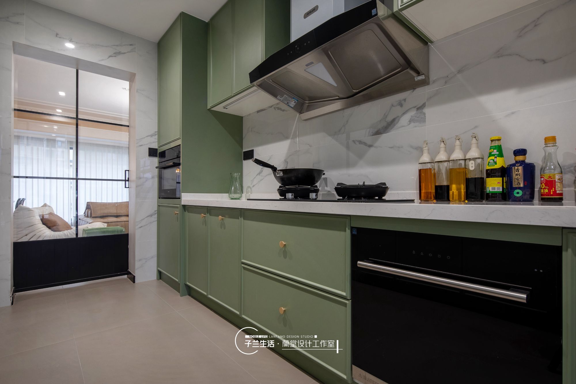 廚房用谷倉移門隔開,可開可合,有效杜絕油煙。即便偶爾偷懶,沒整理好廚房,關(guān)上門也至少能“眼不見為凈”,顏值和功能都有了。選用橄欖綠櫥柜,清新自然,打破廚房潮濕昏暗的刻板印象。櫥柜的布局根據(jù)甜梨和家人的收納習(xí)慣設(shè)置,抽屜、調(diào)味拉籃、碗籃等不僅讓物品的收納更井然有序,也為洗切炒等烹飪操作釋放出更多的空間,做飯更加順手。
