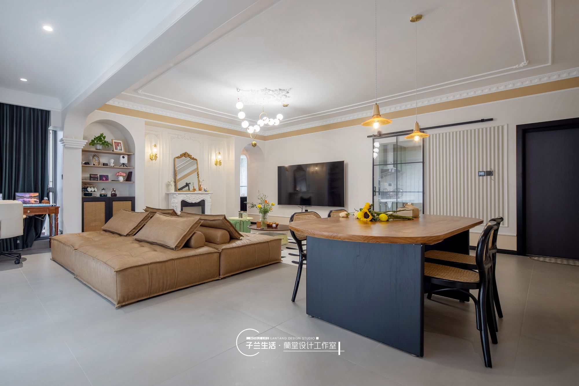 客廳焦糖色的雙面沙發(fā),可以面朝落地窗,曬著日光喝咖啡,享受慵懶時(shí)光,又可以坐向電視方向,看電影、玩游戲,這非常符合甜梨的生活方式:“我希望客廳是多變的,哪怕是小小的變化,這樣生活才會(huì)有新鮮感和浪漫感。”法式控的客廳,電視可以沒有,壁爐一定要占c位。裝飾pu線條、細(xì)膩的雕花,綴以復(fù)古銅鏡、玻璃燭臺(tái)花瓶,再點(diǎn)燃一支香薰蠟燭,分分鐘就能調(diào)配出古典又浪漫的氛圍,打通客廳和陽臺(tái)之后,空間面積更加寬敞,在靠近窗戶最好的光線,規(guī)劃了工作區(qū),平??梢栽谶@里加班、看書等。