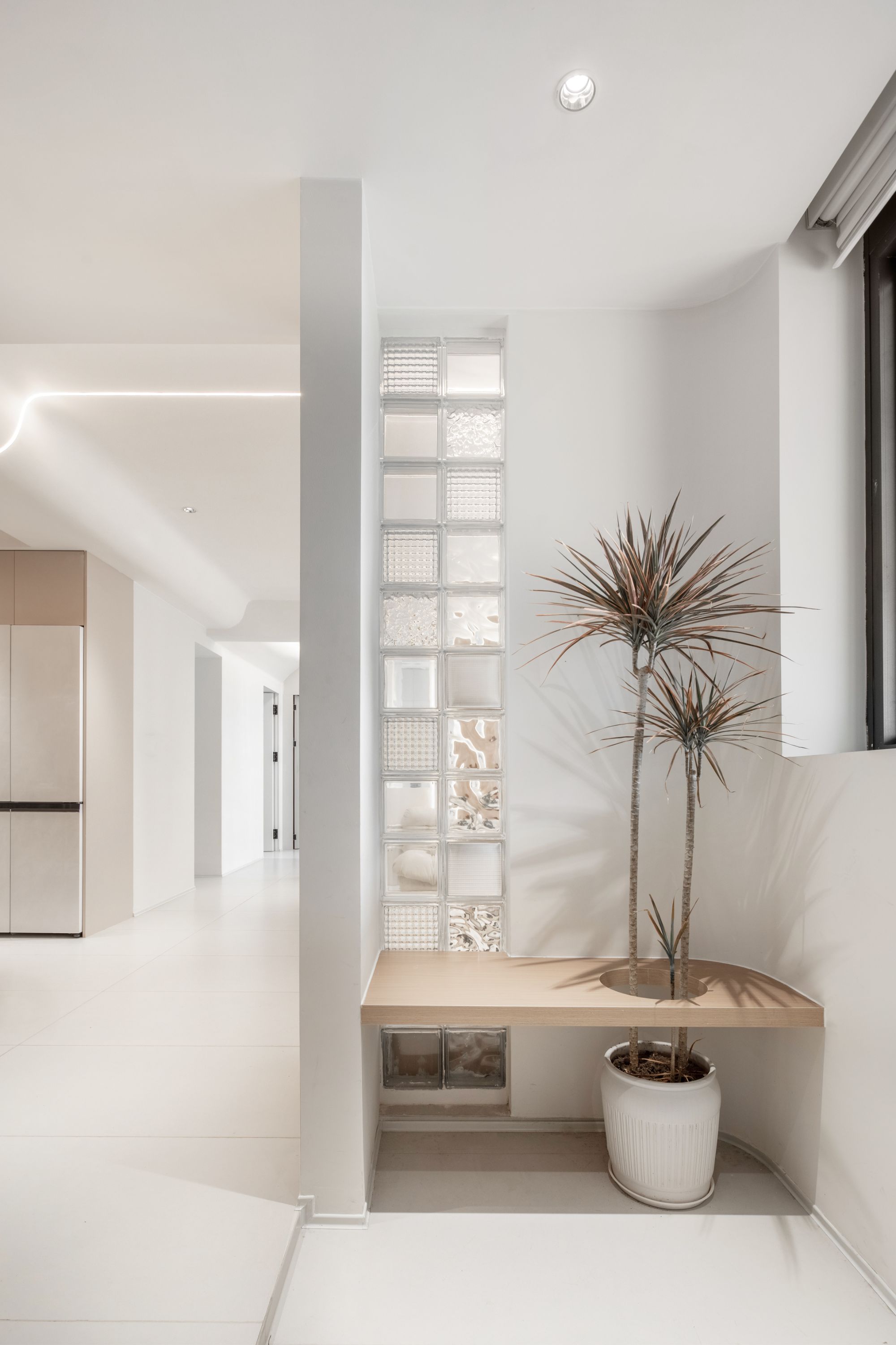 入戶是家溫暖的一角,也是家的開始,我喜歡水晶磚帶來的設計感,無論是晨光熹微的早上,還是落日霞暮的午后,當光線透過水晶磚灑在地面上時,瞬間將入戶區(qū)域點亮,獨特的光影效果,讓我與愛人一起歸家時感到非常溫暖舒適,忘卻一整天的疲憊感。這個角落還有一個非常實用的功能,即落塵區(qū),考慮到三朋好友來家時,為了避免進門后弄臟地板,特意設計了這個落塵區(qū),在這個角落里,我放置了一盆綠植,它與隔板完美融合,營造出一種自然的氛圍,這里的隔板也是置物臺,可以放置一些隨身物品,方便我們日常生活的使用此外,它還可以作為換鞋的區(qū)域,讓我們在進入室內之前能夠方便地更換鞋子,保持地板的整潔。