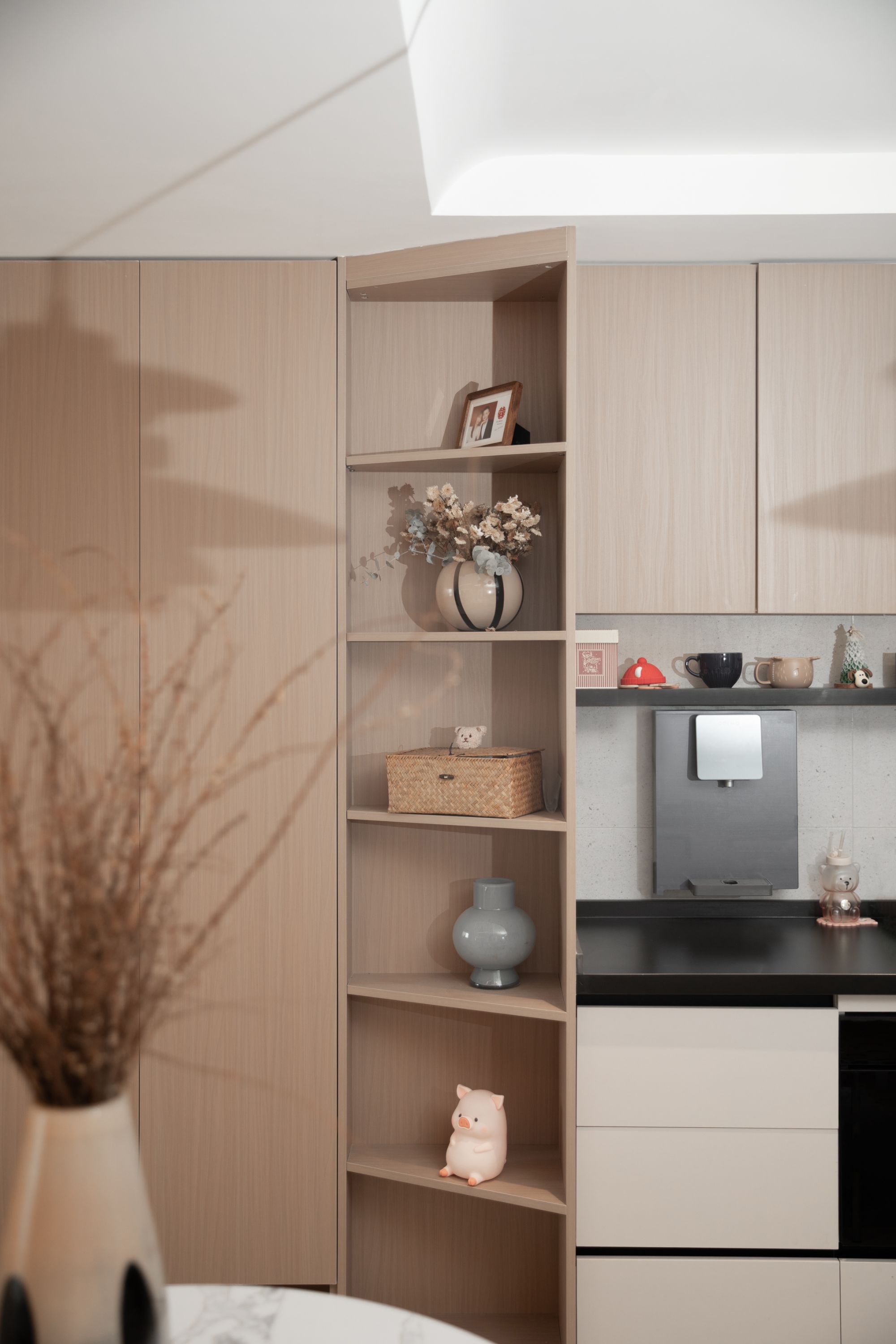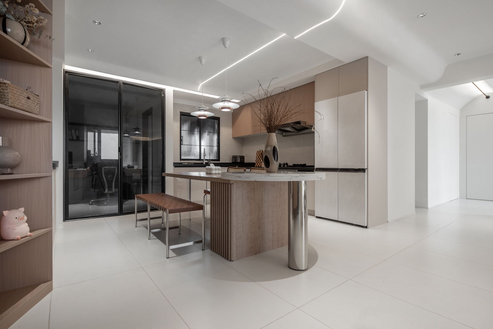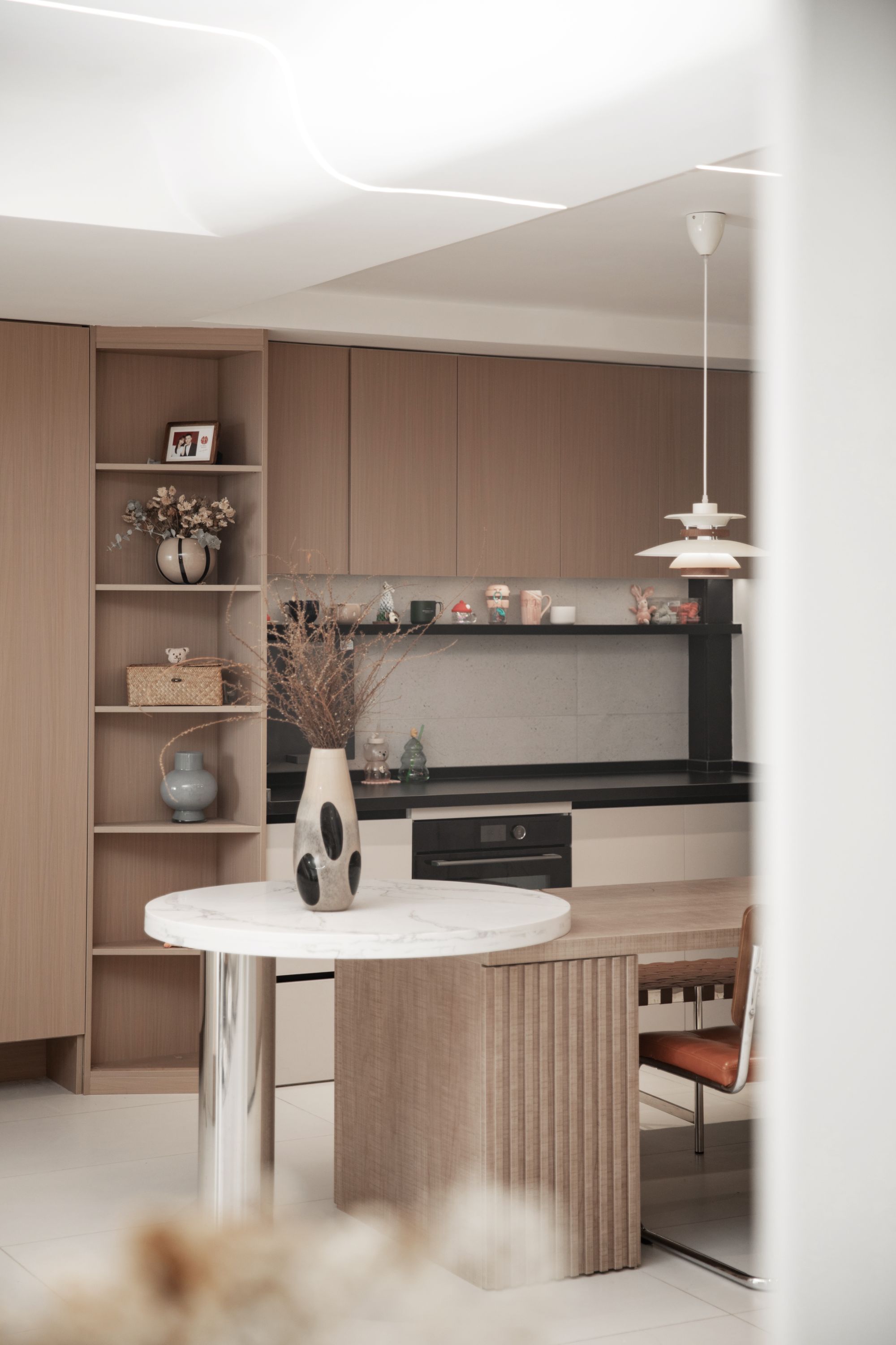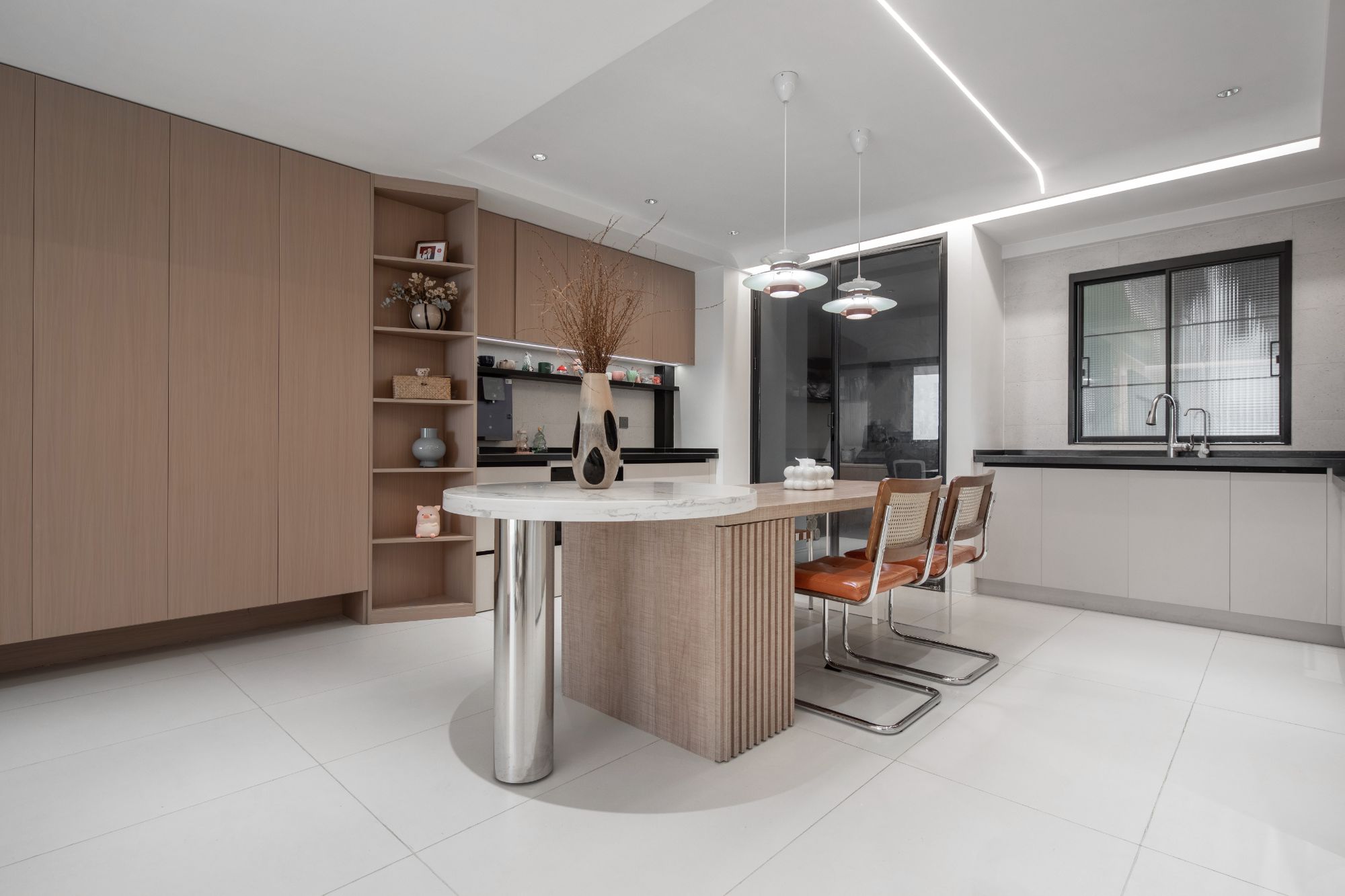 我對柔和有弧度的設計情有獨鐘,在餐廳中選擇了圓形的巖板拼接作為島臺,相比于傳統(tǒng)的方形島臺,圓形島臺更加流暢和優(yōu)雅,不僅如此,圓形島臺還能避免日常使用時的磕碰,給廚房帶來更多的安全感。我們家的餐廳是空間最大的地方,而且與客廳完全開放,形成一個流暢的整體,可以同時在廚房和客廳中自由穿梭,圓形鏤空島臺的設計能夠讓孩子和貓咪自由奔跑,享受到更多的自由和樂趣,同時也給家人帶來更多的安心和親密時光。
