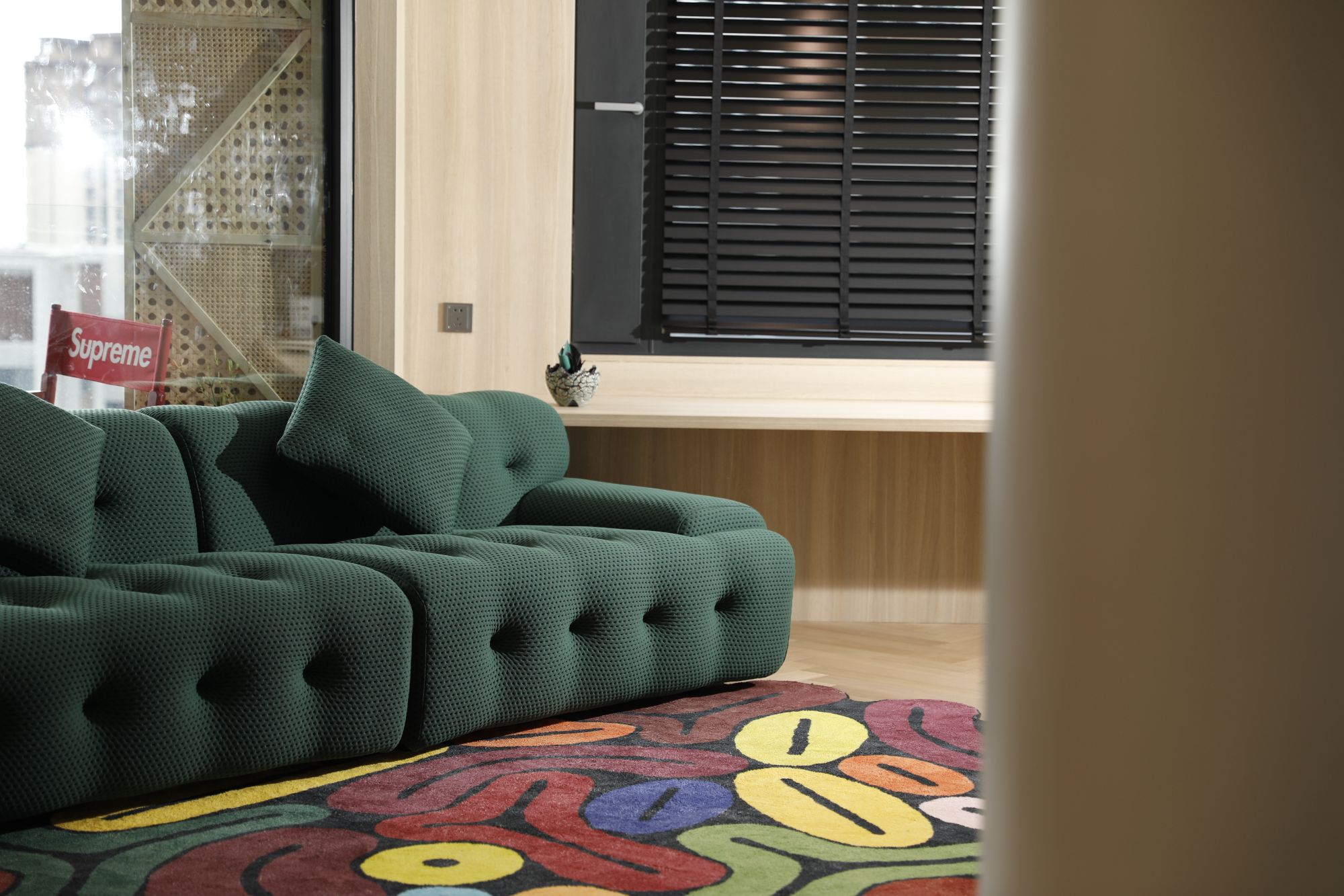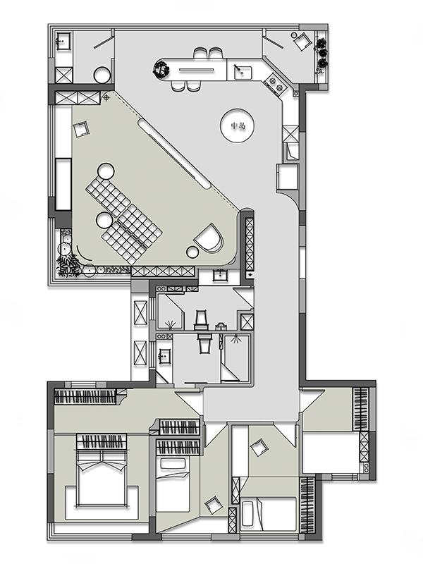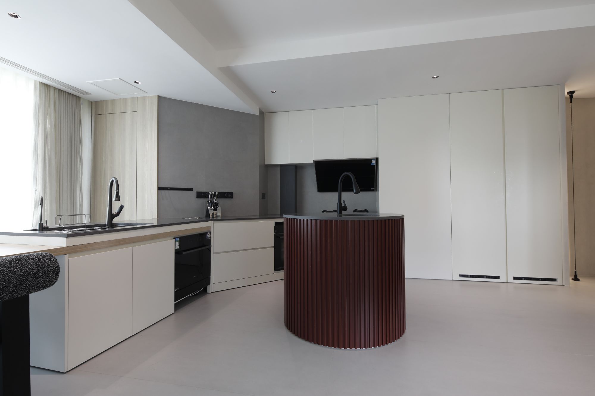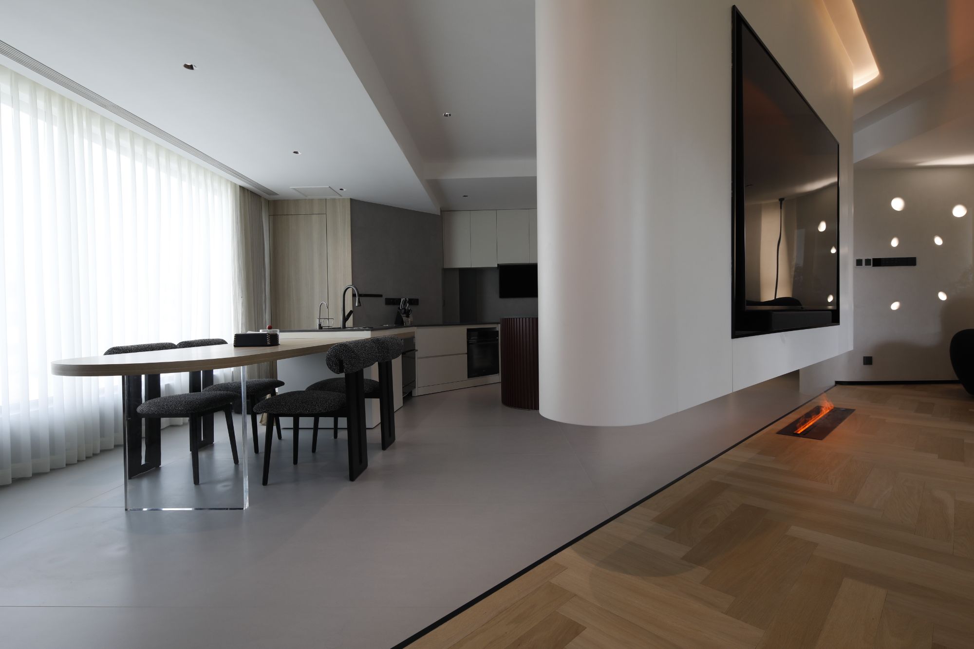 誰(shuí)規(guī)定客餐廚區(qū)域就得方方正正的?屋主Mr. L主打一個(gè)不走尋常路。Mr. L說(shuō):“我就不喜歡中規(guī)中矩,可以接受改動(dòng)較大且動(dòng)線合理的設(shè)計(jì)。”于是,傳統(tǒng)的客餐廳,扔掉!打通原先的大橫廳、生活陽(yáng)臺(tái)和書(shū)房,再用一條45°斜切線,切割成兩個(gè)三角形,變?yōu)闀?shū)房+客廳、廚房+餐廳兩個(gè)區(qū)域。這樣的斜切設(shè)計(jì)不僅讓各個(gè)功能區(qū)域的面積合理,還通過(guò)弧形設(shè)計(jì)把棱角變得柔和起來(lái),整個(gè)空間更有層次感。