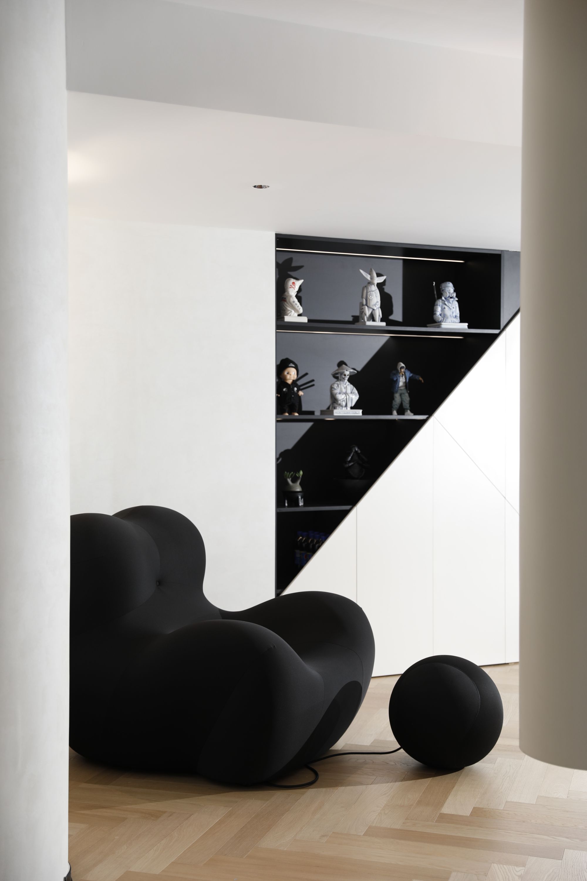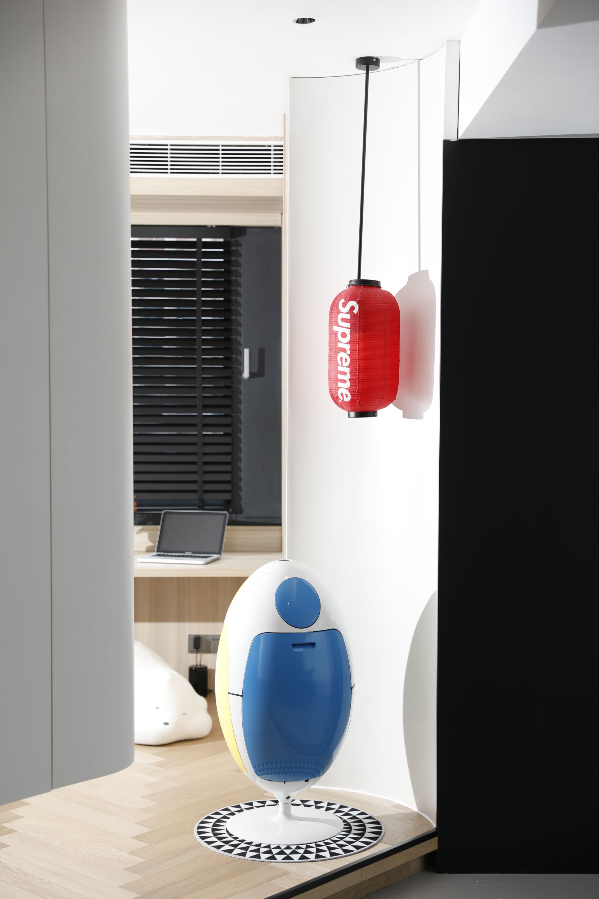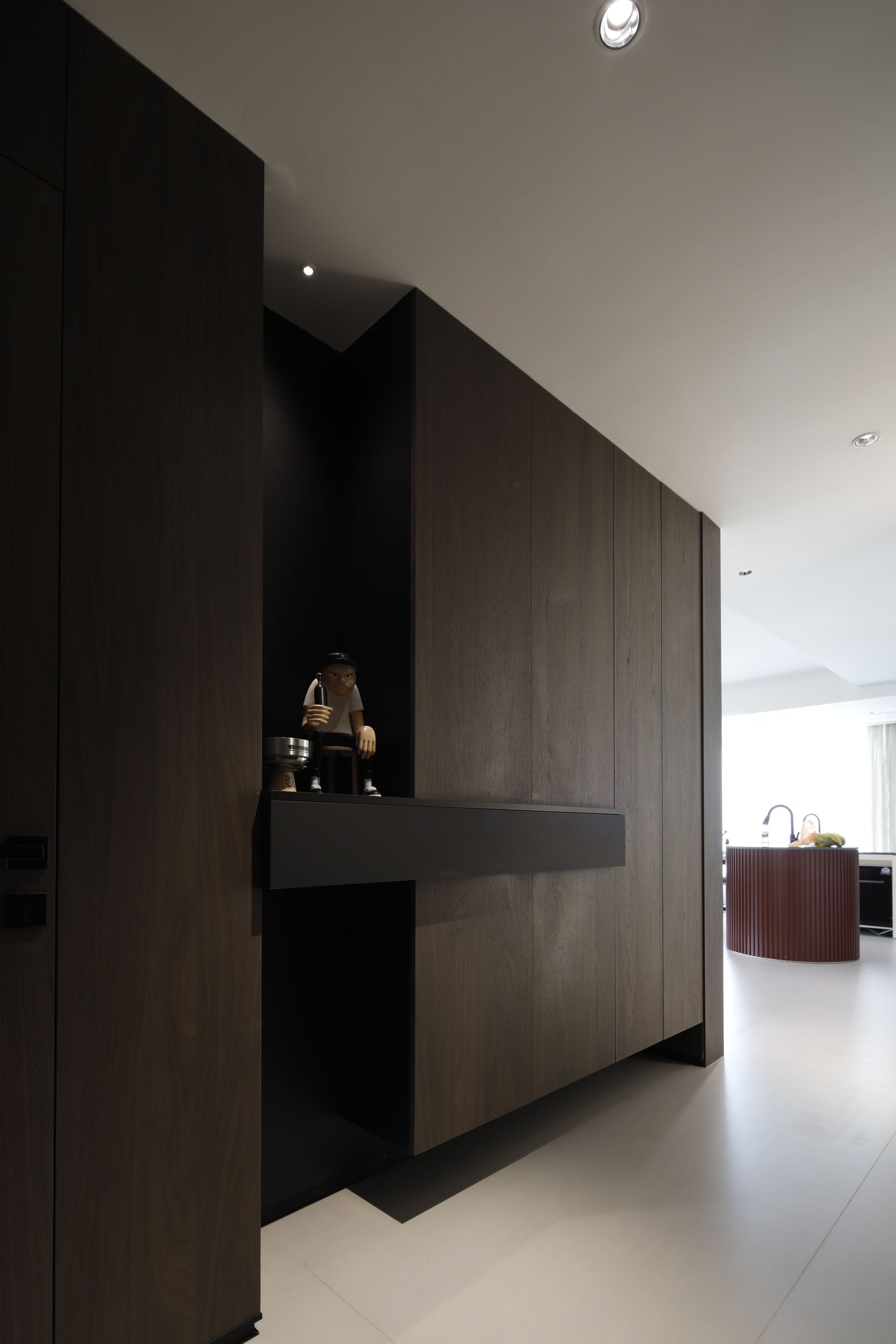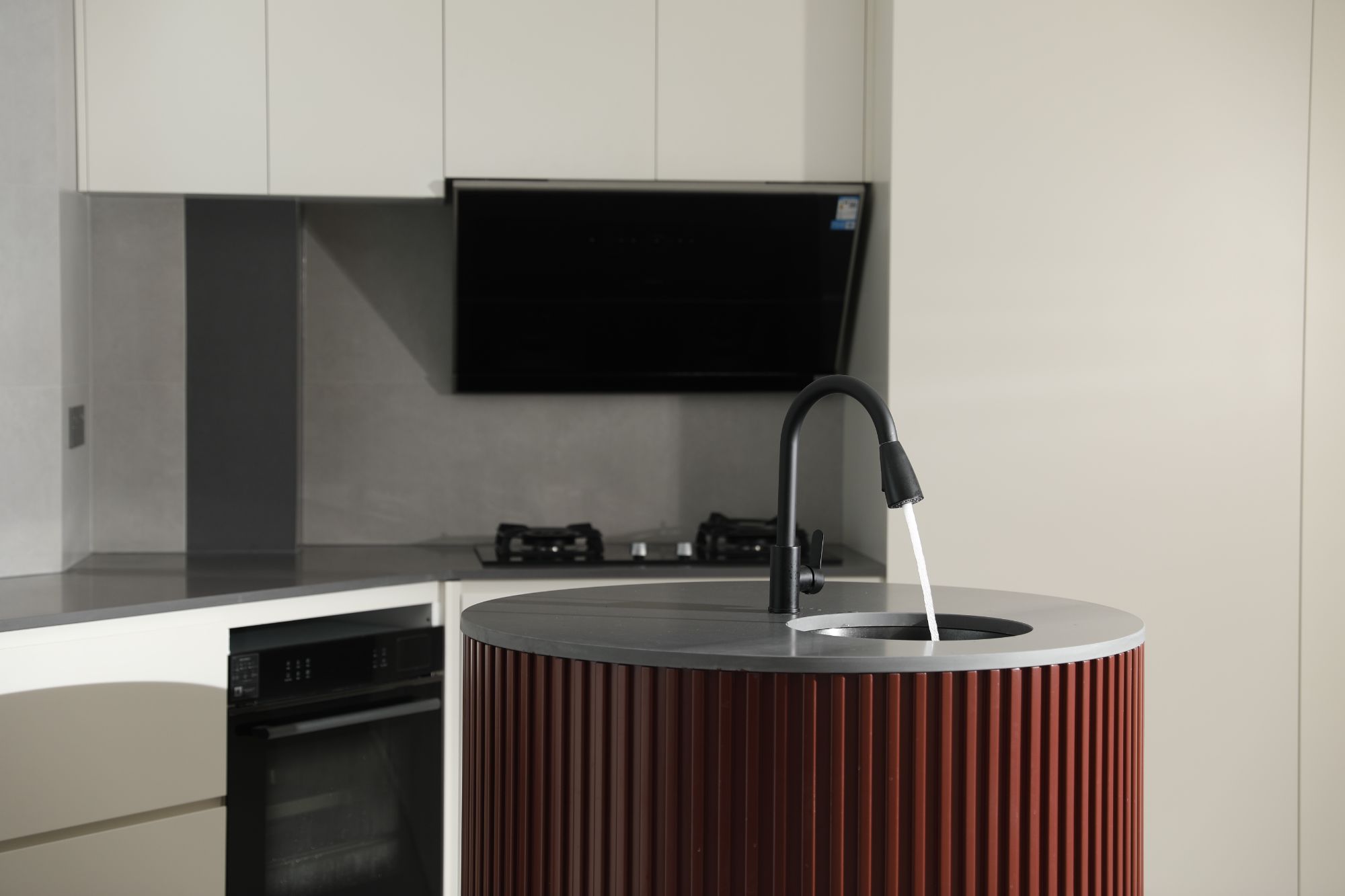 ② 穿過(guò)入戶(hù)就是一整個(gè)開(kāi)放式的廚房餐廳,中間選擇暗紅色的圓形島臺(tái)來(lái)補(bǔ)充備菜功能,而圓柱形來(lái)中和切角直線的硬朗。