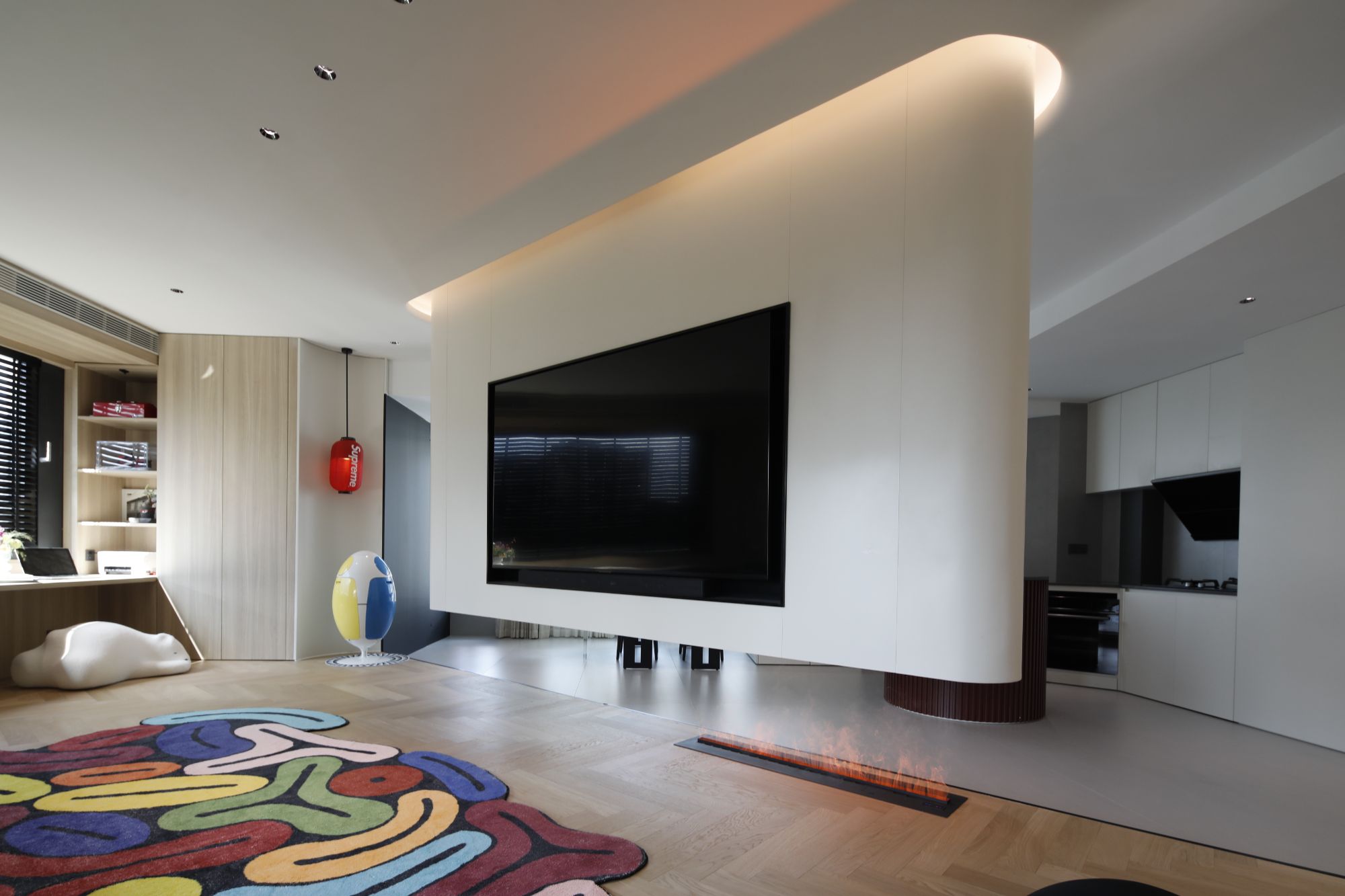③ 以懸浮的電視背景墻來(lái)劃分出餐廳與客廳,懸浮設(shè)計(jì)模糊邊界感,形成回型動(dòng)線,抬高地面鋪上木地板增加儀式感。