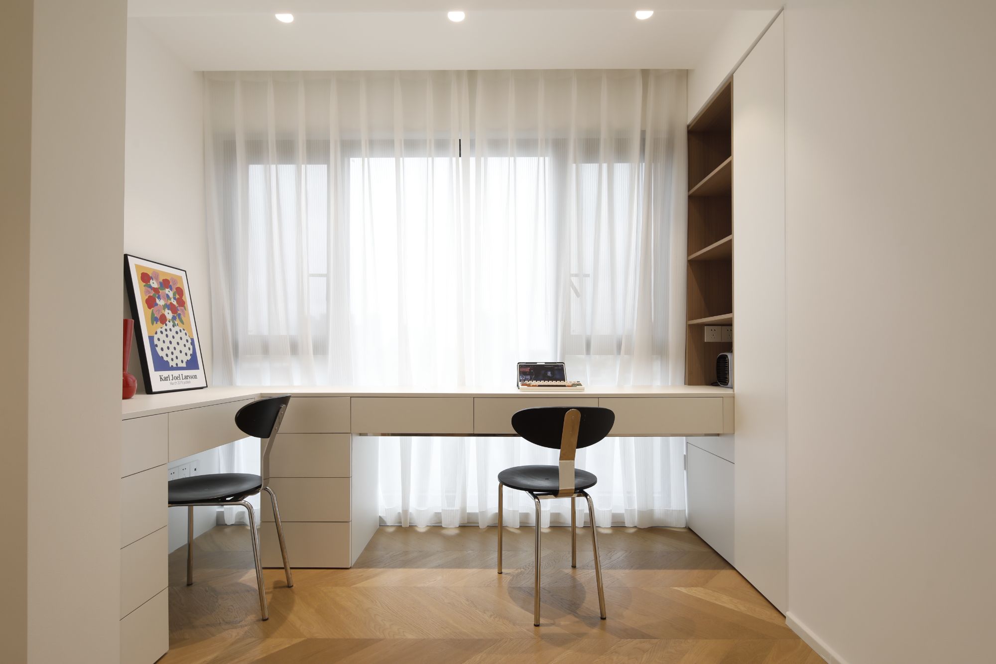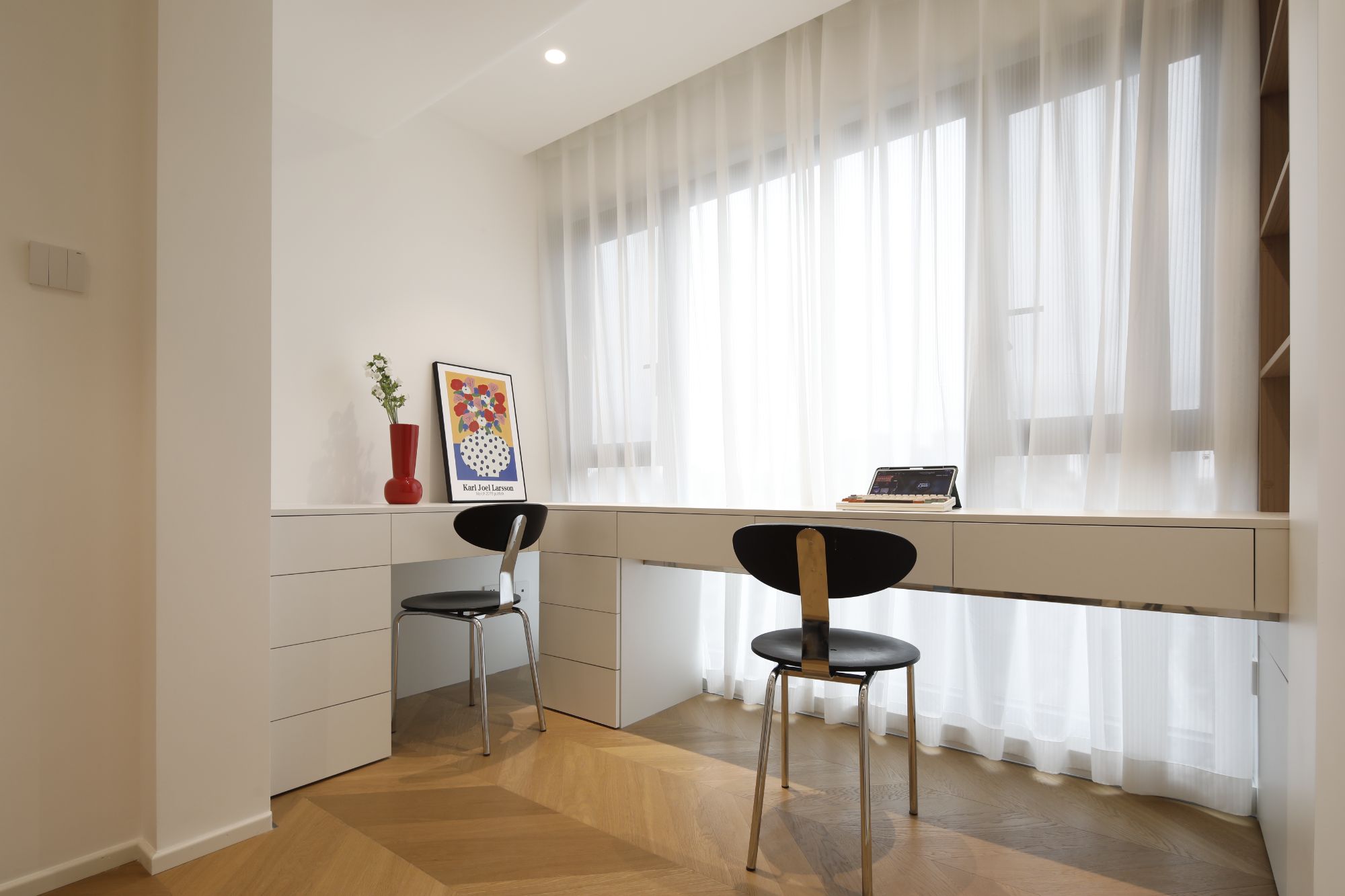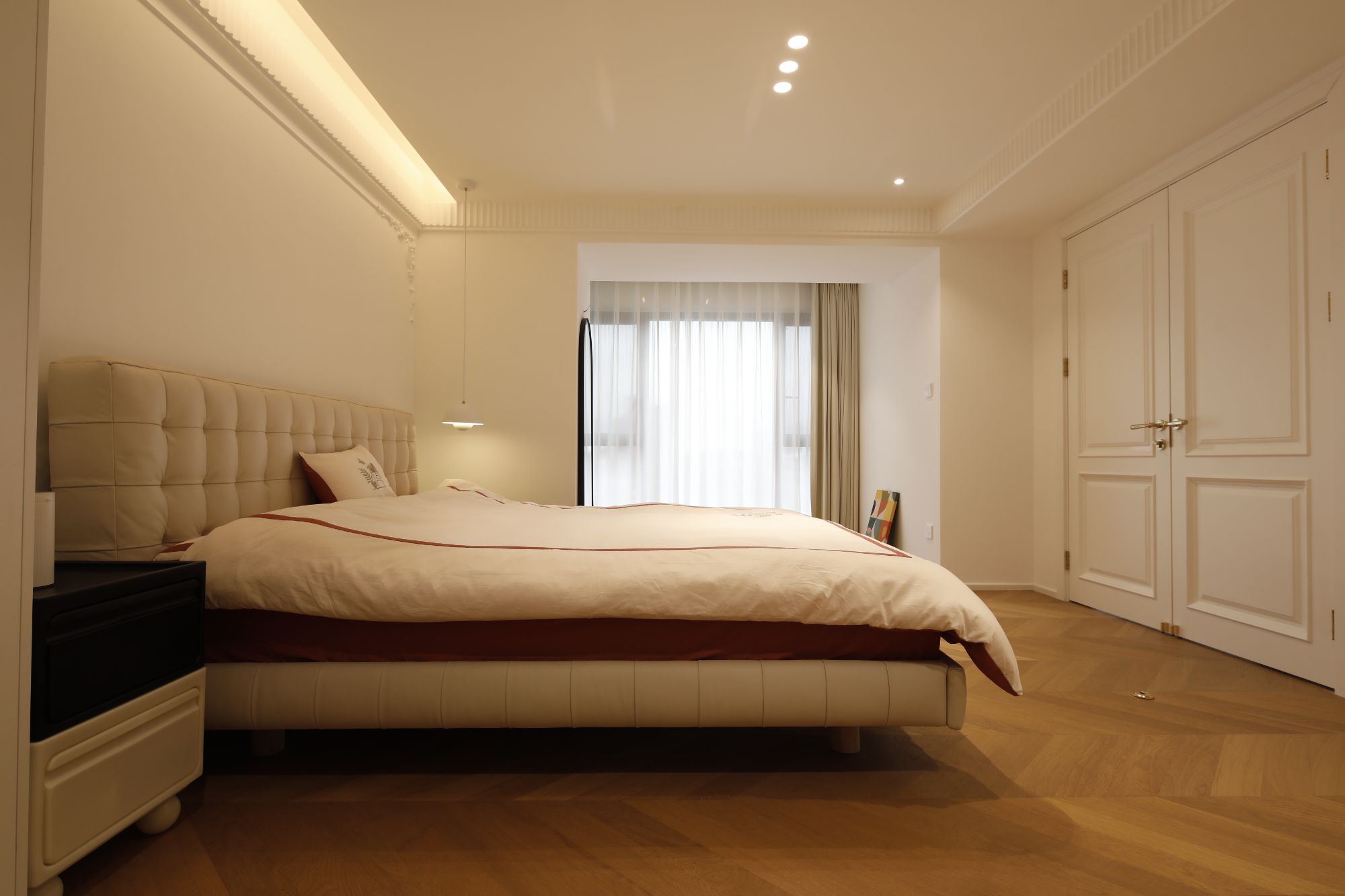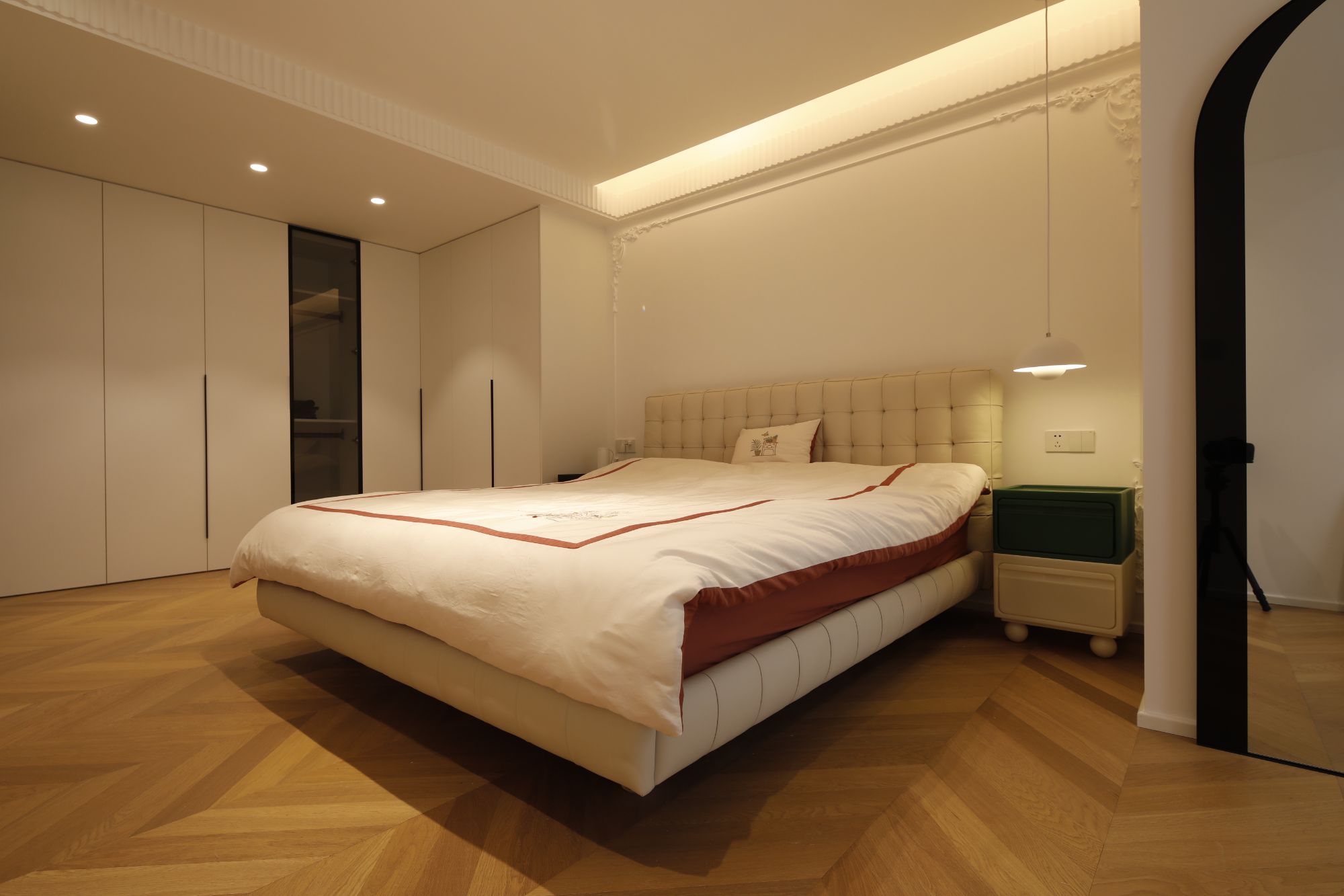 咱有一說(shuō)一,90后的臥室,簡(jiǎn)直拒絕平庸,要求獨(dú)具一格,拓寬原始的門(mén)洞,規(guī)劃雙開(kāi)門(mén)出入的儀式感。夜晚歸家,推開(kāi)門(mén)的剎那間,仿佛穿越到法國(guó)貴族的府邸。脫下鞋子,輕輕放在地上,