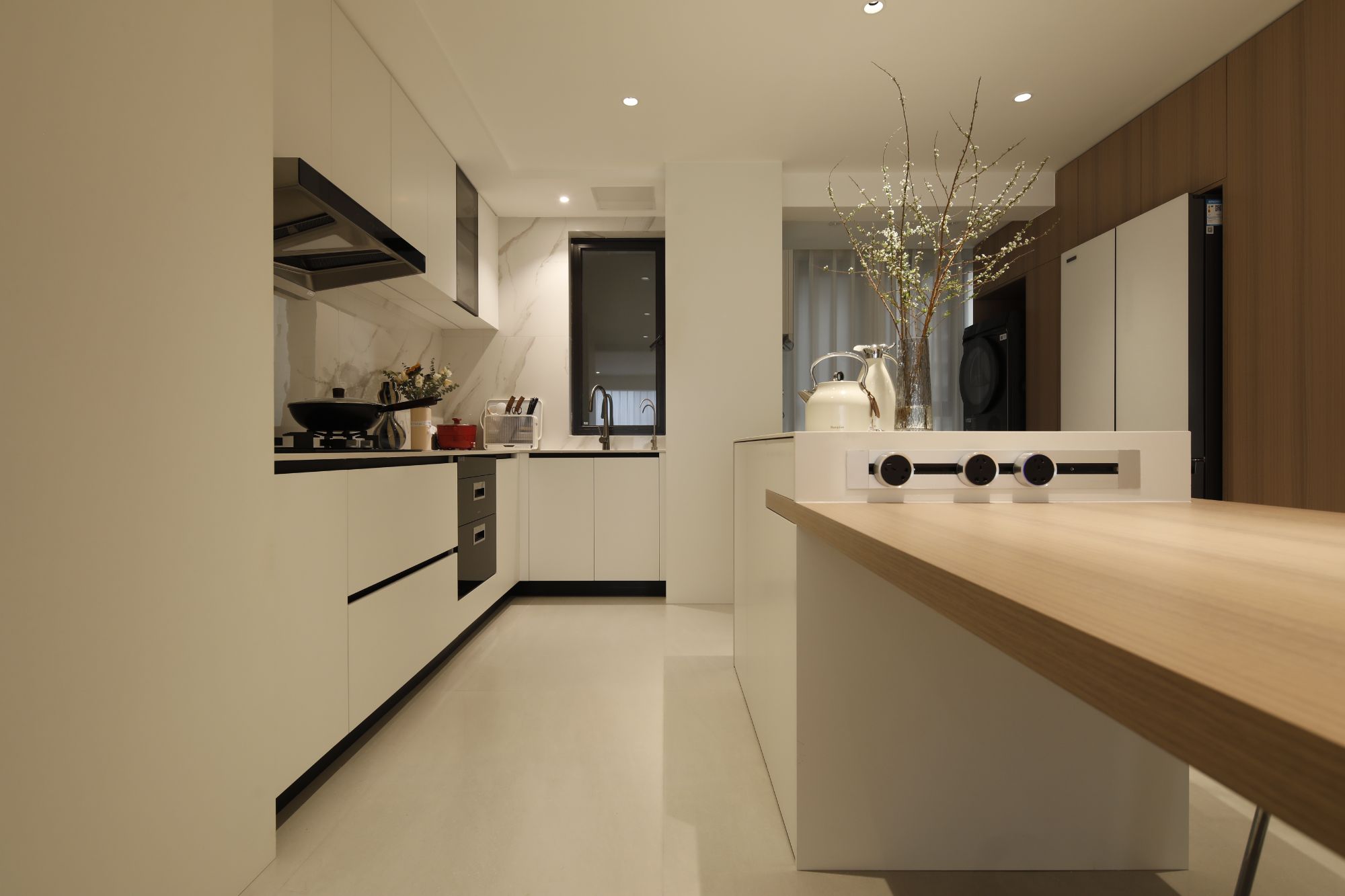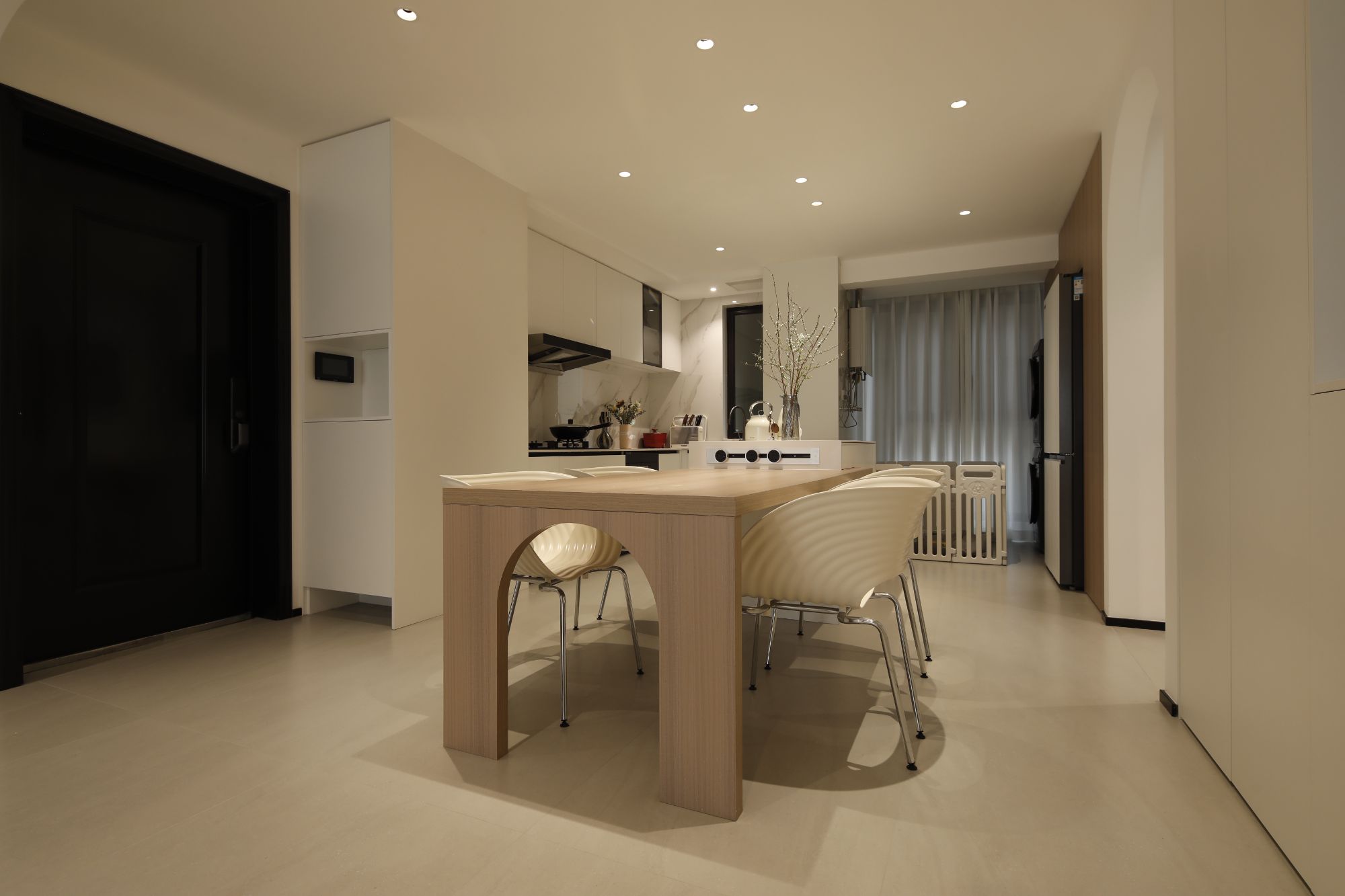 家有“毛孩子”,活動(dòng)空間必定要寬敞!拆掉客廳與陽(yáng)臺(tái)之間的墻體,拆掉餐廳與廚房之間的墻體,并且摒棄了傳統(tǒng)的電視柜和電視布局,采用畫(huà)境電視,從而形成全開(kāi)放式客餐廳。