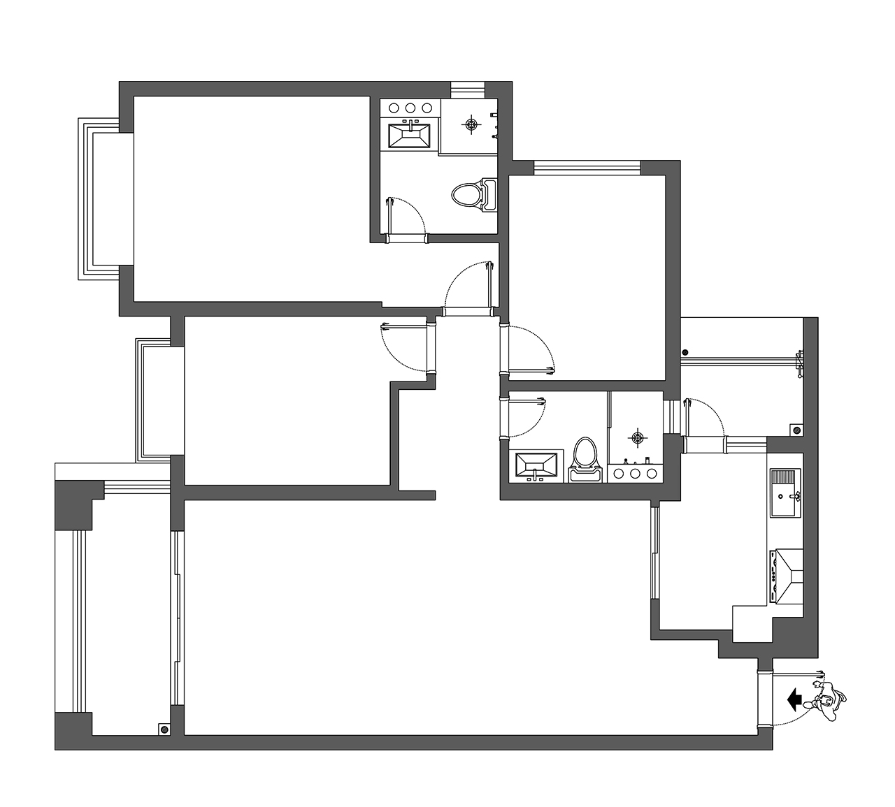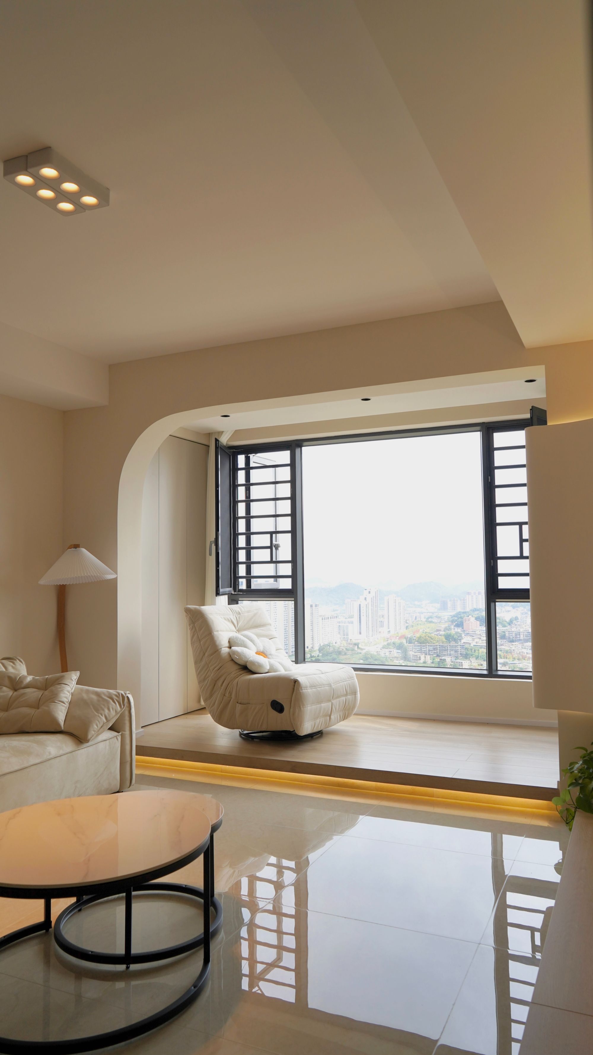 2、拆掉陽臺方方正正大門框,做弧形隔斷,用地臺與弧形隔斷做劃分,增加柔和感,空間也更大。