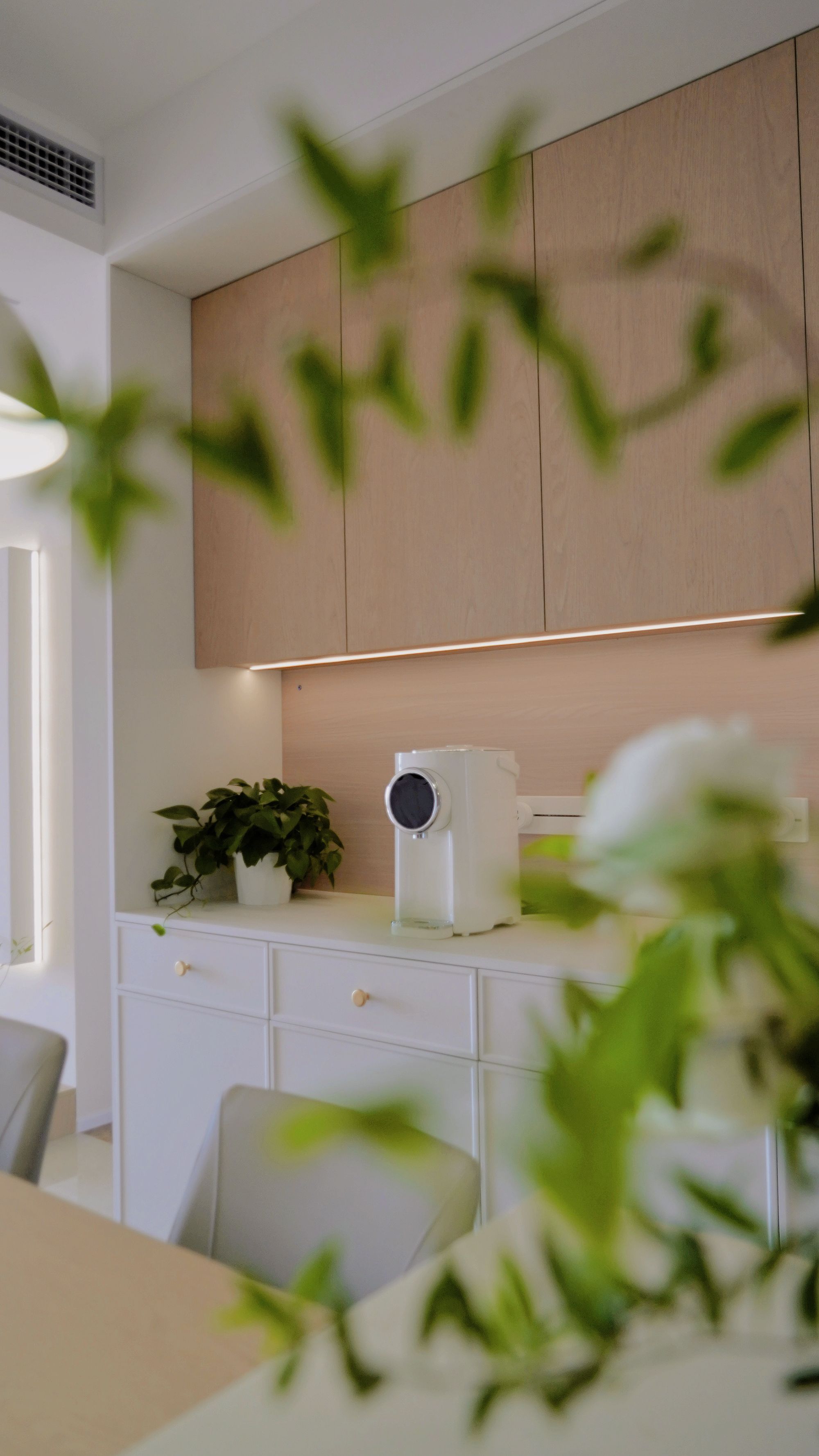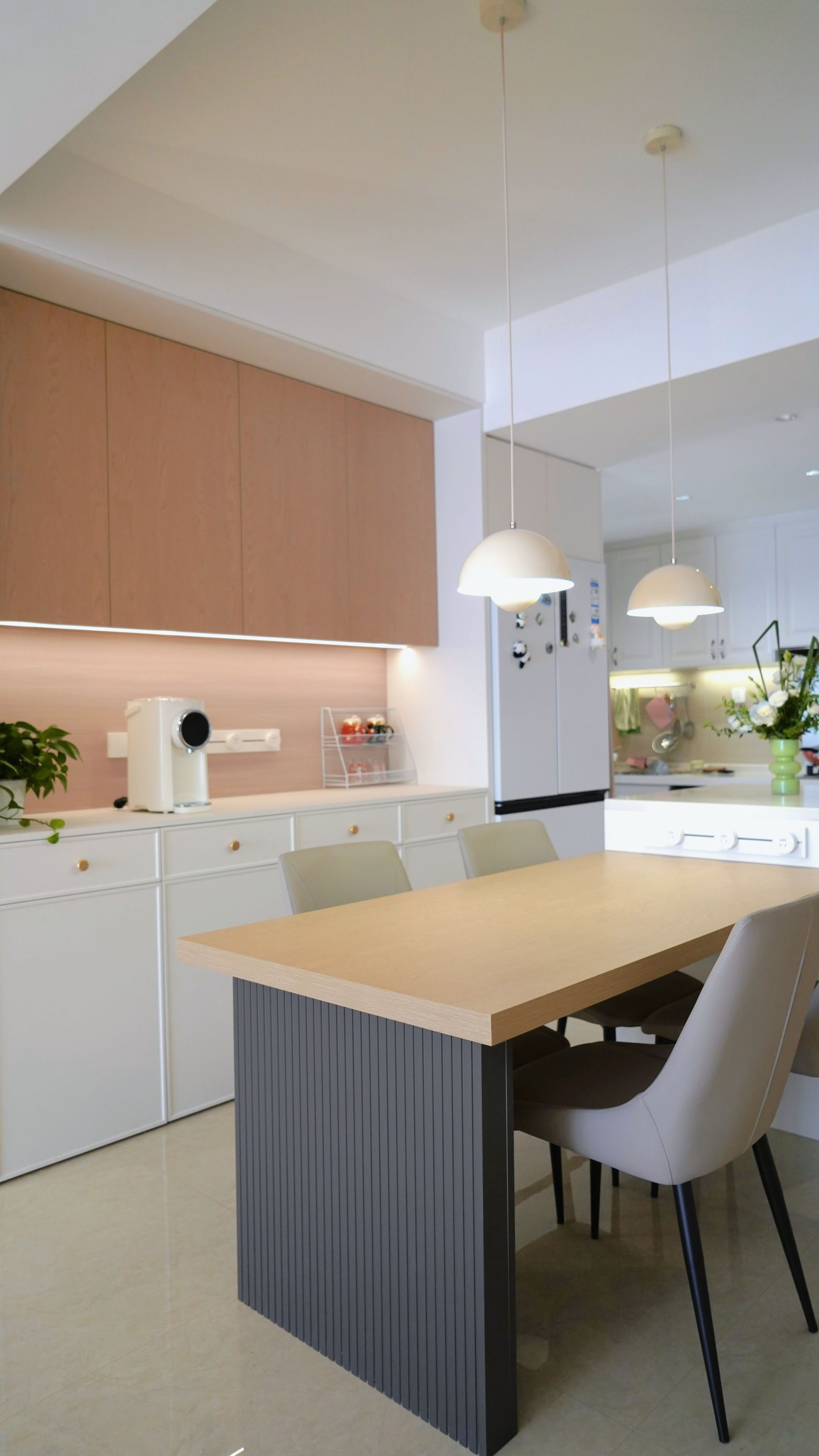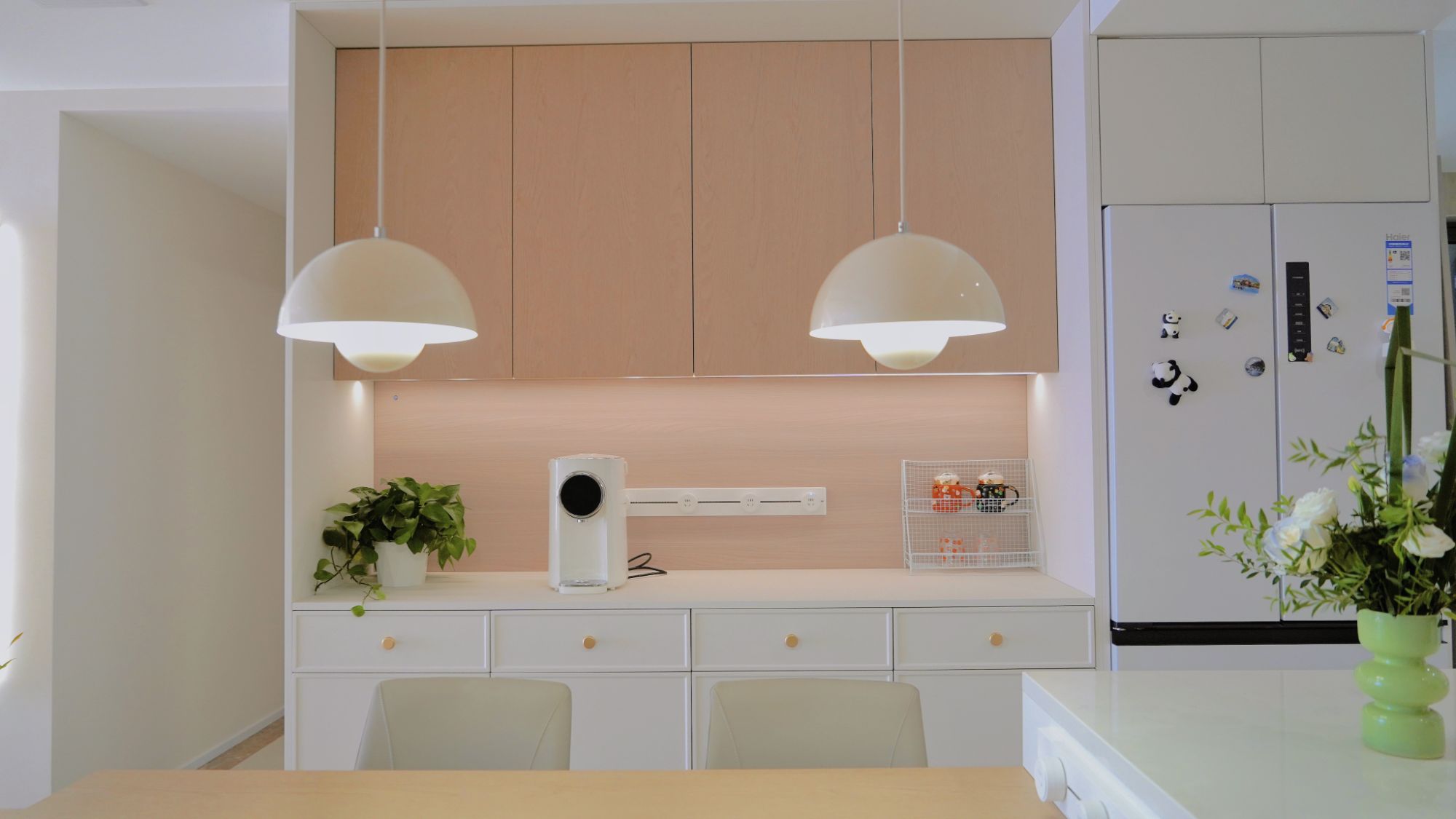 餐廳的氛圍制造C位必定是flowerpot花苞燈,讓整個餐廳溫馨十足,在這里吃個飯簡直幸福感爆棚。定制的一體式餐桌+吧臺一體,形成非常棒的互動關(guān)系喝咖啡、做烘焙、以及未來為孩子泡奶粉……都不必再進入廚房一個轉(zhuǎn)身,就能完成全部動作,點點幸福都在這里生長~