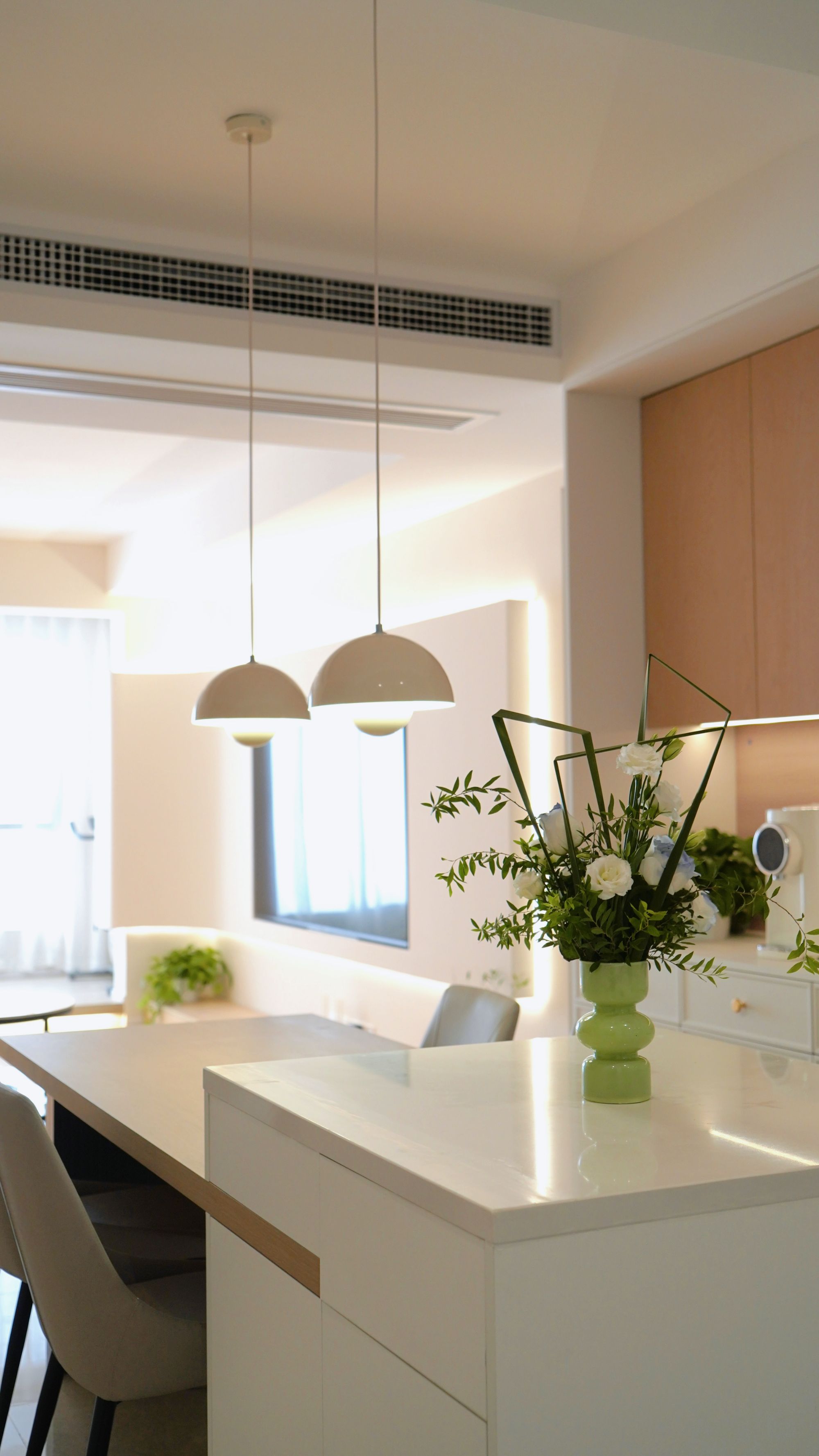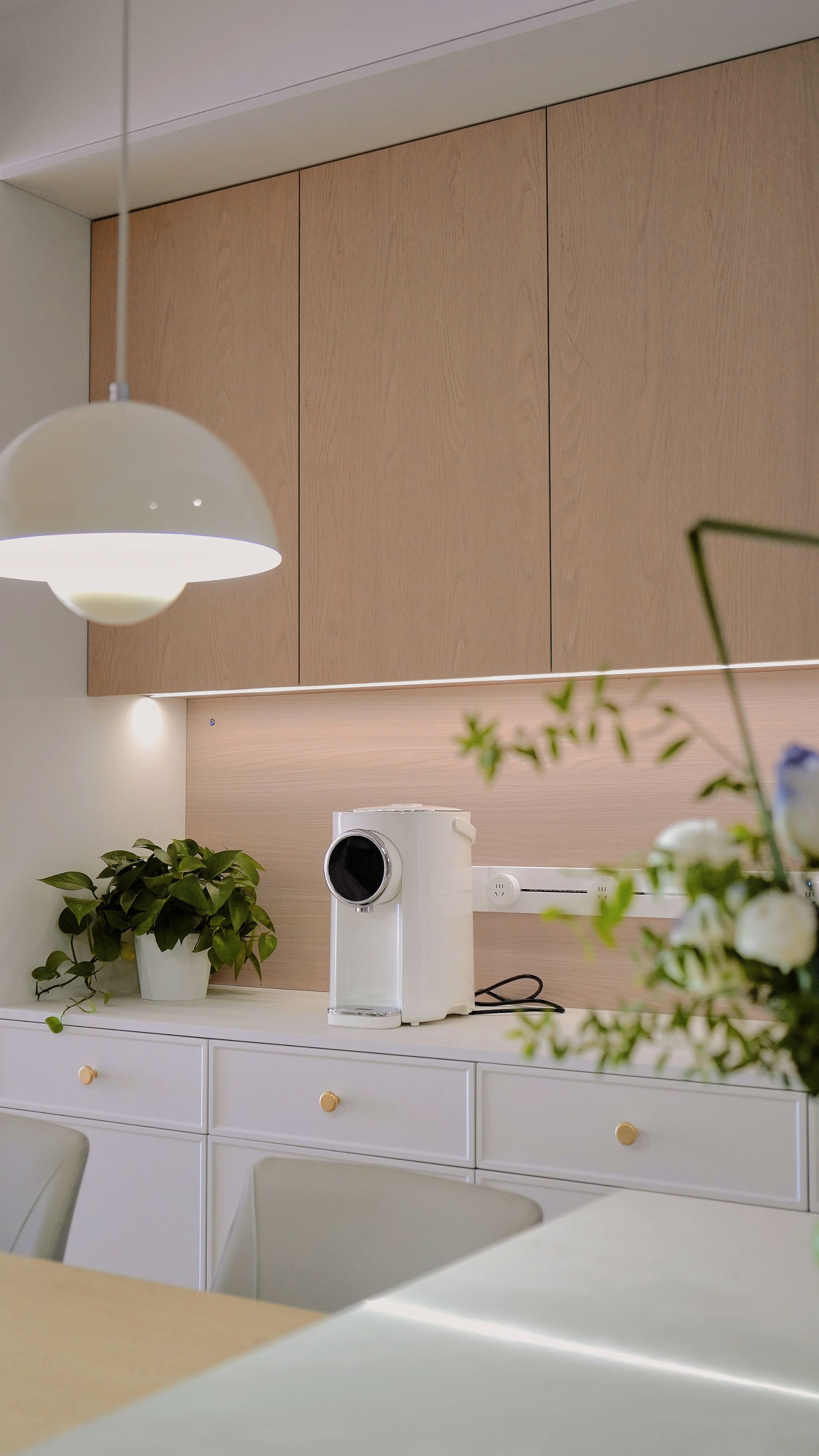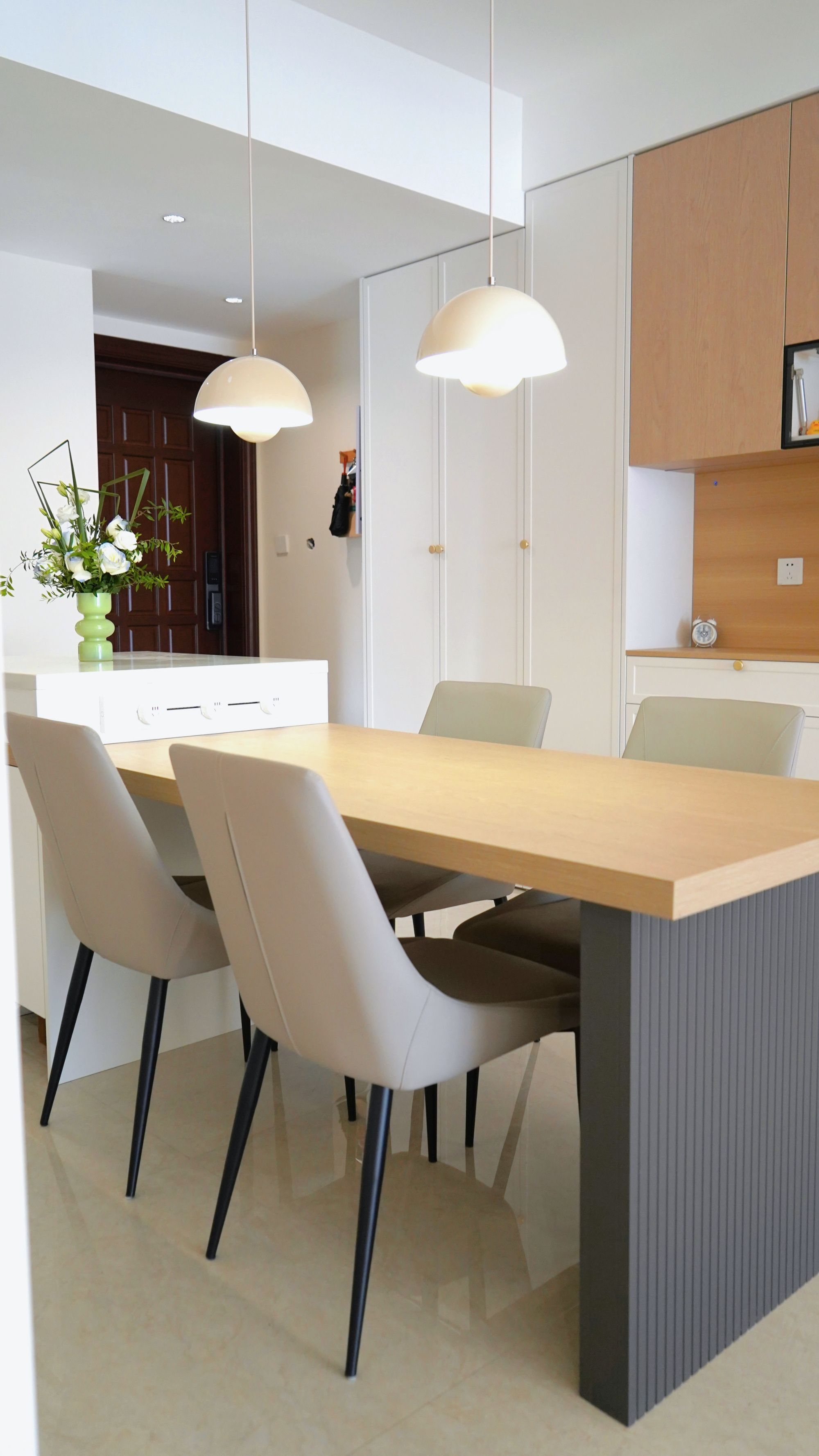 餐廳的氛圍制造C位必定是flowerpot花苞燈,讓整個餐廳溫馨十足,在這里吃個飯簡直幸福感爆棚。定制的一體式餐桌+吧臺一體,形成非常棒的互動關(guān)系喝咖啡、做烘焙、以及未來為孩子泡奶粉……都不必再進入廚房一個轉(zhuǎn)身,就能完成全部動作,點點幸福都在這里生長~