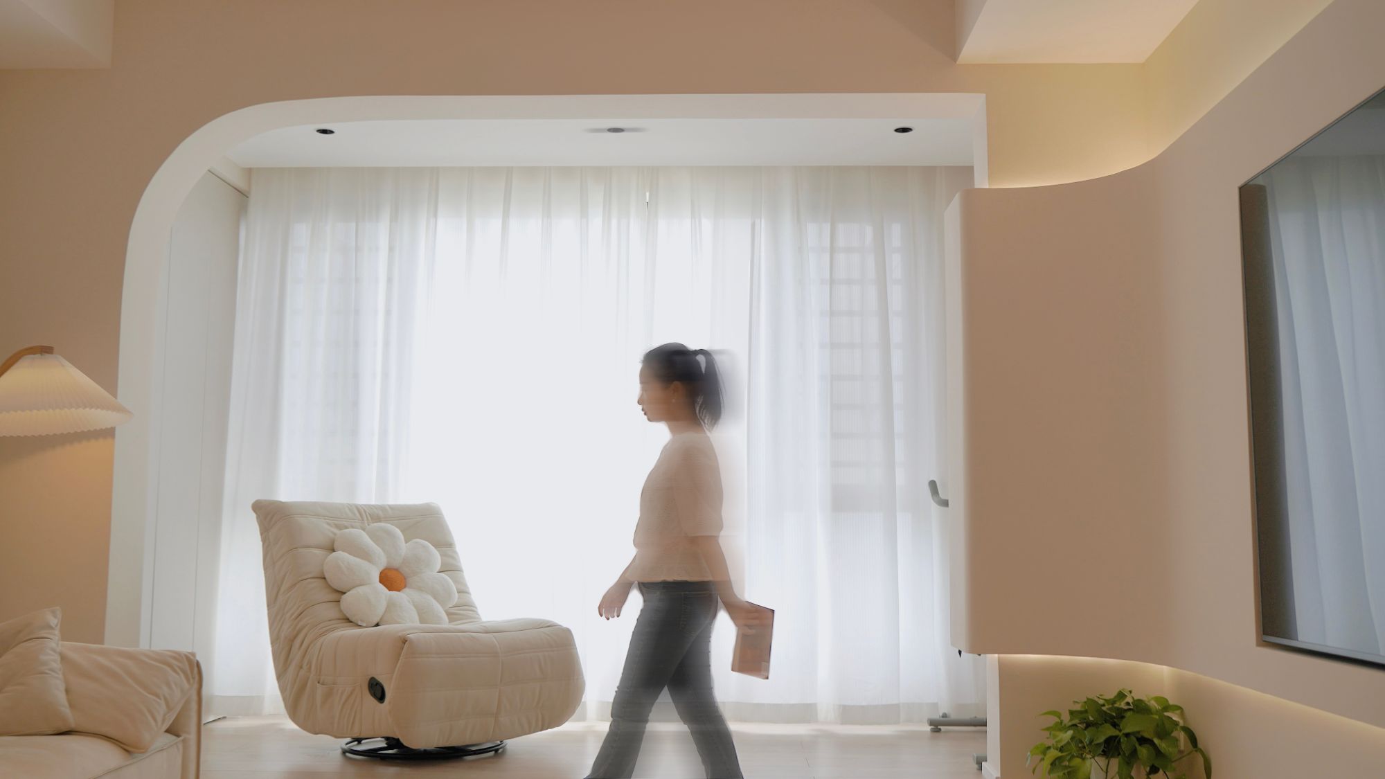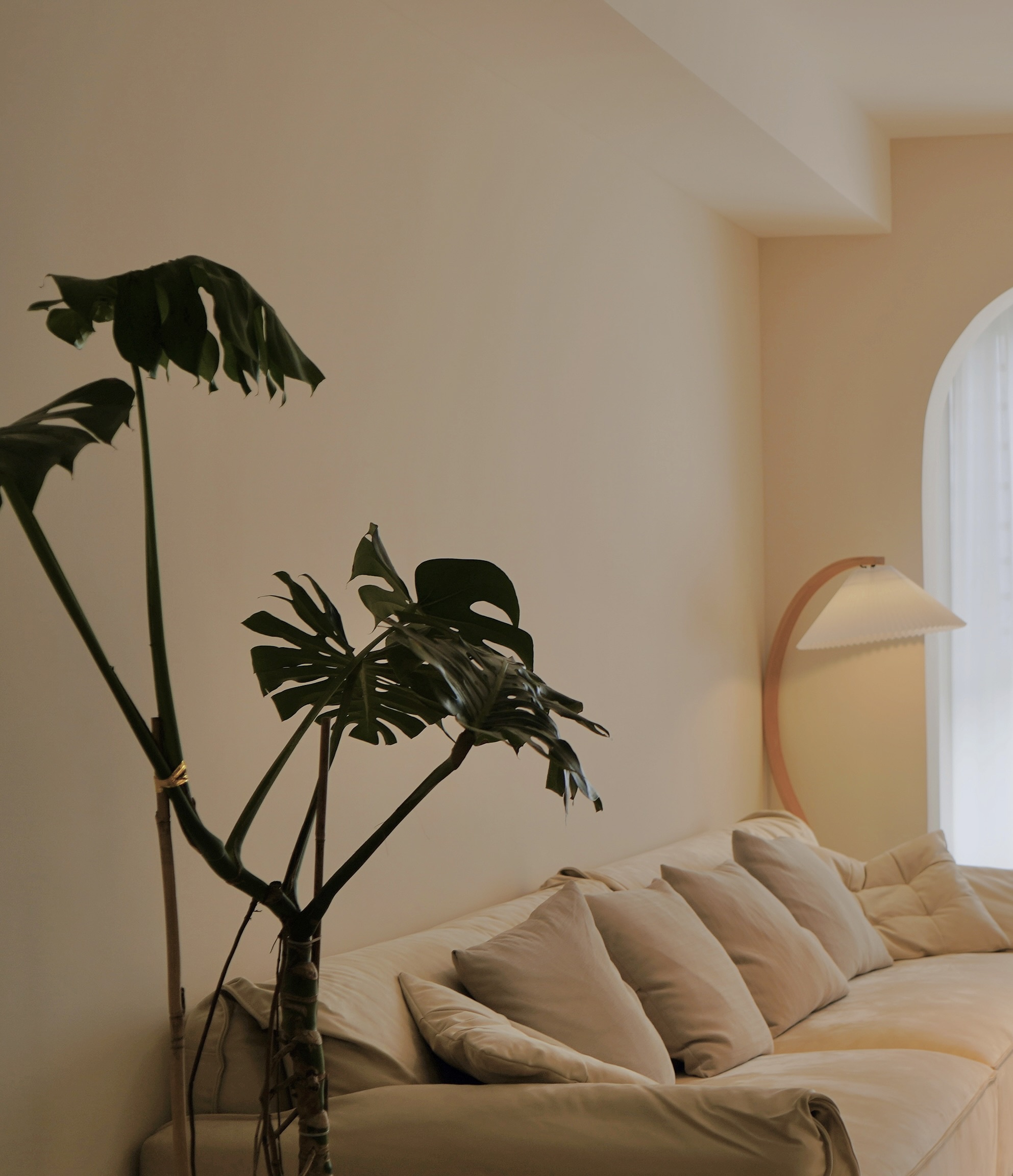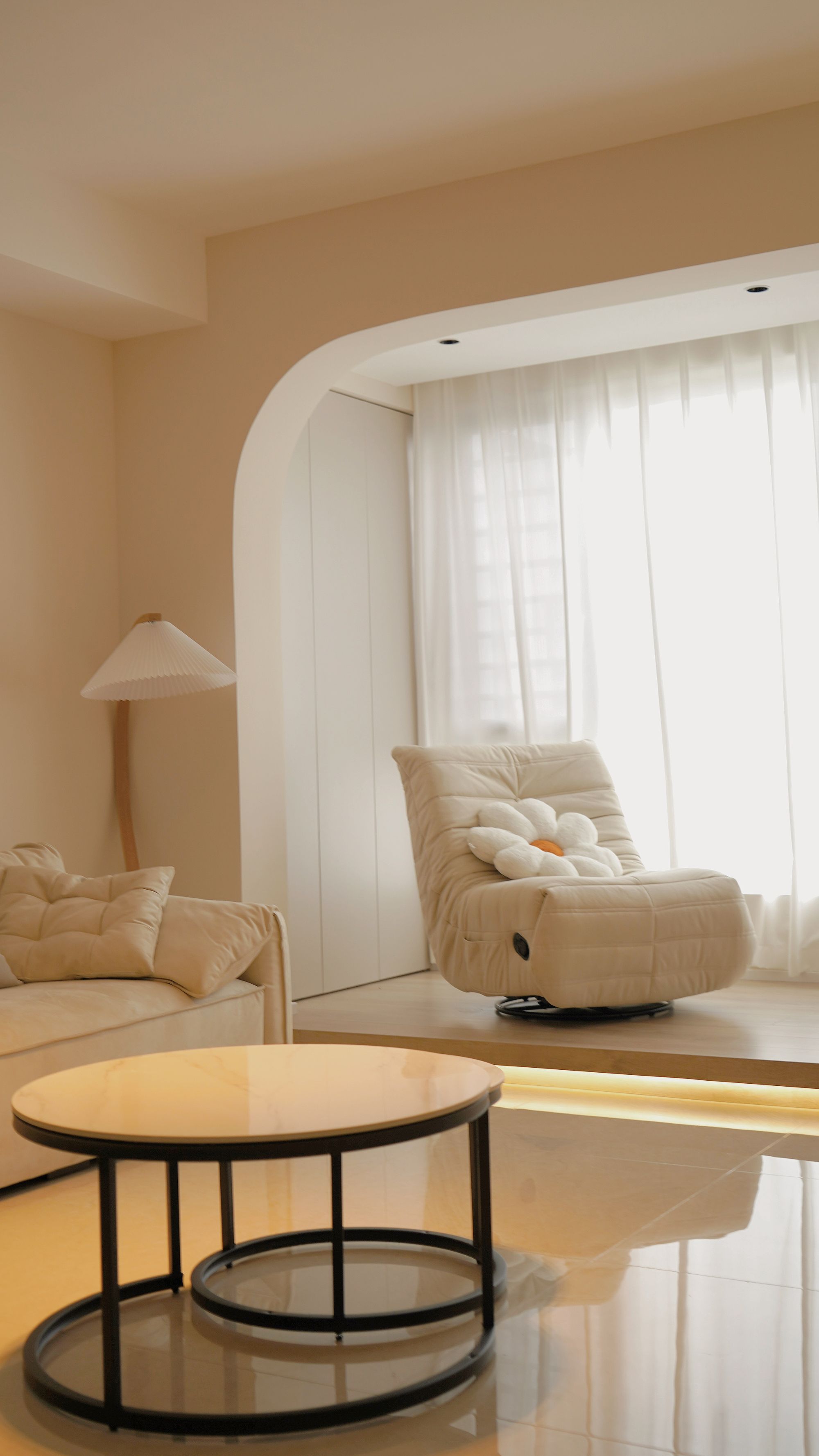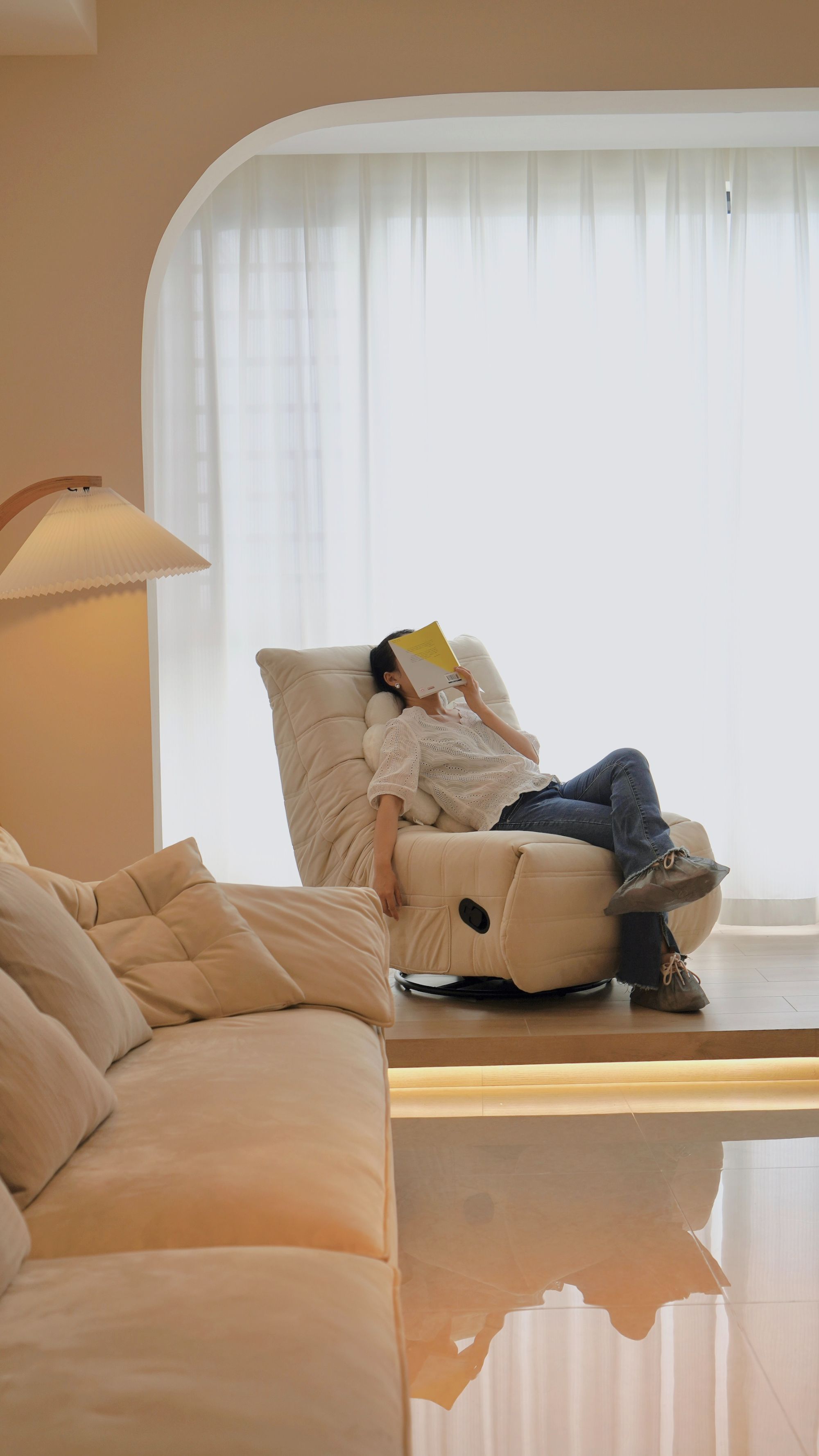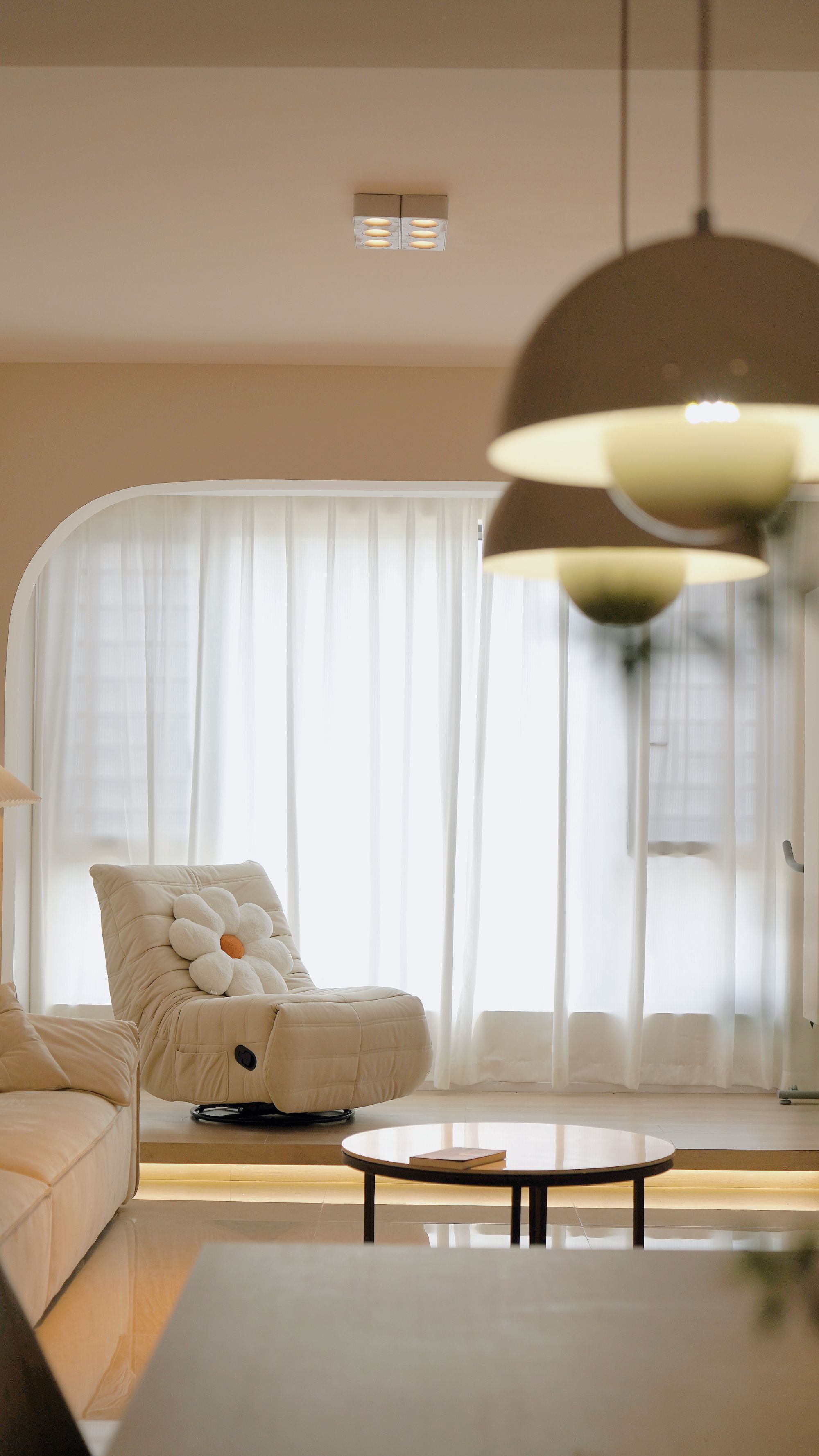身為顏控,貝貝無法容忍方方正正的門框在自己的家,于是拆掉,弧形隔斷安排上,增加層次感。增設(shè)地臺,內(nèi)嵌燈帶,與舒適的毛毛蟲椅搭配在一起清新、治愈,成為了Evan與貝貝在家中的居心地~當貝貝坐在毛毛蟲椅上看書,Evan在地臺的另一頭健身,也能夠彼此對望充滿甜甜的幸福感~