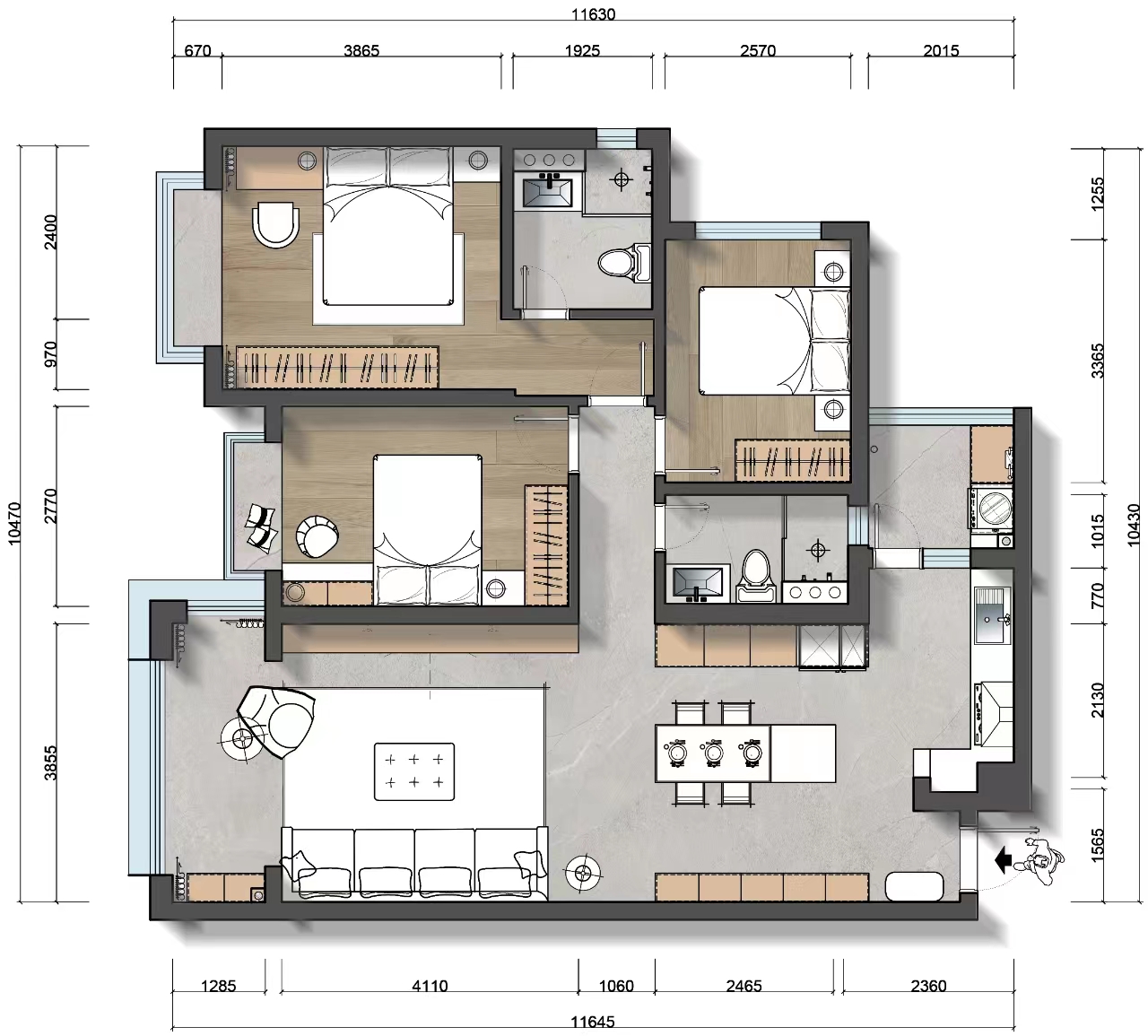 3、舍棄千篇一律背景墻,丟掉土氣大吊燈,做無主燈外置筒燈做圓弧造型增加層次感,燈帶讓整屋氛圍感滿滿。
