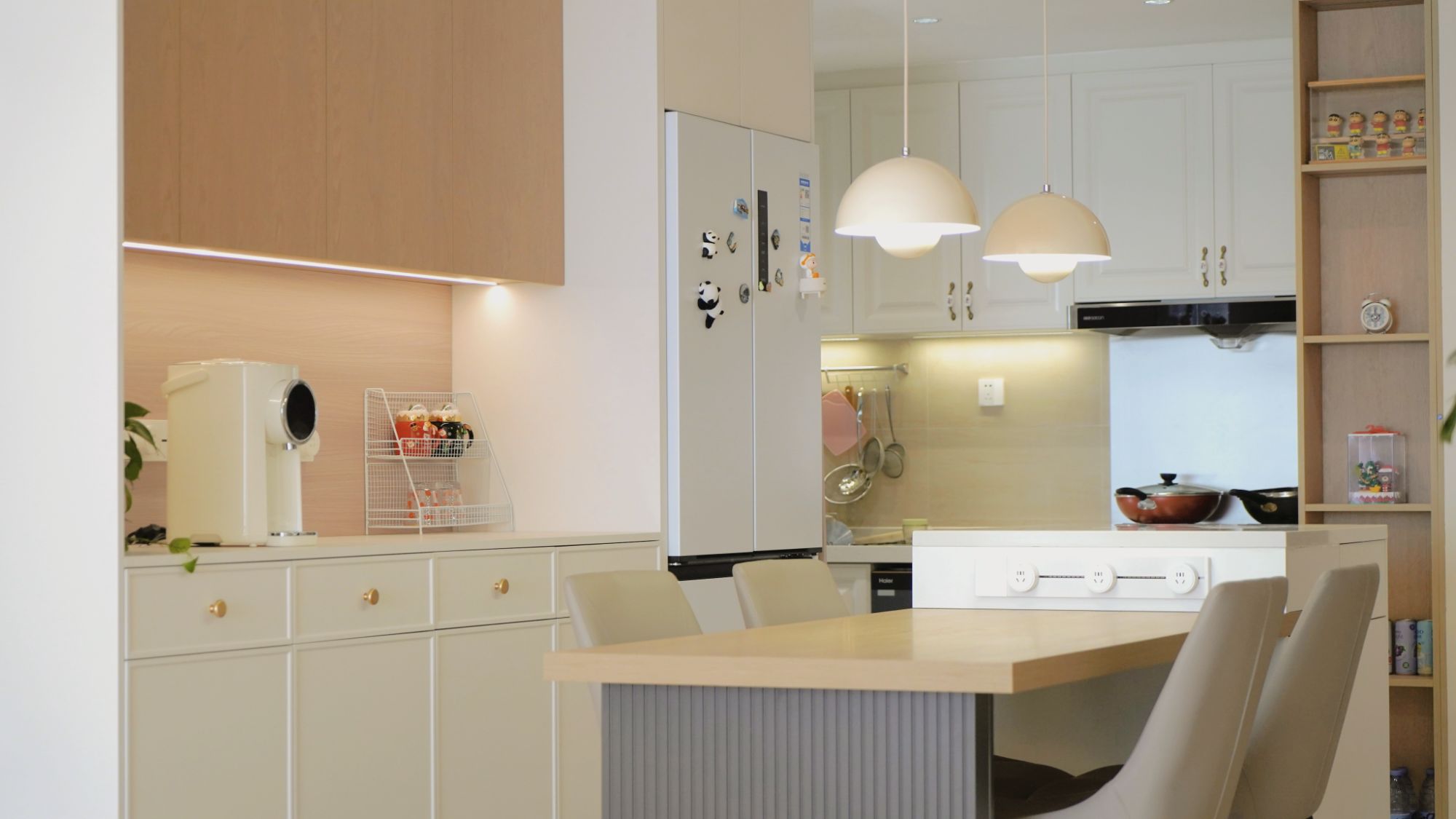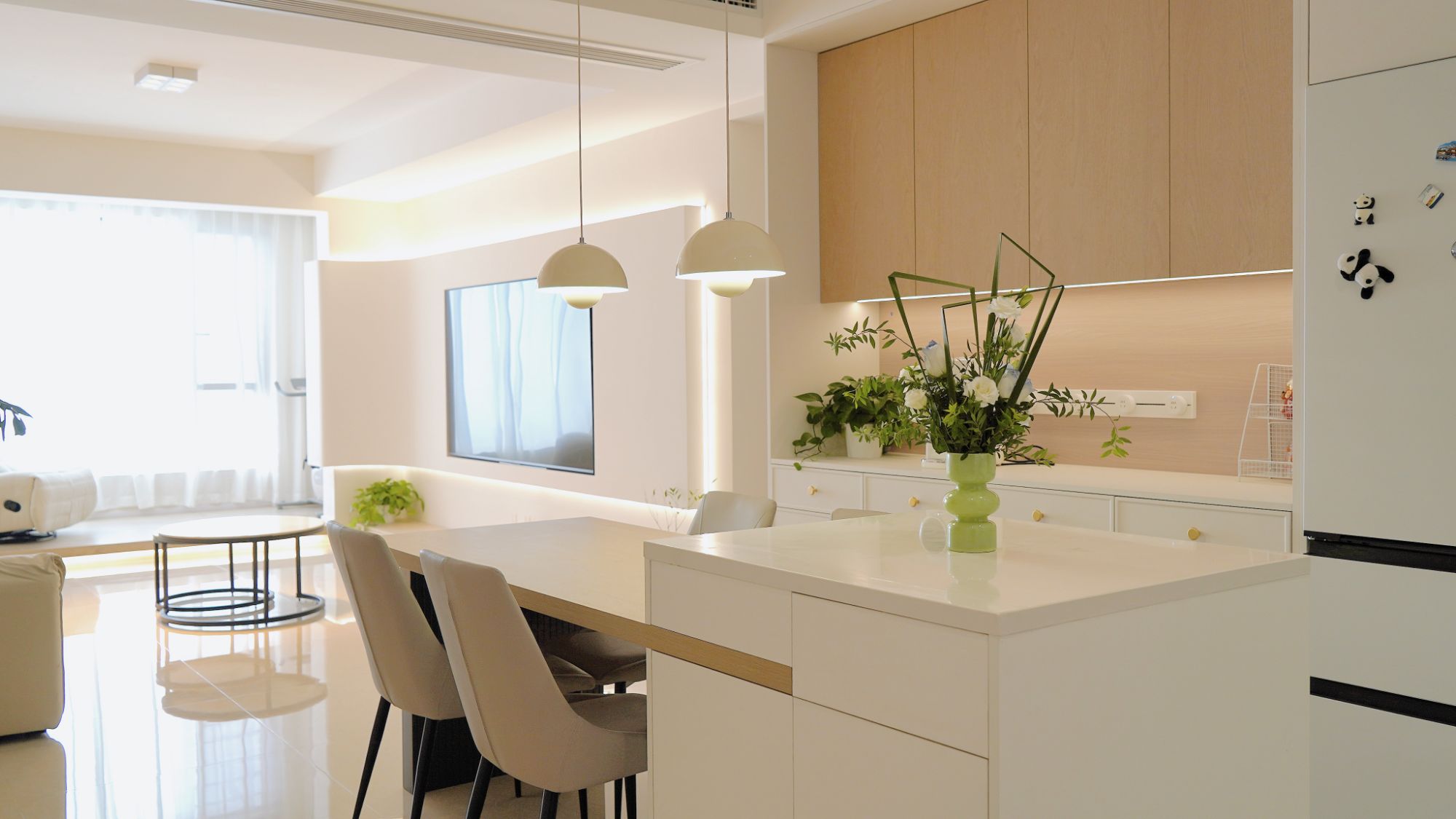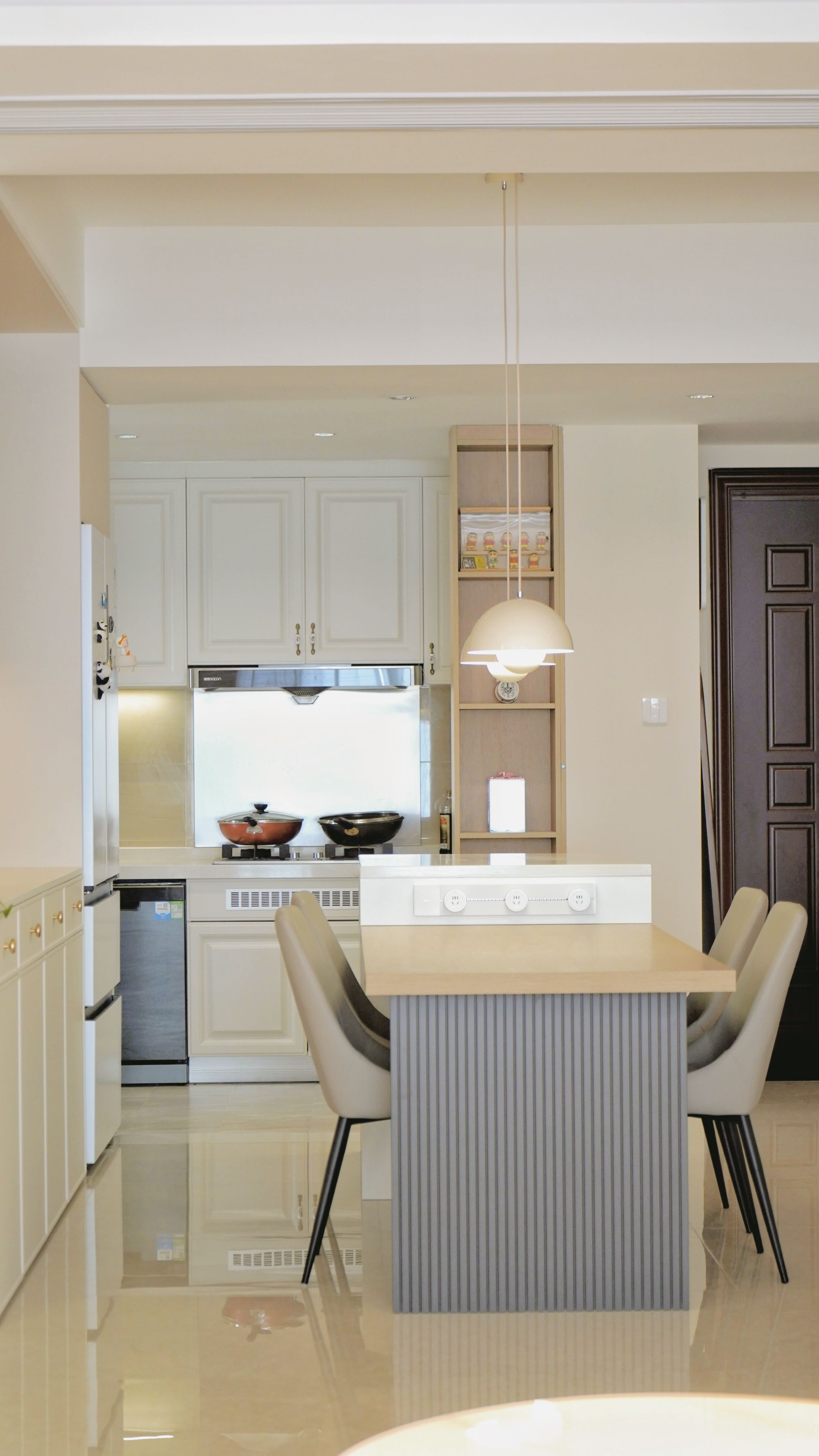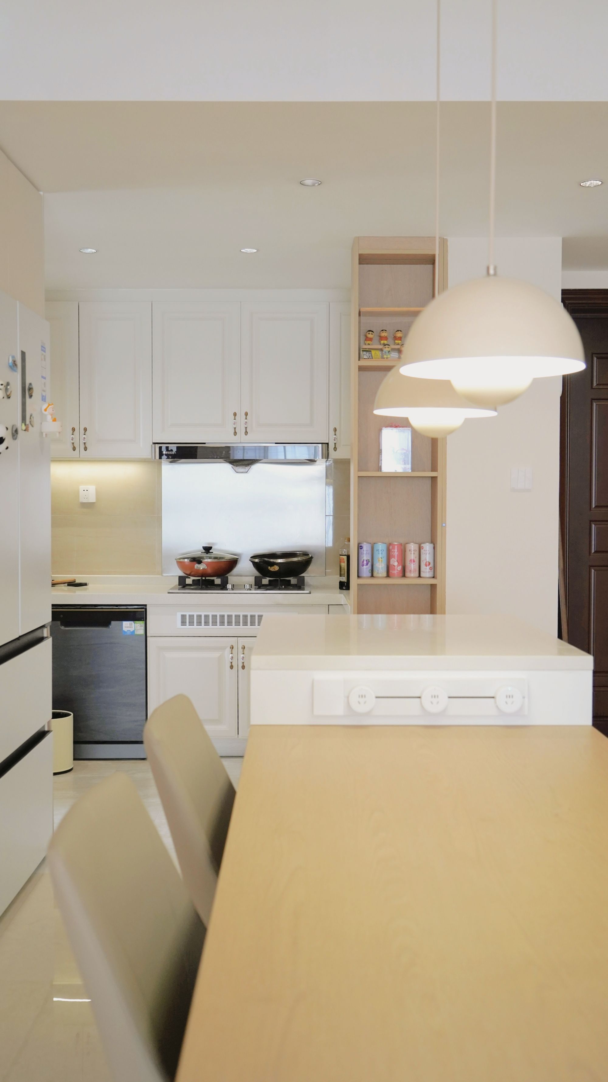 傳統(tǒng)封閉式廚房,不喜歡,那就砸掉!做開放式餐廚一體。砸掉的廚房墻體制作了開放格,用于擺放Evan和貝貝的小物件!視野寬敞,整潔明亮讓下廚隨性而舒適,輕松為彼此料理三餐滋養(yǎng)著整個家的能量。