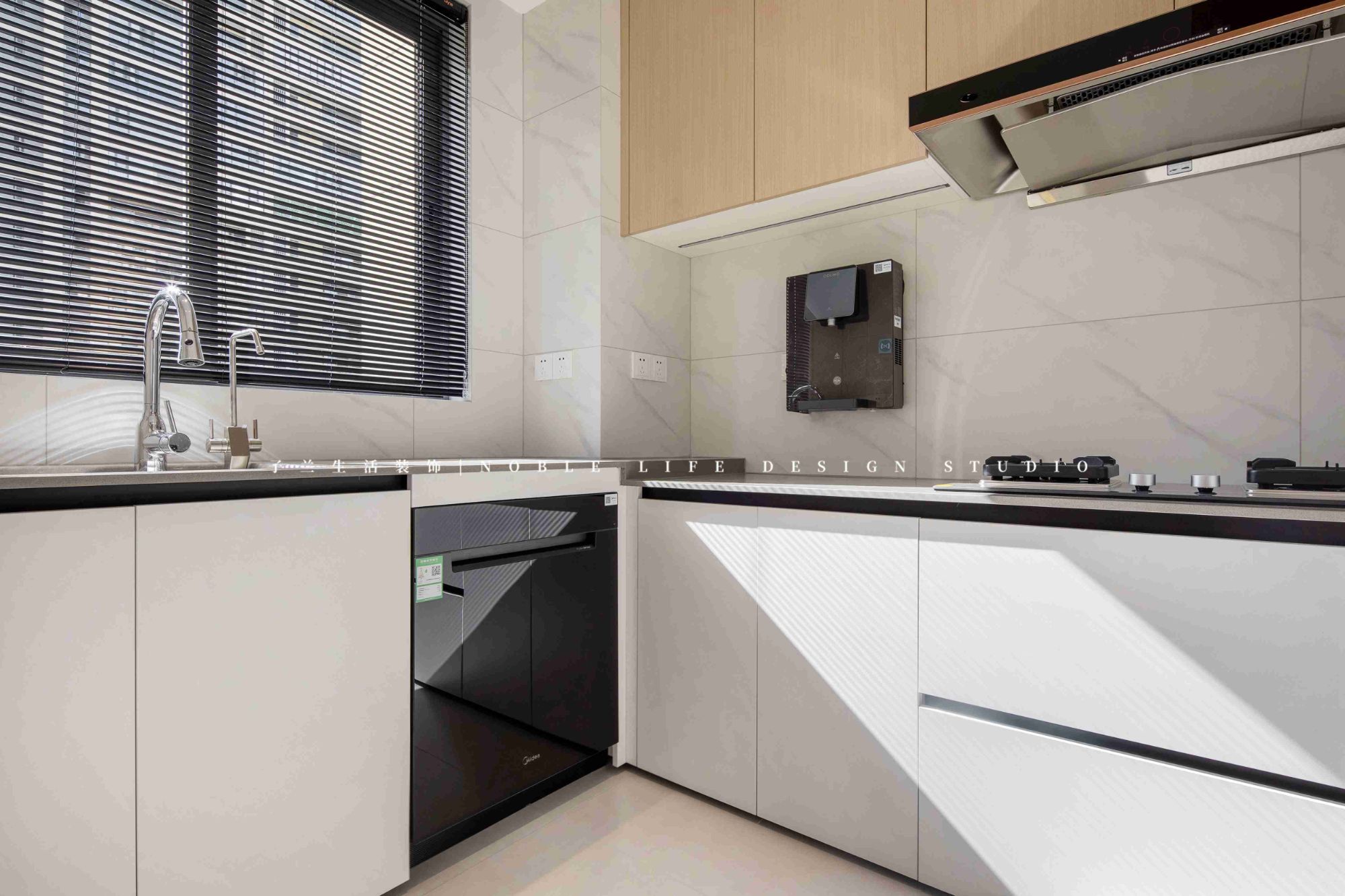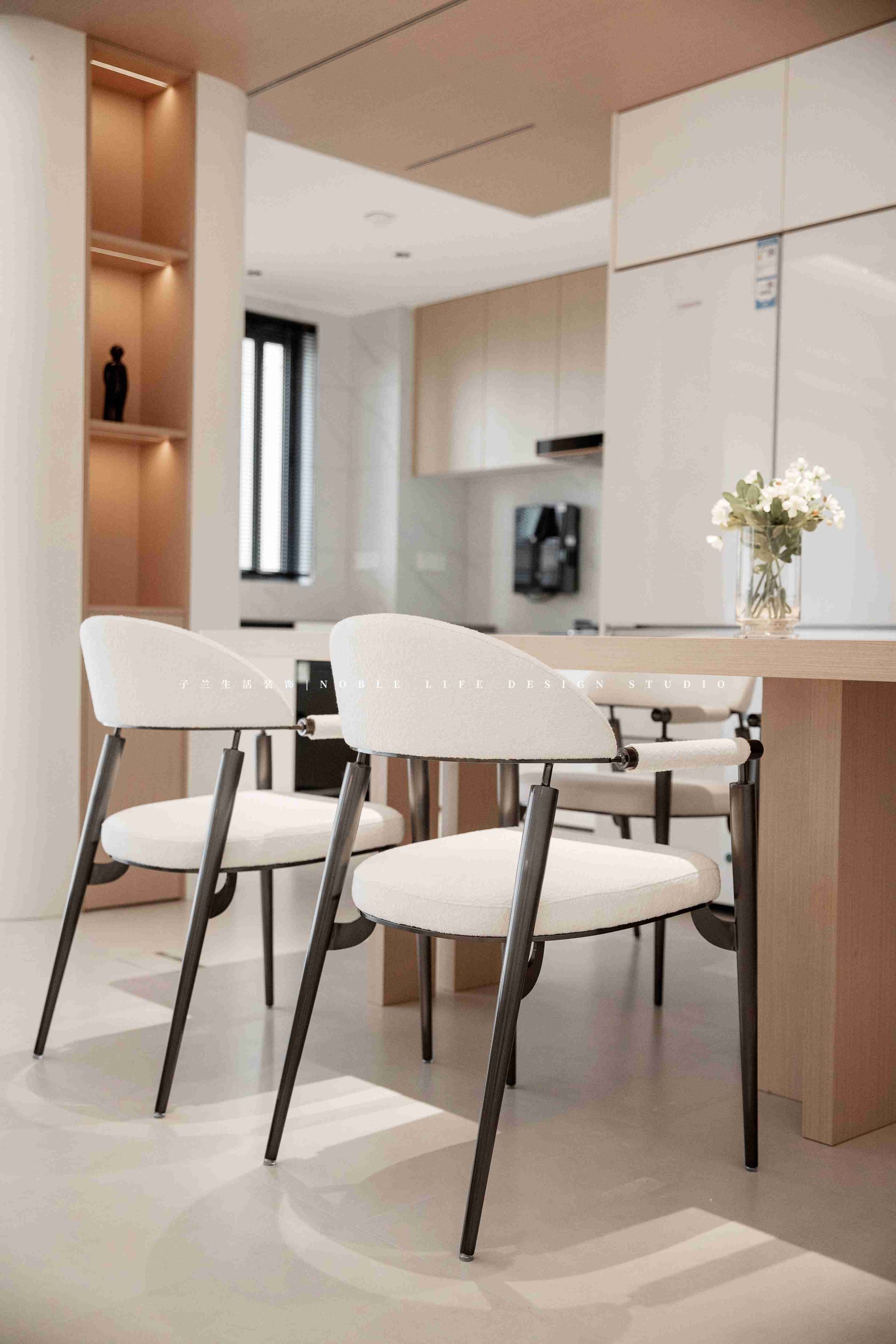 右側(cè)則是拆掉廚房的一面墻,擴(kuò)大原本的廚房空間。重新規(guī)劃餐廚動線,打造一組60cm的深柜,既可做餐邊柜,又可做廚房補(bǔ)充柜。