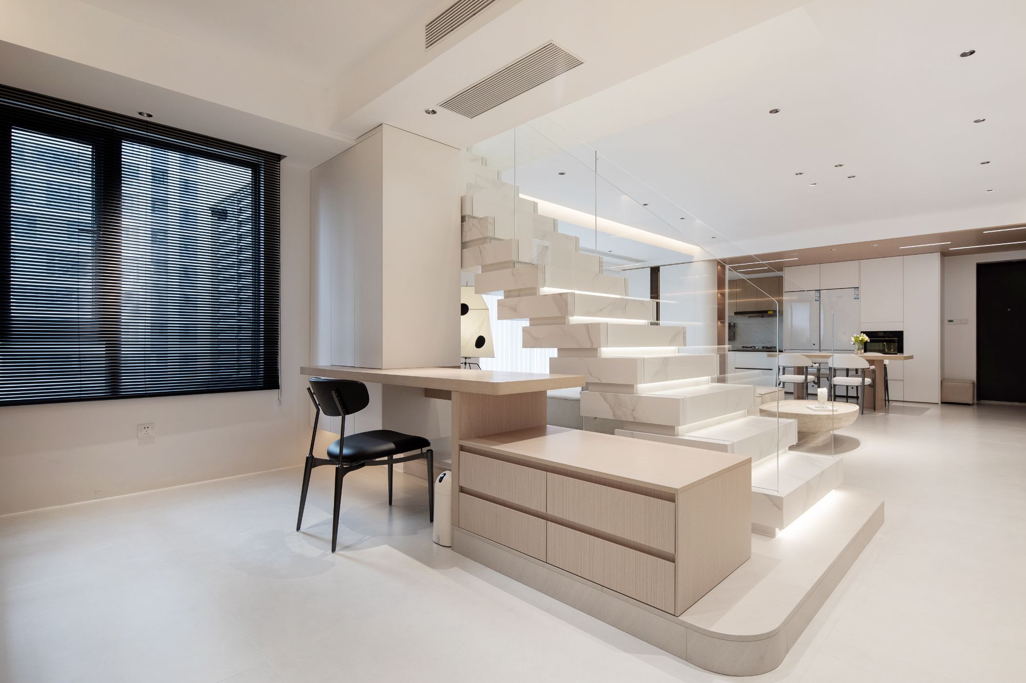 樓梯背后便是開放式書房,不能拆的承重墻做一個懸浮書桌,并在樓梯的延長階梯上打造一組矮柜,主打一個:不放過任何可以做收納的空間。靠墻打造整面書柜,一門到頂+開放格組合,可以放置館長先生和小藝小姐的書籍。