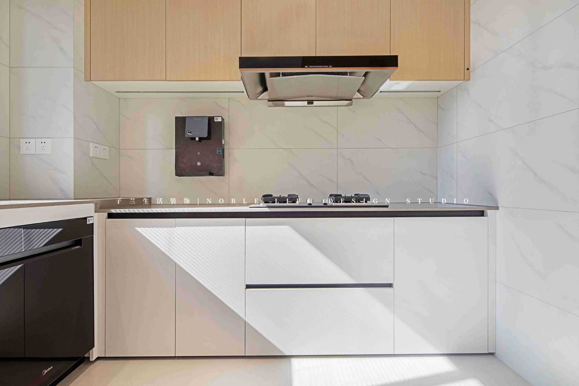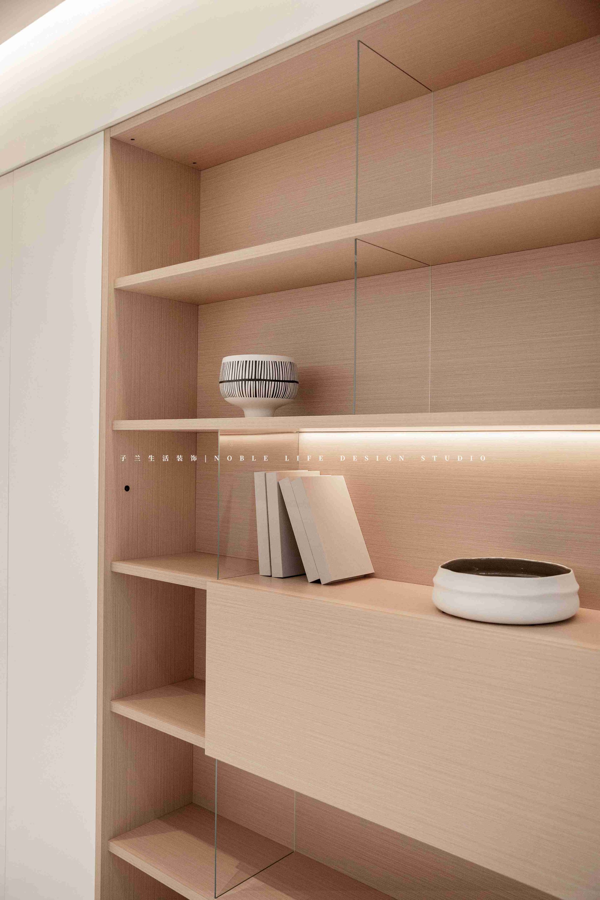 廚房與餐廳的轉(zhuǎn)角,上方做成壁龕擺放飾品,下方抽屜存放一些紙巾盤子等,背后再是一面的客廳雜物收納柜。