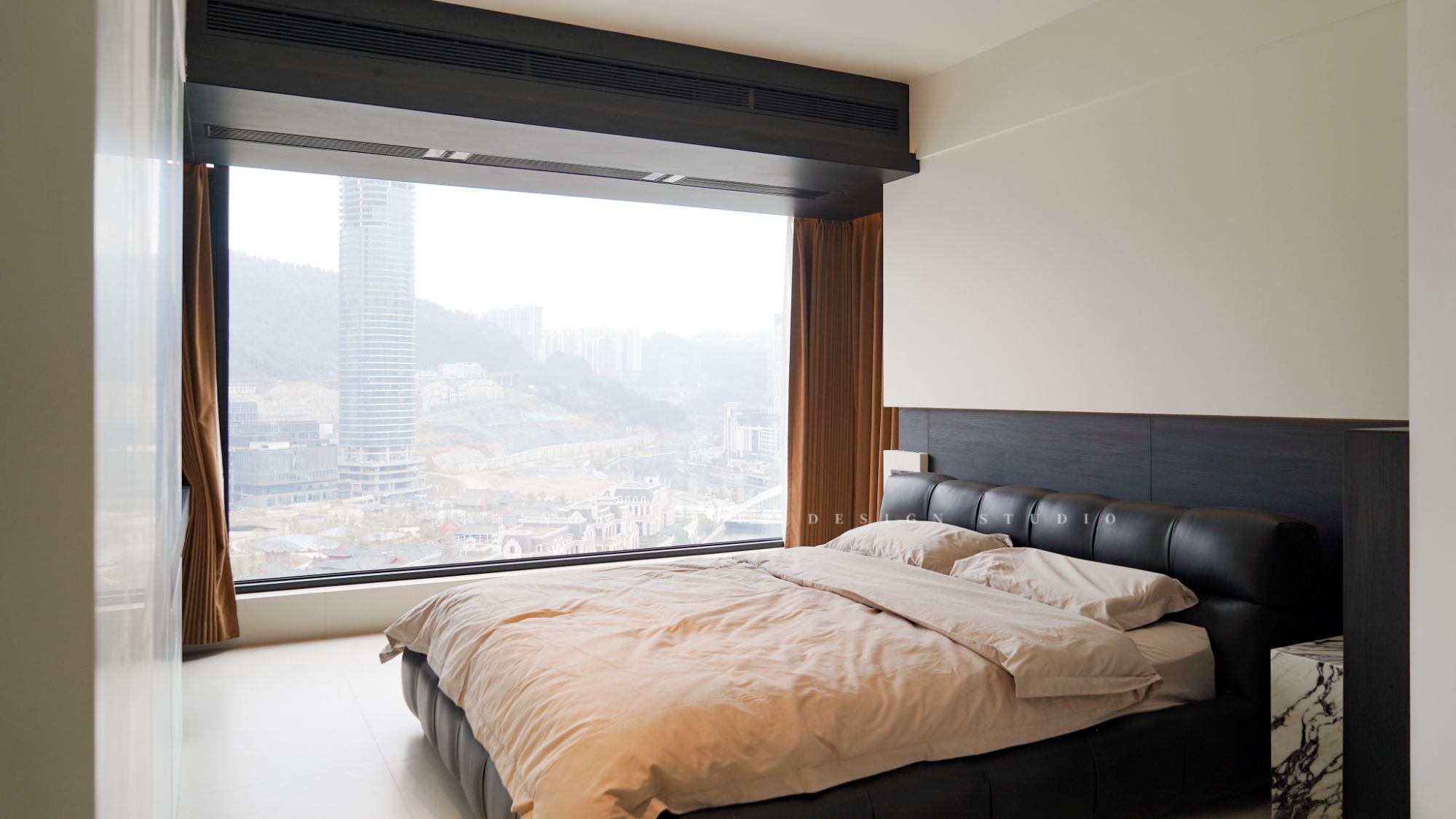 主臥主打簡潔,簡單的黑白搭配,床尾一整面同色系衣柜,2.8m長的落地窗,美景盡收眼底,每個清晨,和煦的陽光似乎都在邀請她開始新的一天。