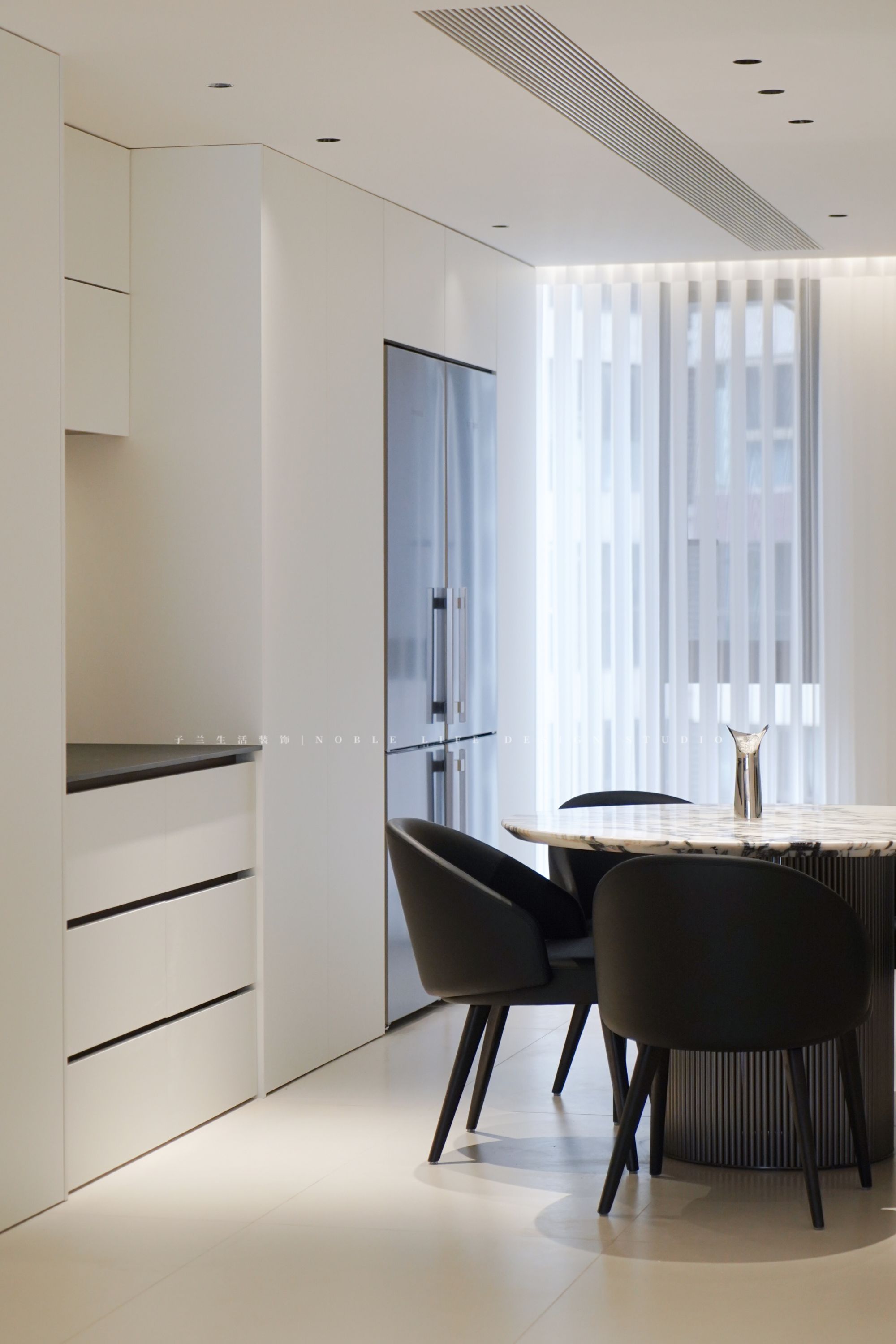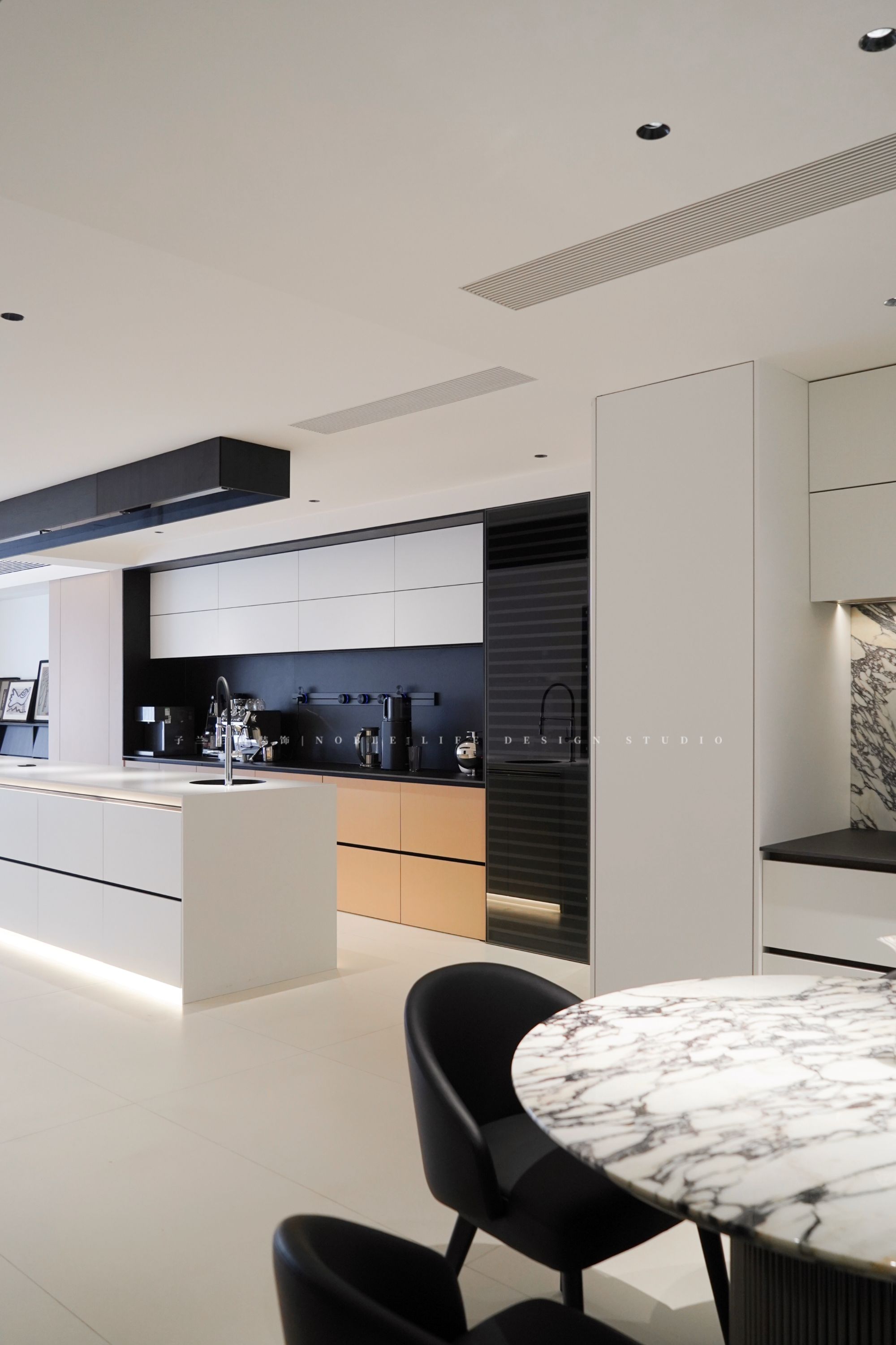 一進門便是緊挨著廚房的小餐廳,這個小餐廳是平時吃飯用的,一家三口在小餐廳的圓桌上,吃一頓正式的晚餐。往里走便是4.5m的島臺,可以輕松坐下14-16個人,是和朋友的聚會圣地,這么長的島臺,滿漢全席可以安排上。冷吃兔、紅燒肉、糖醋排骨,肉末豇豆、青筍肉片、蒜香烤大排……