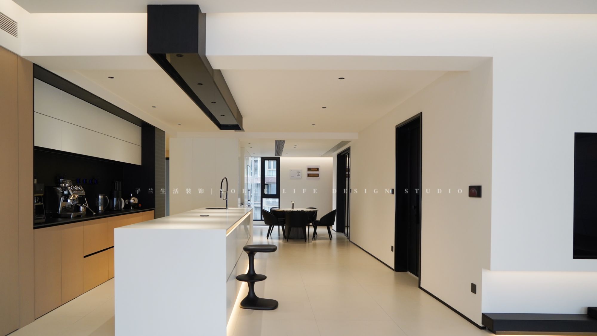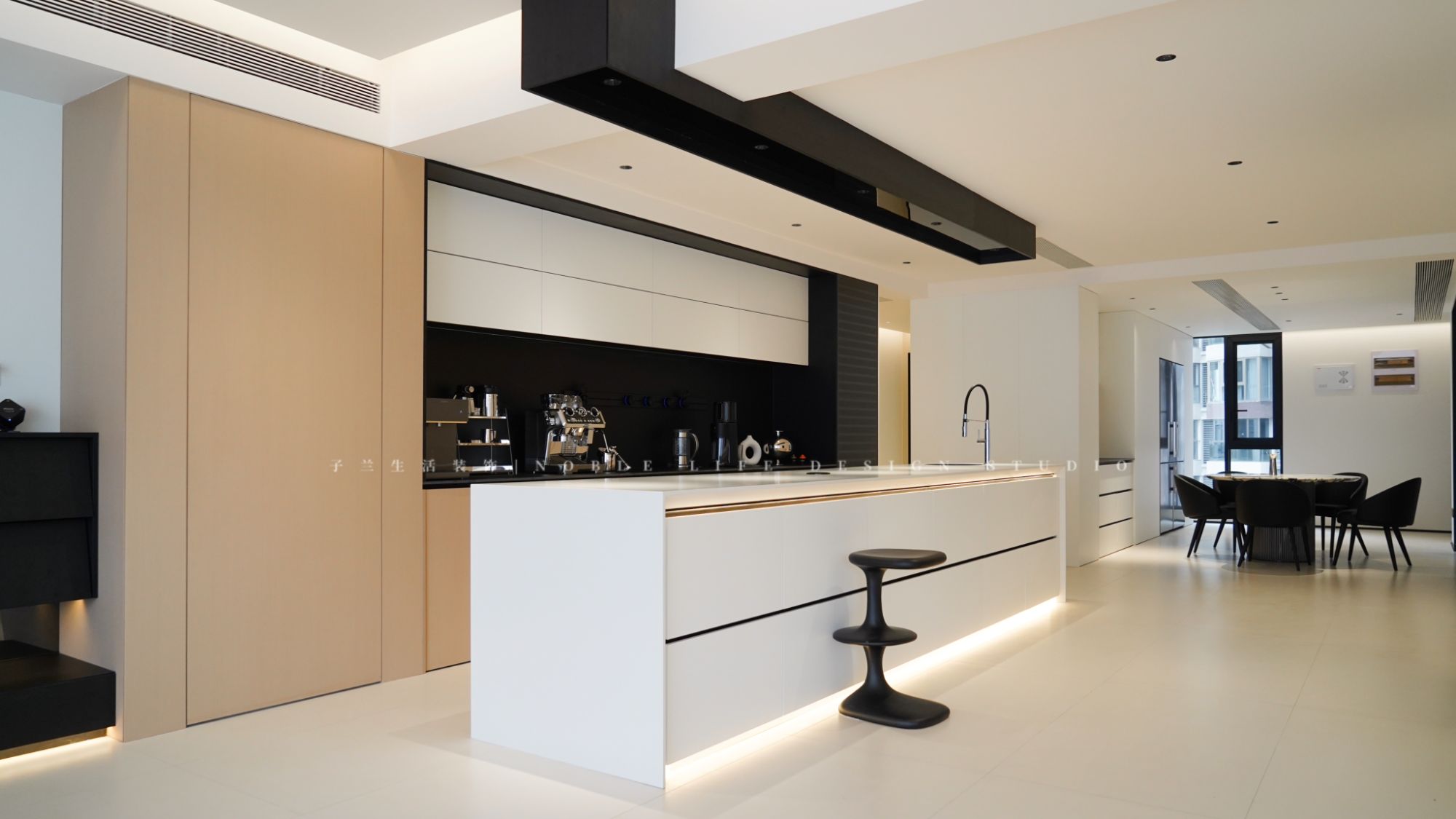 Yuki和先生在廚房里忙活的時候,朋友們圍坐在島臺旁,有的調(diào)制飲料,有的幫忙擺放餐具,大家邊做邊聊,笑聲和談話聲此起彼伏,整個餐廳洋溢著溫馨和諧的氛圍。平時只有一人時,島臺也能變成她的工作臺和休閑區(qū),背后的吧臺,放上小家電便是西廚區(qū),可以在這里沖一杯咖啡,轉(zhuǎn)身便可以開始工作或追劇,還可以和孩子在這里拼裝樂高。