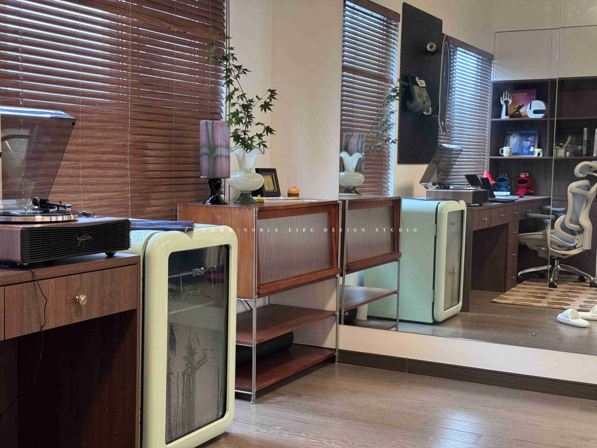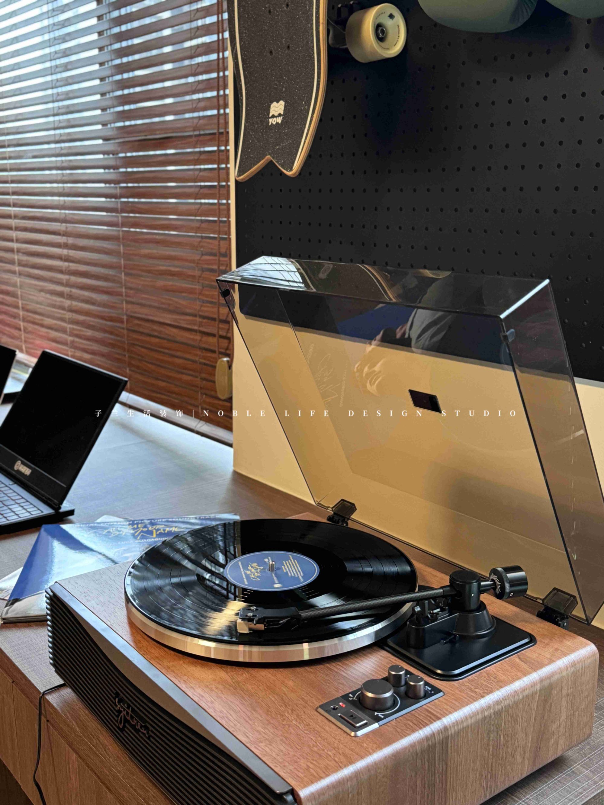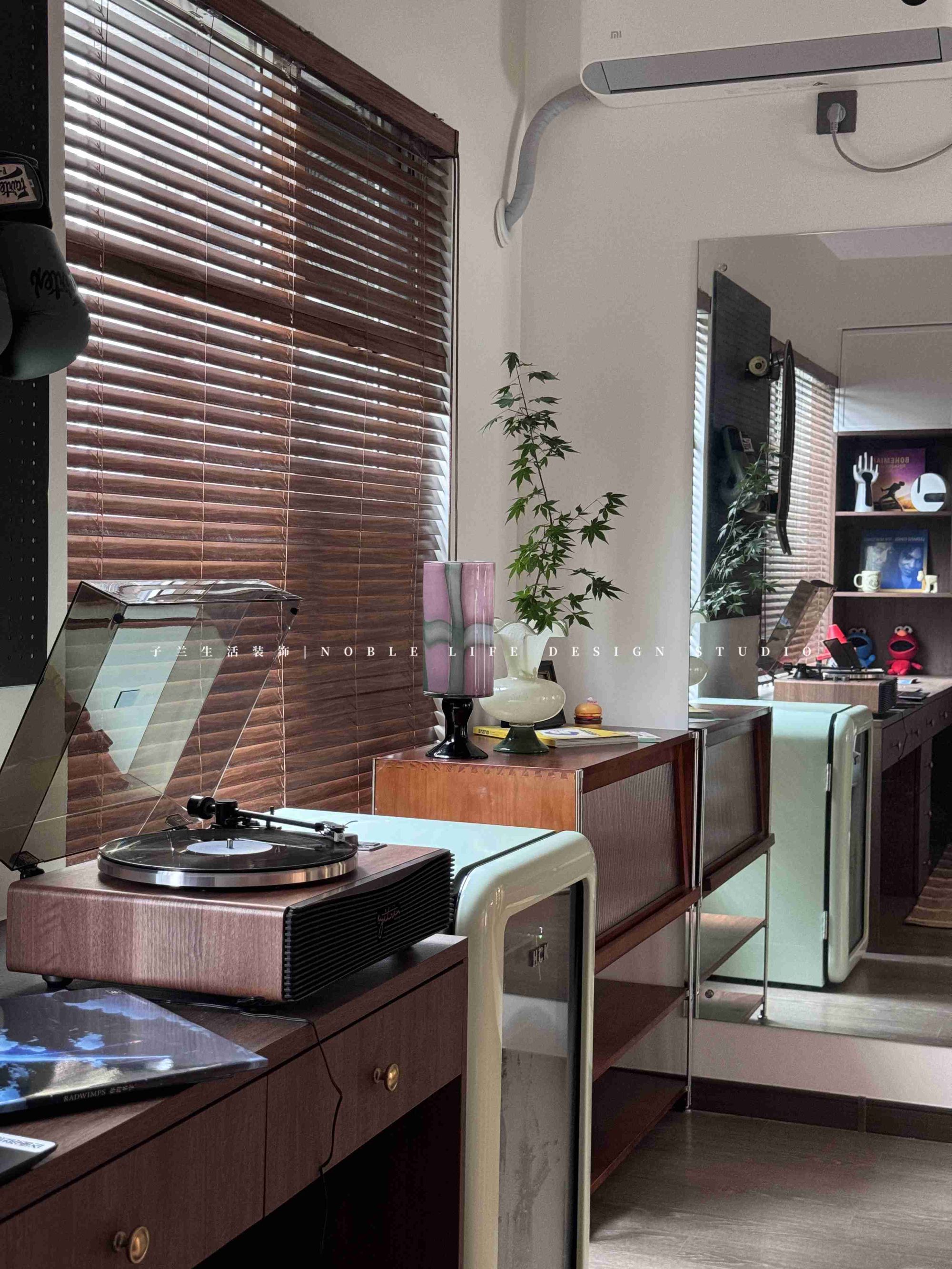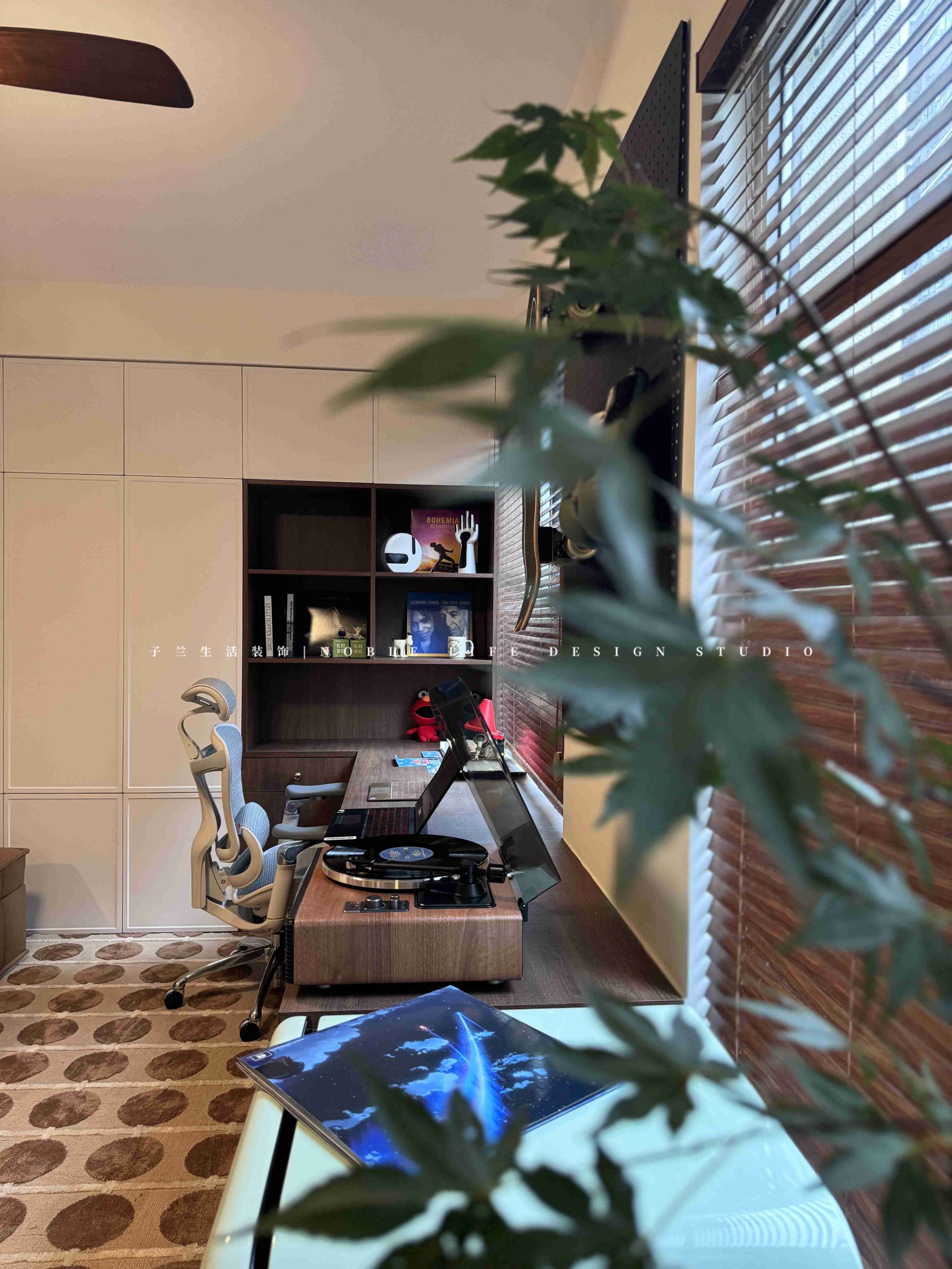 “多功能房是我日常最喜歡待的地方。是我的精神小屋。不工作的時(shí)候,每天都要好好生活,享受閑暇時(shí)光?!?靠窗木質(zhì)長書桌,陽光從百葉窗斑駁灑進(jìn)窗臺(tái),再打開一張唱片,沒有工作的時(shí)候,只有生活的松弛與閑趣。