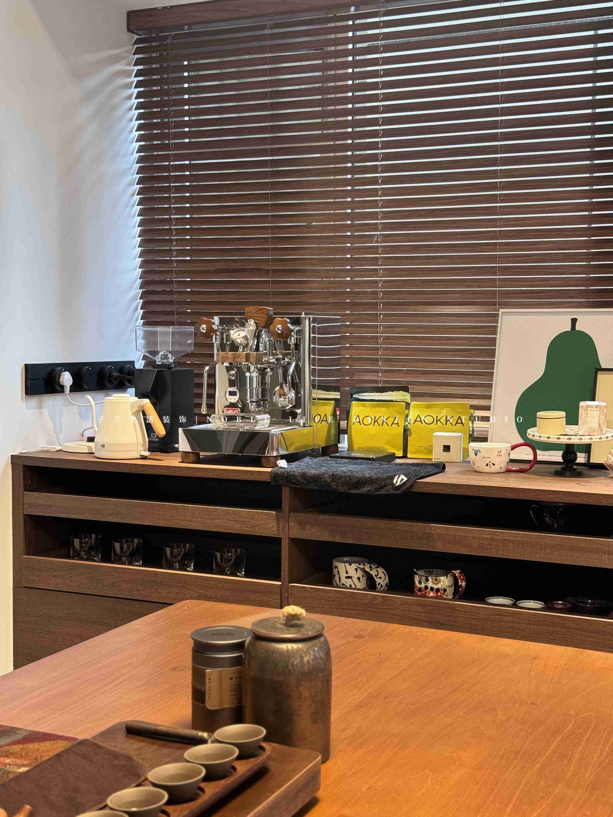 飄窗臺(tái)套上柜子秒變臺(tái)桌,定制設(shè)計(jì)也解決了咖啡愛好者杯子收納問題。多層收納柜體,杯子、咖啡豆、研磨器等分區(qū)收納。還能用擺件裝飾調(diào)劑氛圍??Х葯C(jī)一擺,咖啡館的情調(diào)就上來了。洞洞板往邊墻一掛,手柄模具通通掛起來,美觀舒適又摩登。百葉窗微微拉開,任由陽光肆意闖進(jìn),進(jìn)門就可以看見的咖啡角,誰見了不喜歡。