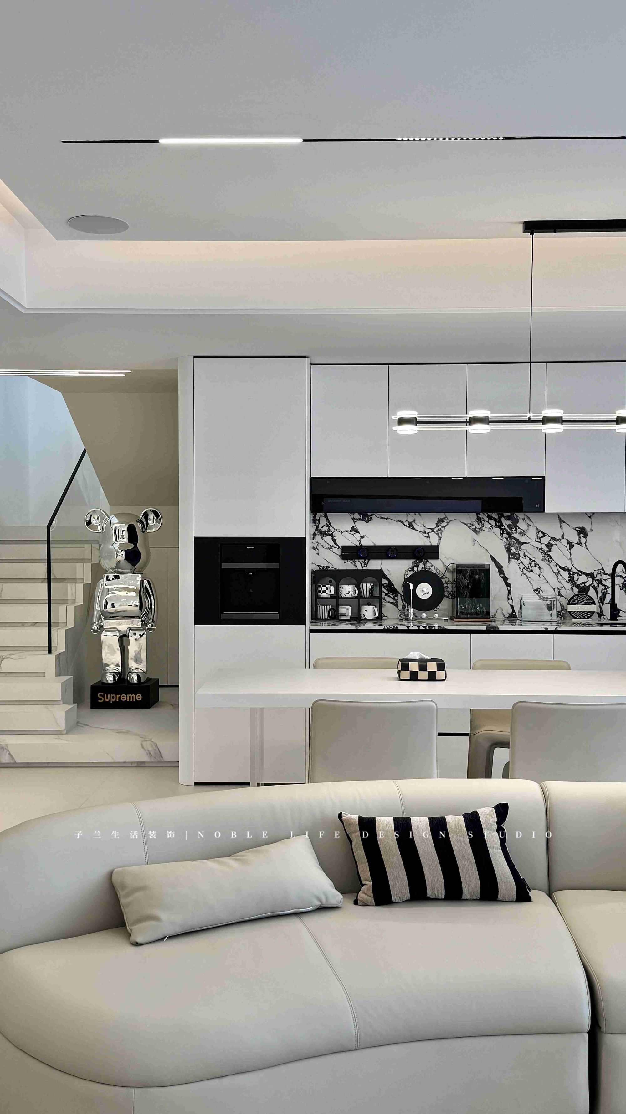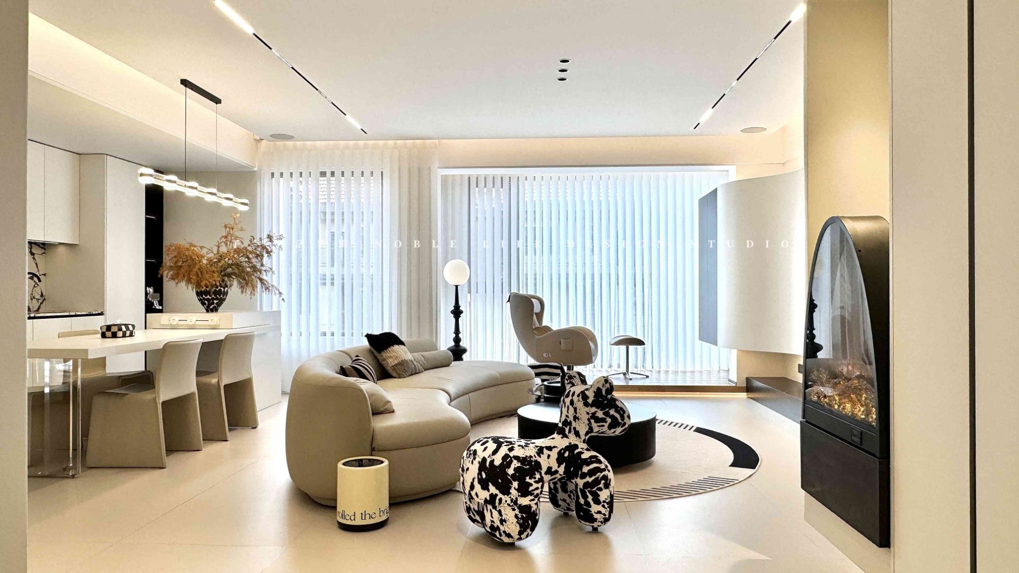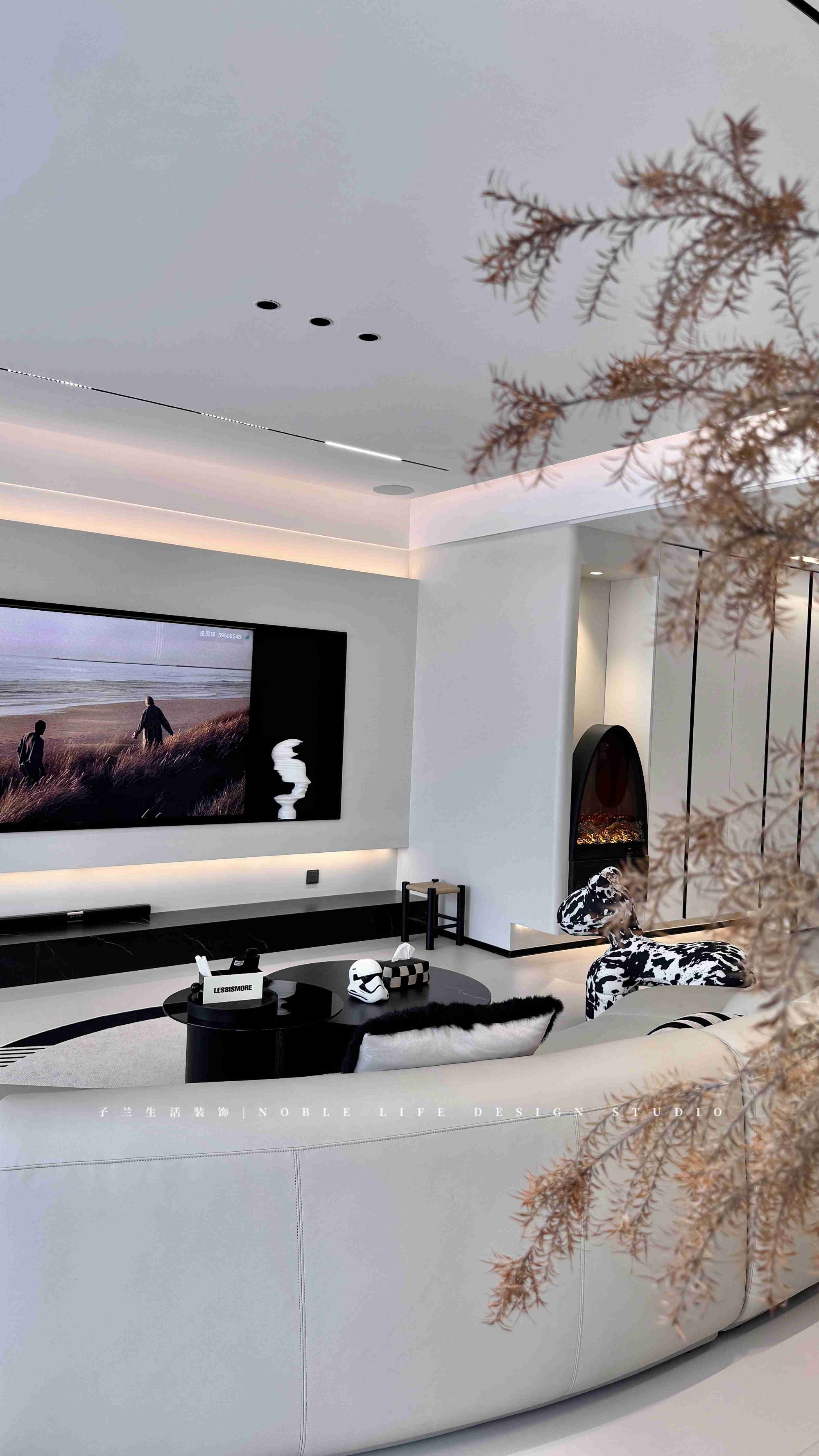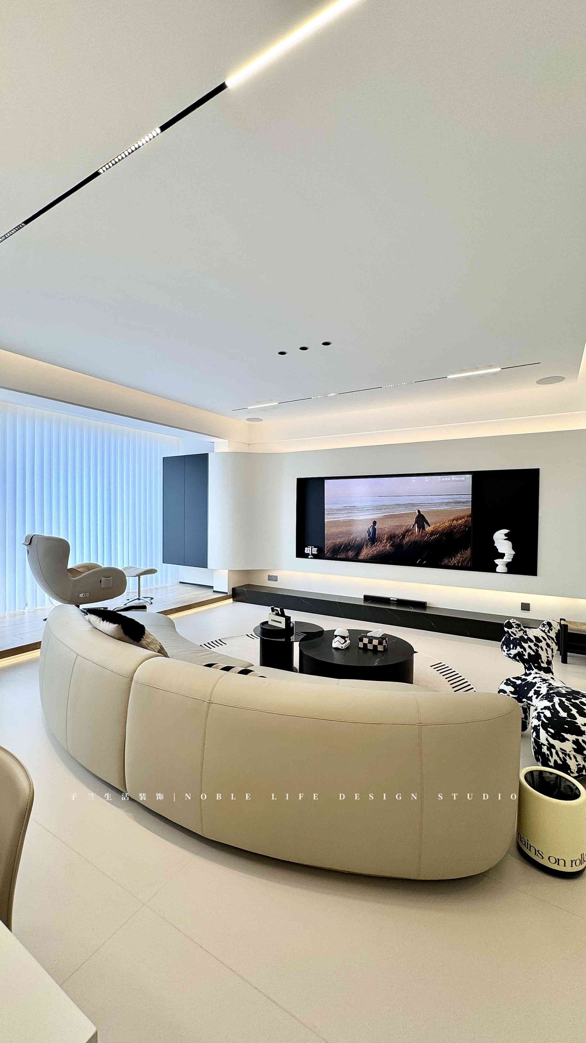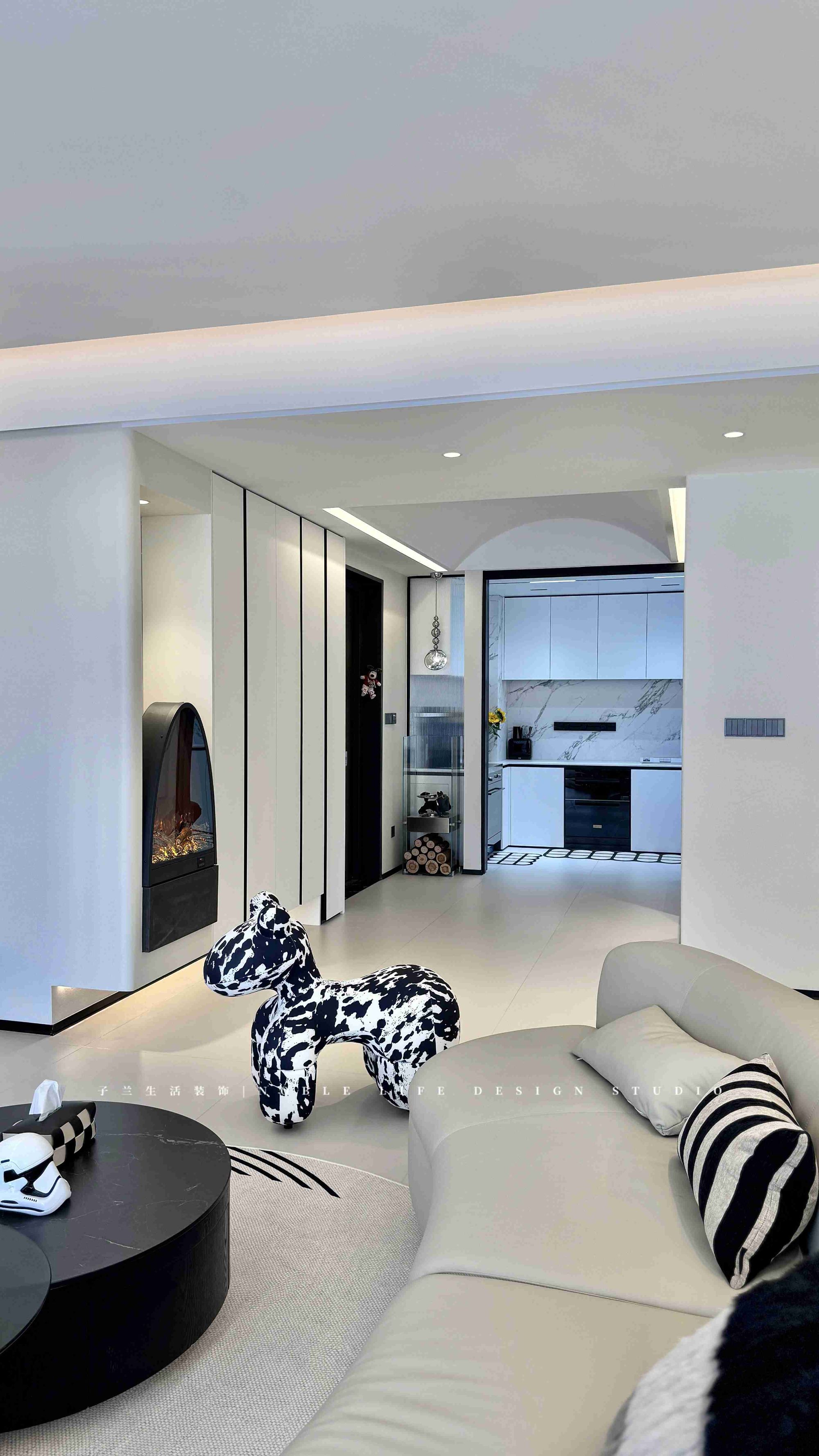 本次實景最大亮點:1、陽臺容易客廳;2、空間打通;3、大弧形吊頂小戶型也能擁有大空間感,客廳與陽臺拉...